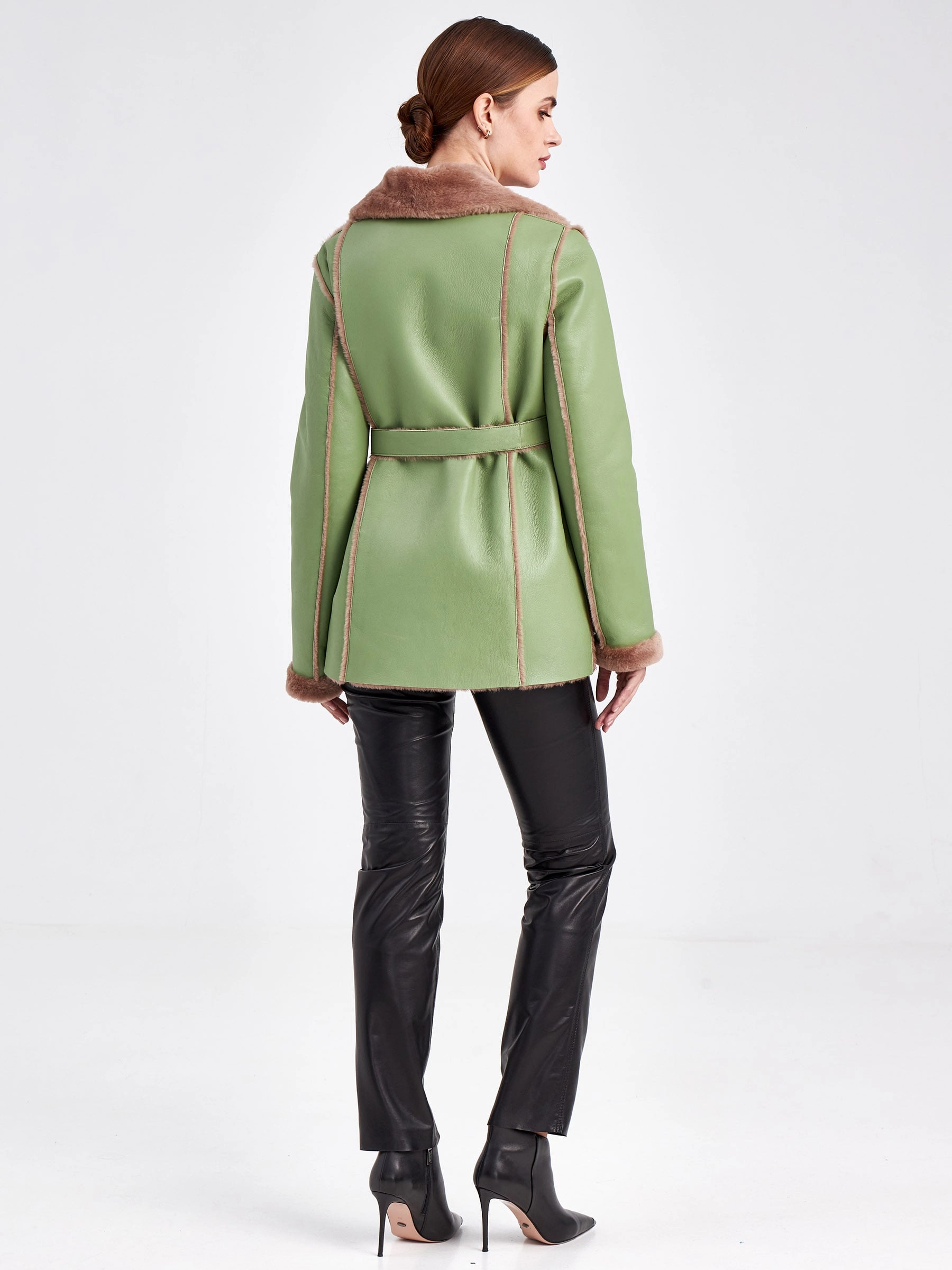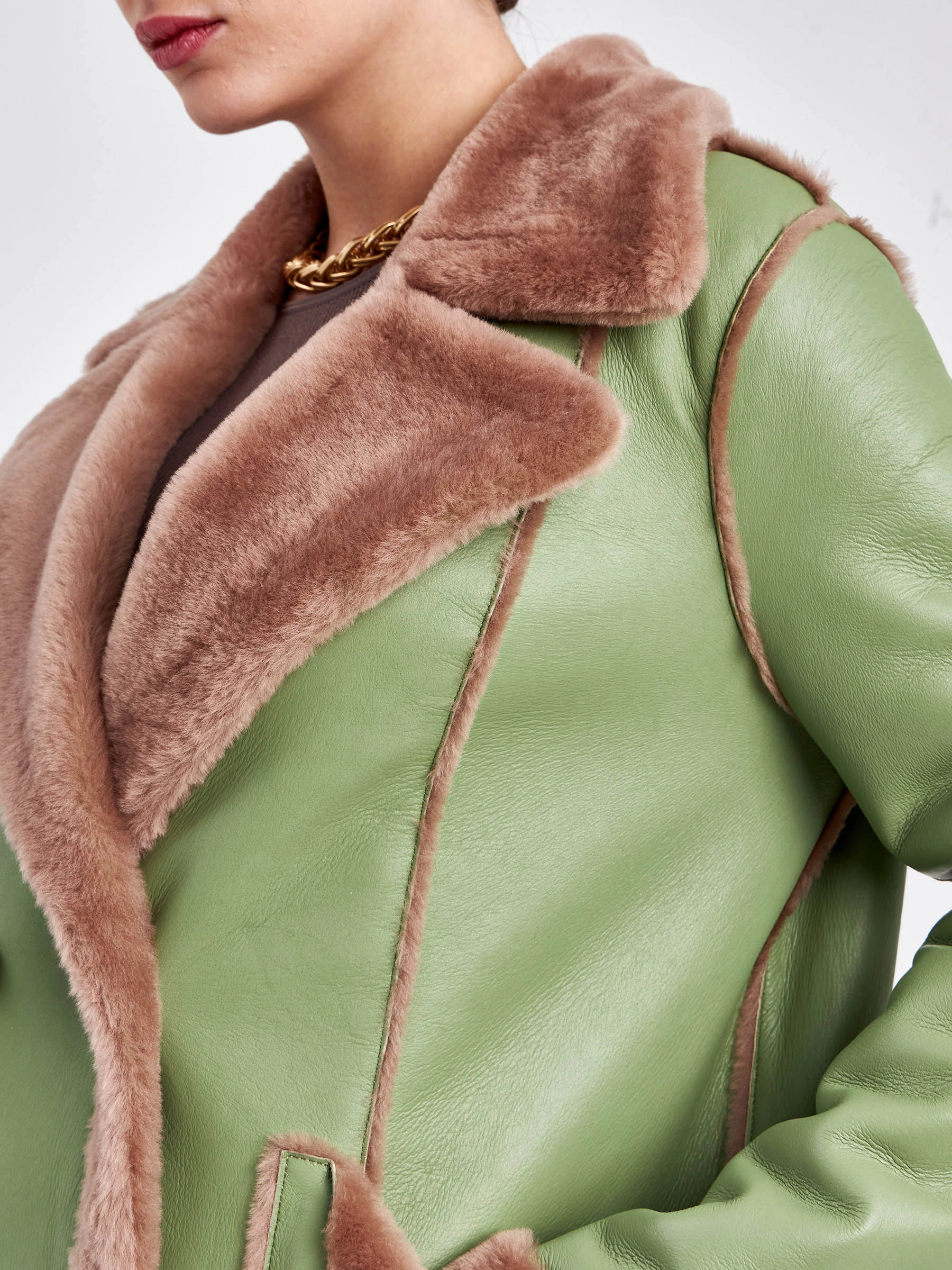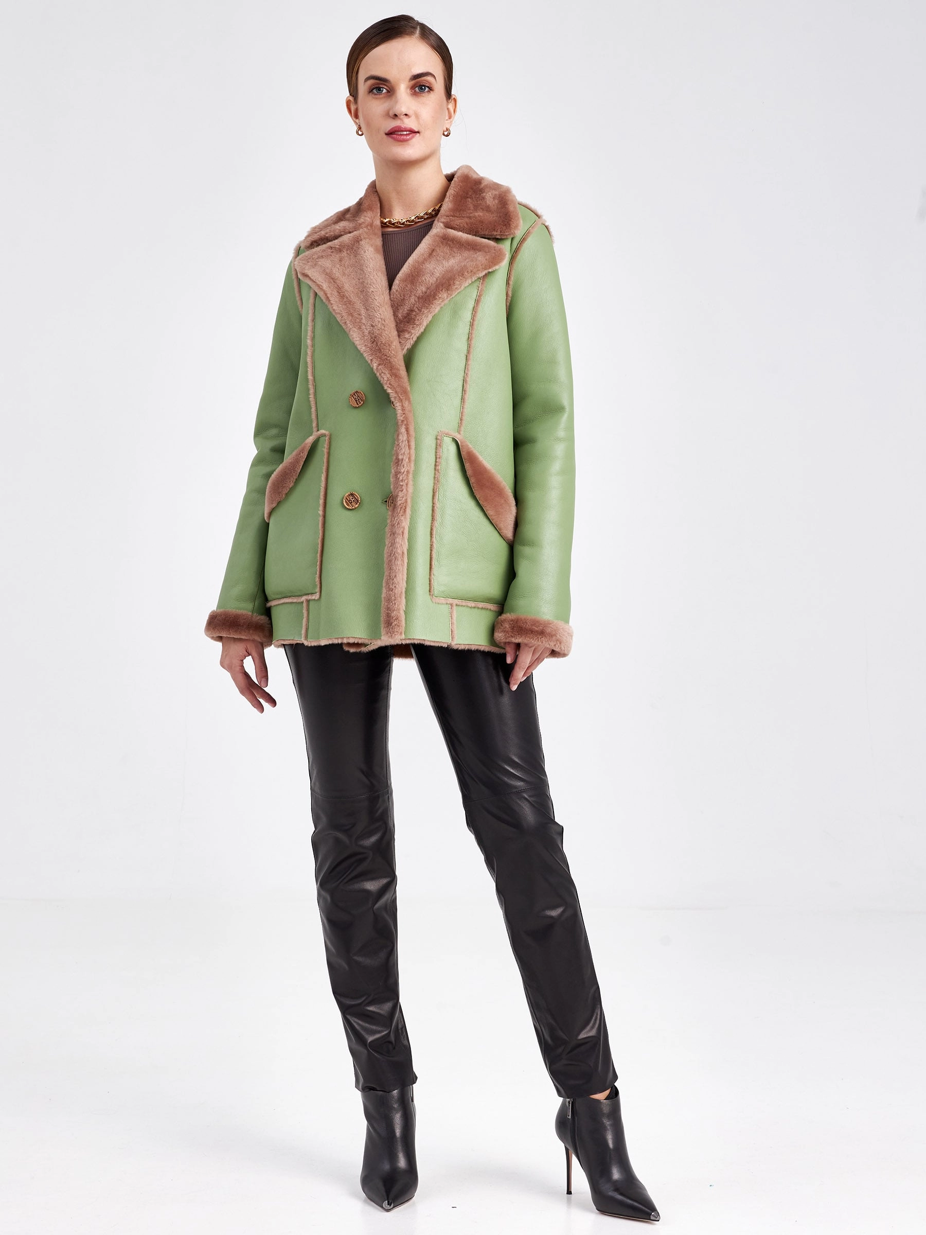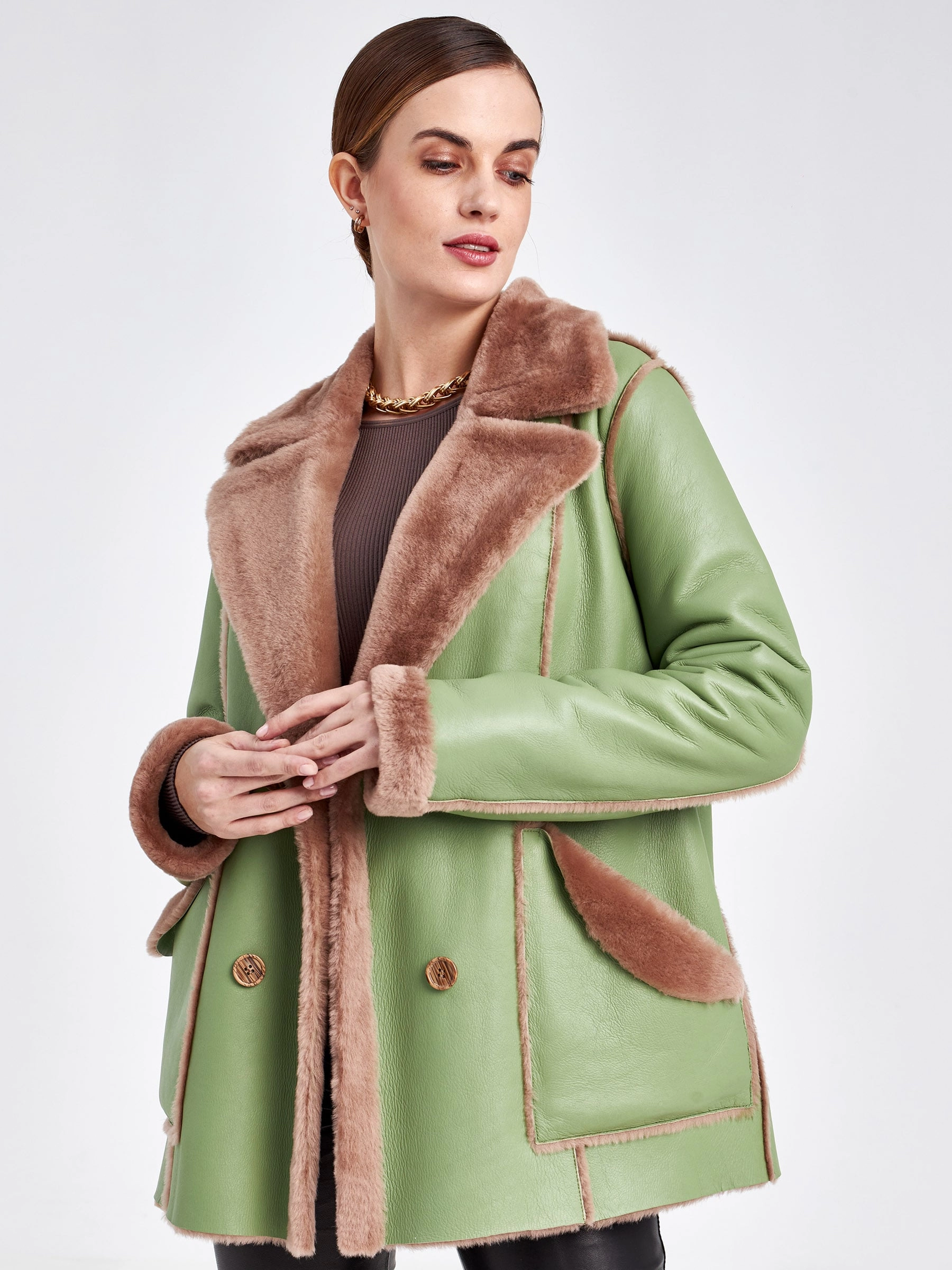 Для создания этой двубортной дублёнки использовали мягкую тонкую овчину, благодаря чему вещь получилась лёгкой и пластичной, а её внутренняя сторона отлично сохраняет тепло. Короткая длина (51-74 см) и прямой силуэт в сочетании с английским воротником создают лаконичный образ, который завершают два больших кармана с меховым отворотом и длинный пояс, подчёркивая безупречное качество и комфортную посадку. Совет стилиста: эта модель, балансирующая между классикой и утилитарным шиком, идеальна для динамичной городской жизни. Сочетайте её с джинсами скинни или прямыми брюками и высокими ботинками, чтобы подчеркнуть бунтарский дух, или наденьте поверх платья с юбкой-карандаш — меховые отвороты на карманах добавят образу игривости. Длинный пояс можно завязать свободным узлом на талии или бедрах, создавая расслабленный силуэт, не перегружая образ.