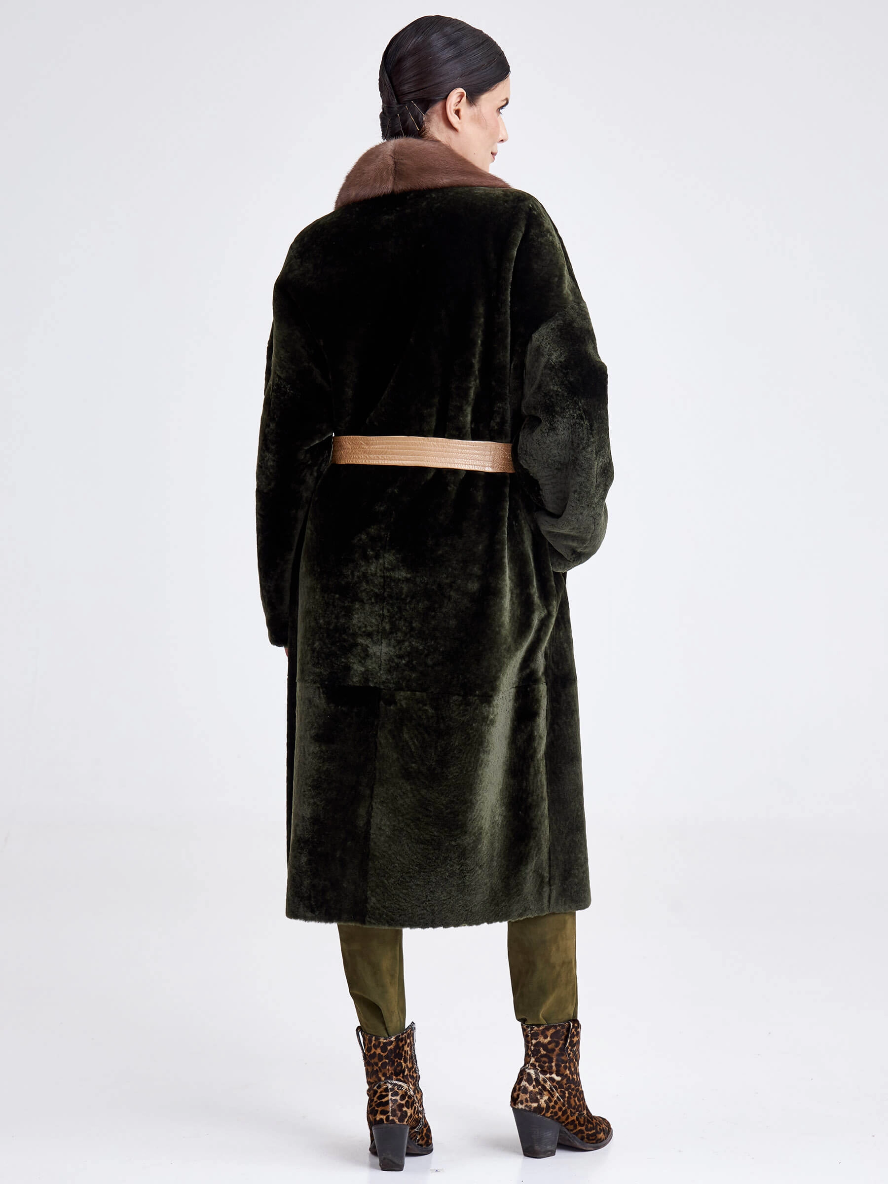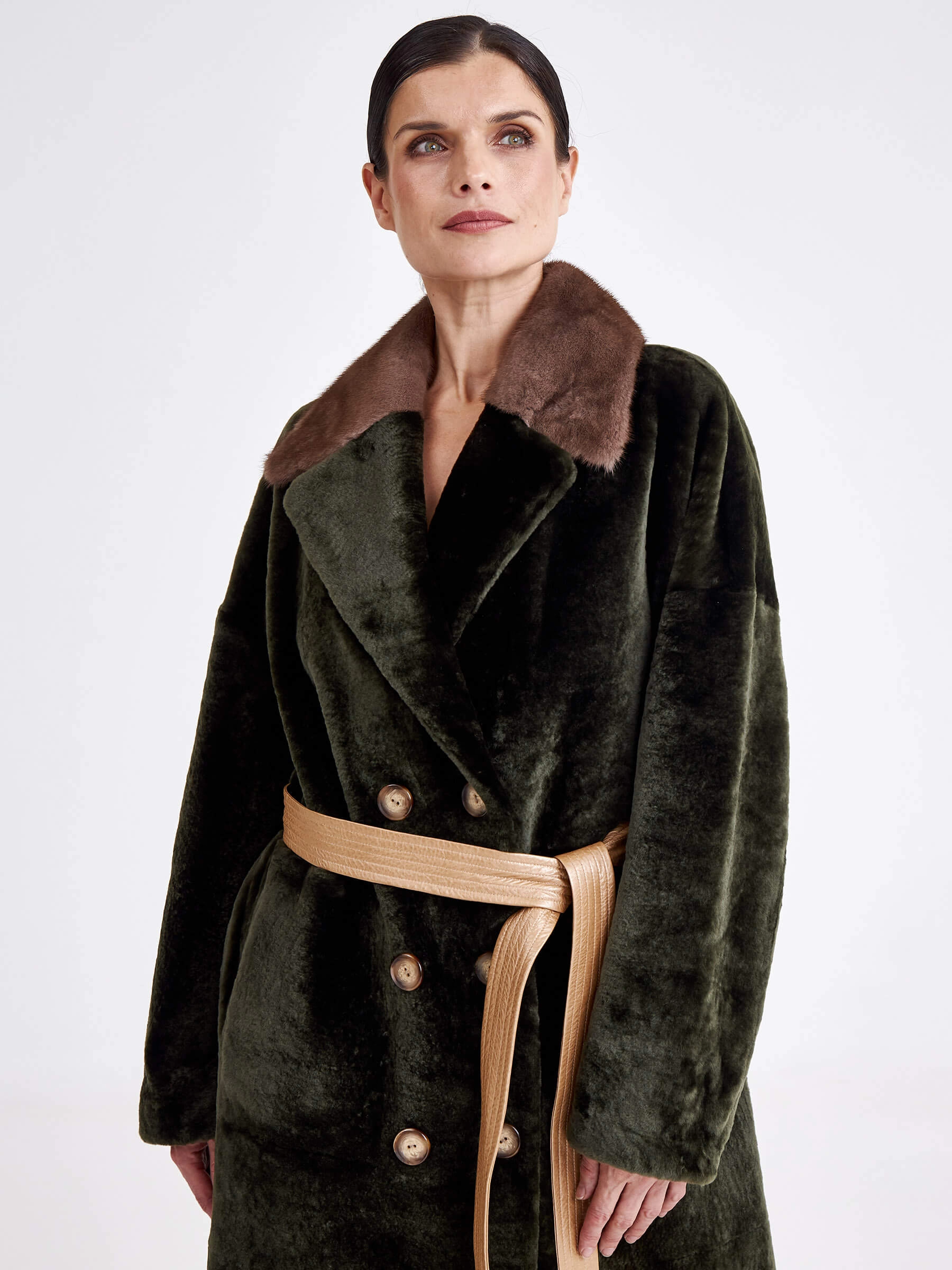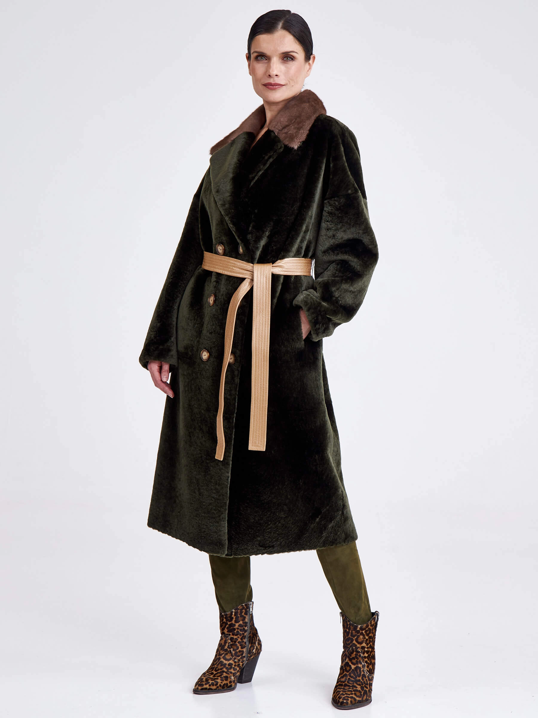 Двубортная двусторонняя дублёнка из овчины «астраган» и меха норки премиум-класса представляет собой превосходный пример актуальной классики. Эта удлинённая модель (свыше 90 см) прямого кроя со спущенными плечами и широкими лацканами сшита из мягкой плотной овчины: одна сторона — гладкая кожа, а другая — тёплый густой мех. Благодаря особой обработке швов изделие легко трансформируется в элегантную шубу. Застёжка на пуговицы, английский воротник из норки и контрастный пояс из натуральной кожи завершают образ, делая эту дублёнку универсальным и роскошным выбором для повседневной носки осенью и зимой. Совет стилиста: носите её как лаконичное пальто с джинсами скинни и грубыми ботинками для дерзкого образа в стиле кэжуал или превратите в шубу и наденьте поверх вечернего платья, добавив лоска любому выходу.