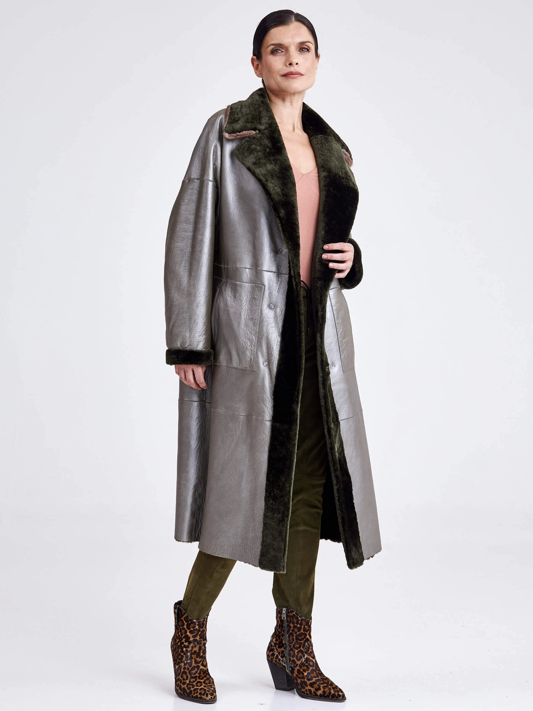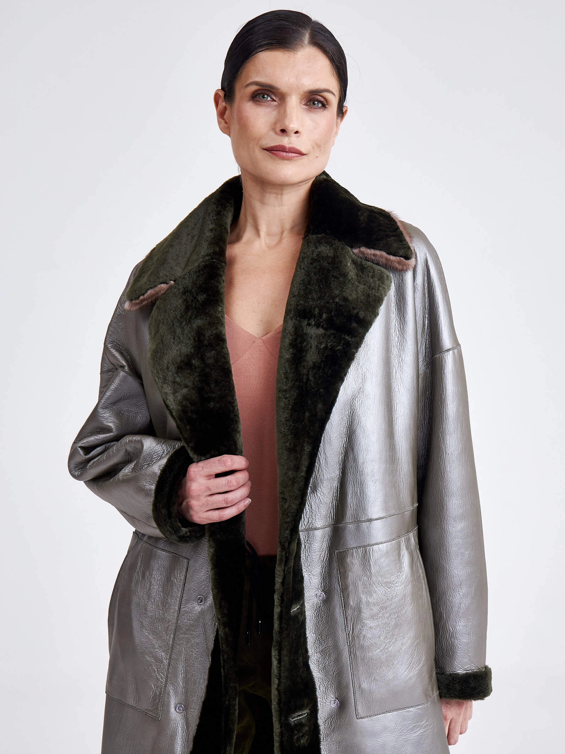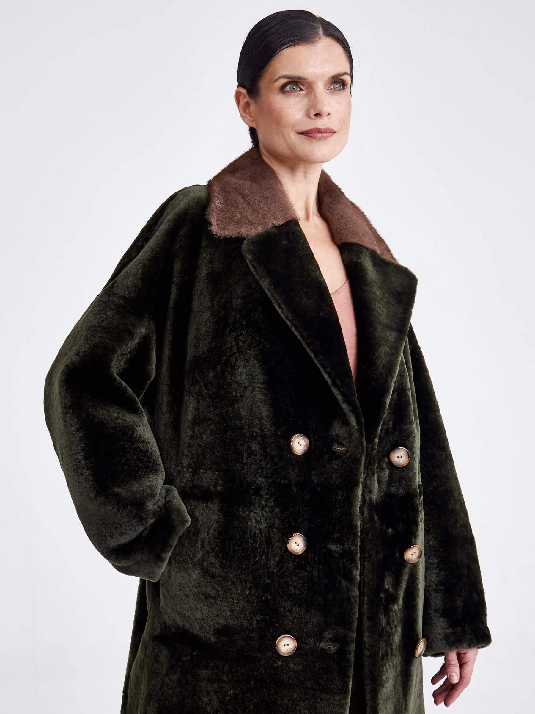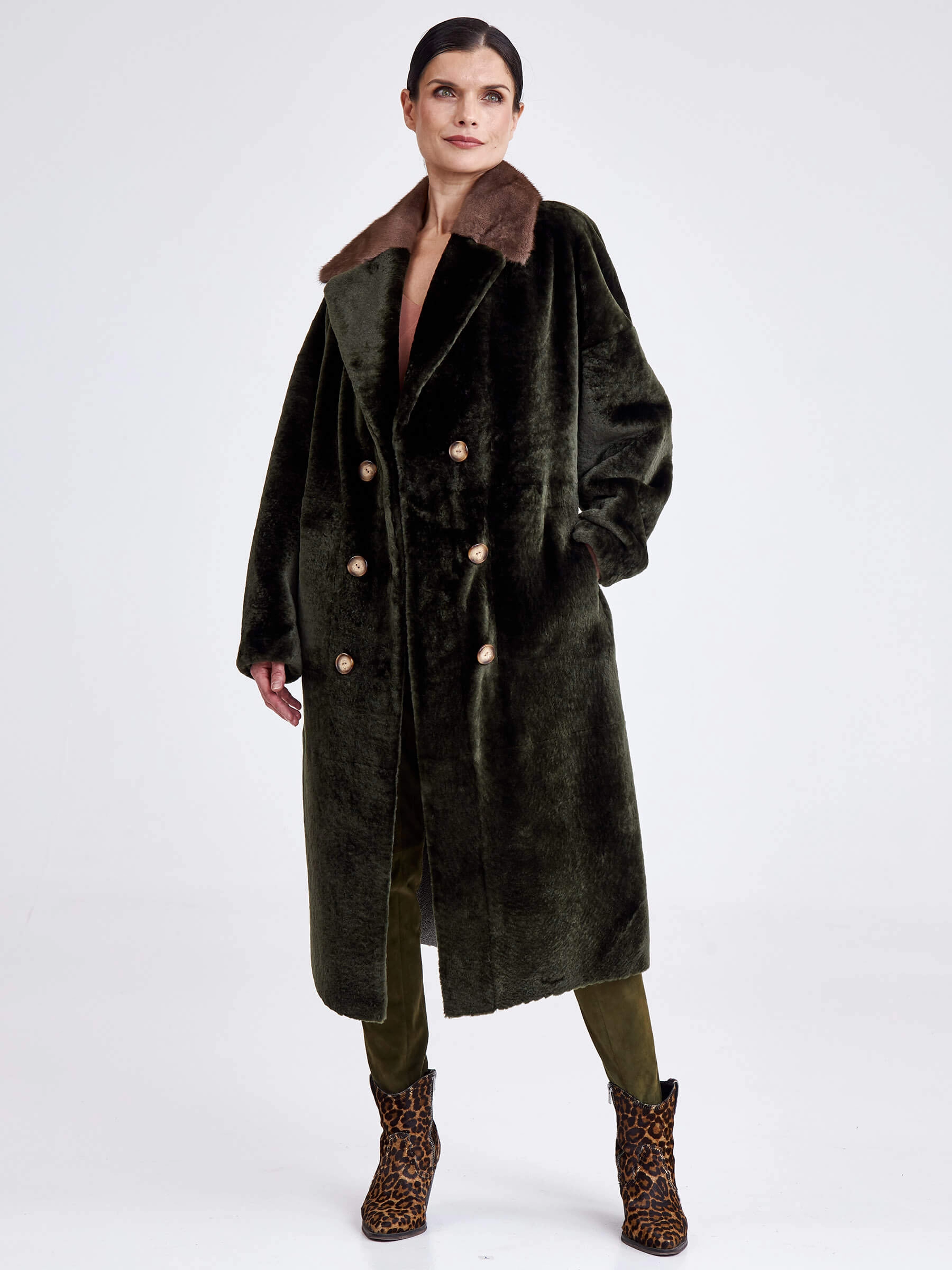 Двубортная двусторонняя дублёнка из овчины «астраган» и меха норки премиум-класса представляет собой превосходный пример актуальной классики. Эта удлинённая модель (свыше 90 см) прямого кроя со спущенными плечами и широкими лацканами сшита из мягкой плотной овчины: одна сторона — гладкая кожа, а другая — тёплый густой мех. Благодаря особой обработке швов изделие легко трансформируется в элегантную шубу. Застёжка на пуговицы, английский воротник из норки и контрастный пояс из натуральной кожи завершают образ, делая эту дублёнку универсальным и роскошным выбором для повседневной носки осенью и зимой. Совет стилиста: носите её как лаконичное пальто с джинсами скинни и грубыми ботинками для дерзкого образа в стиле кэжуал или превратите в шубу и наденьте поверх вечернего платья, добавив лоска любому выходу.