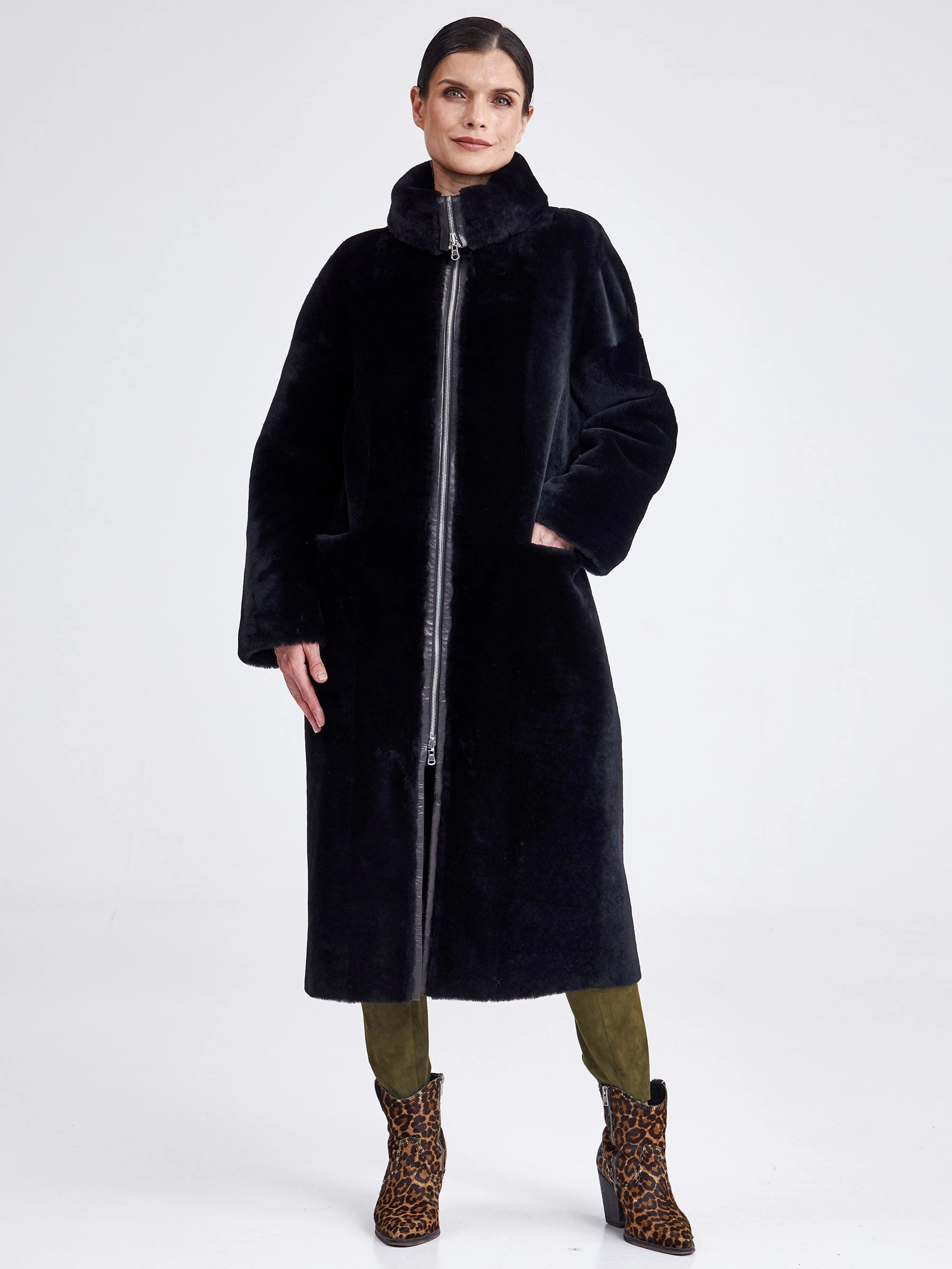 Удлинённая двусторонняя дублёнка из овчины «астраган» (длиной свыше 90 см) — идеальный выбор для повседневной носки в холодное время года. Она выполнена из мягкой и плотной овчины, где гладкая внешняя сторона устойчива к непогоде, а внутренняя меховая — отлично сохраняет тепло без дополнительной подкладки. Модель с прямым силуэтом и спущенной линией плеч застёгивается на надёжную двухзамковую молнию и дополнена высоким воротником-стойкой, который можно носить отложным. Широкий кожаный пояс позволяет менять силуэт, подчёркивая талию. Идеальная посадка и отсутствие капюшона делают эту дублёнку универсальной основой для создания стильных осенне-зимних образов. Совет стилиста: наденьте её поверх тонкого водолазного платья и ботфортов для элегантного выходного лука или создайте современный casual-образ, сочетая с объёмным худи, узкими джинсами и кроссовками, добавив пояс для акцента на талии.