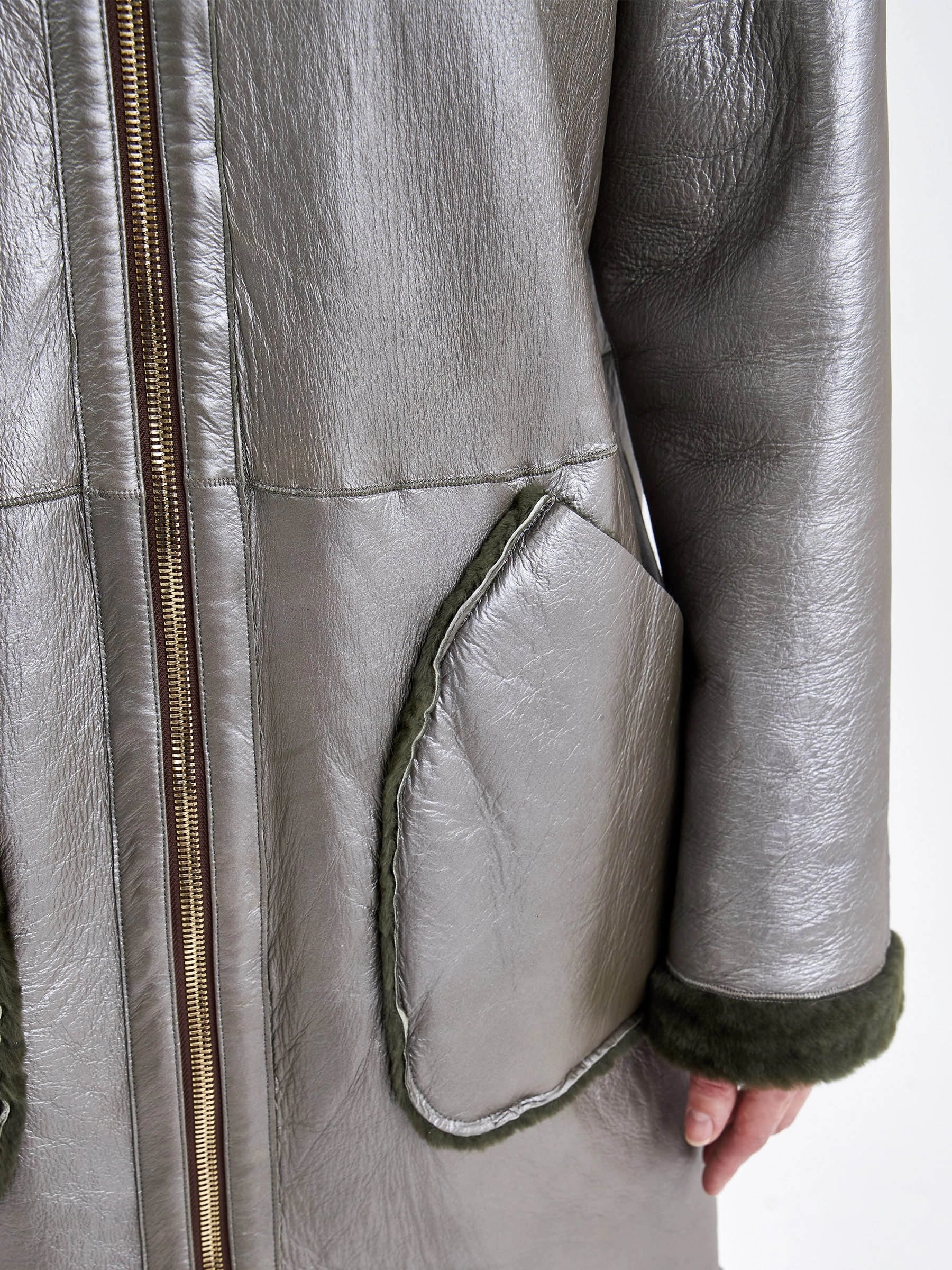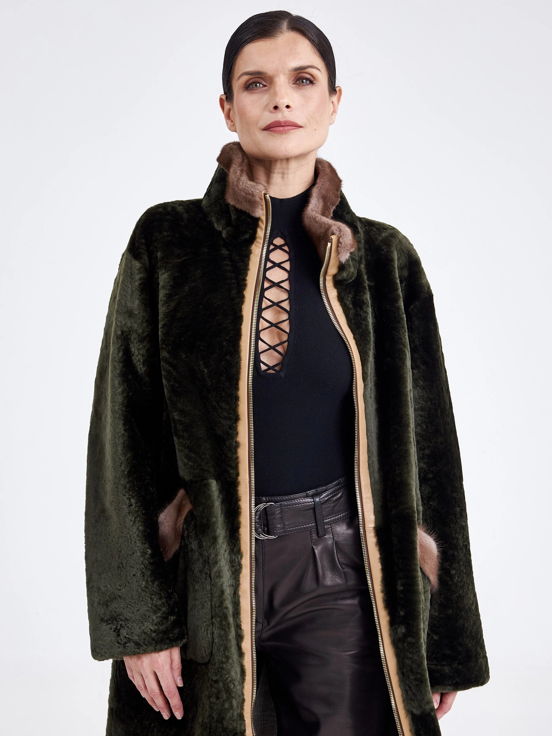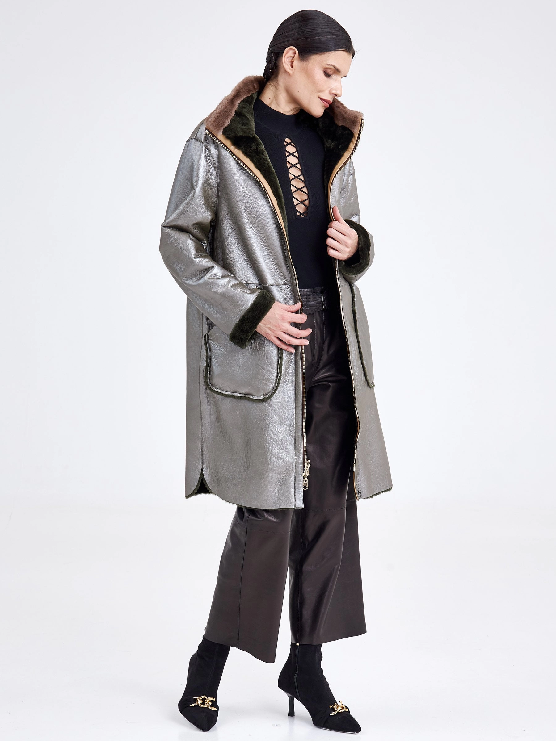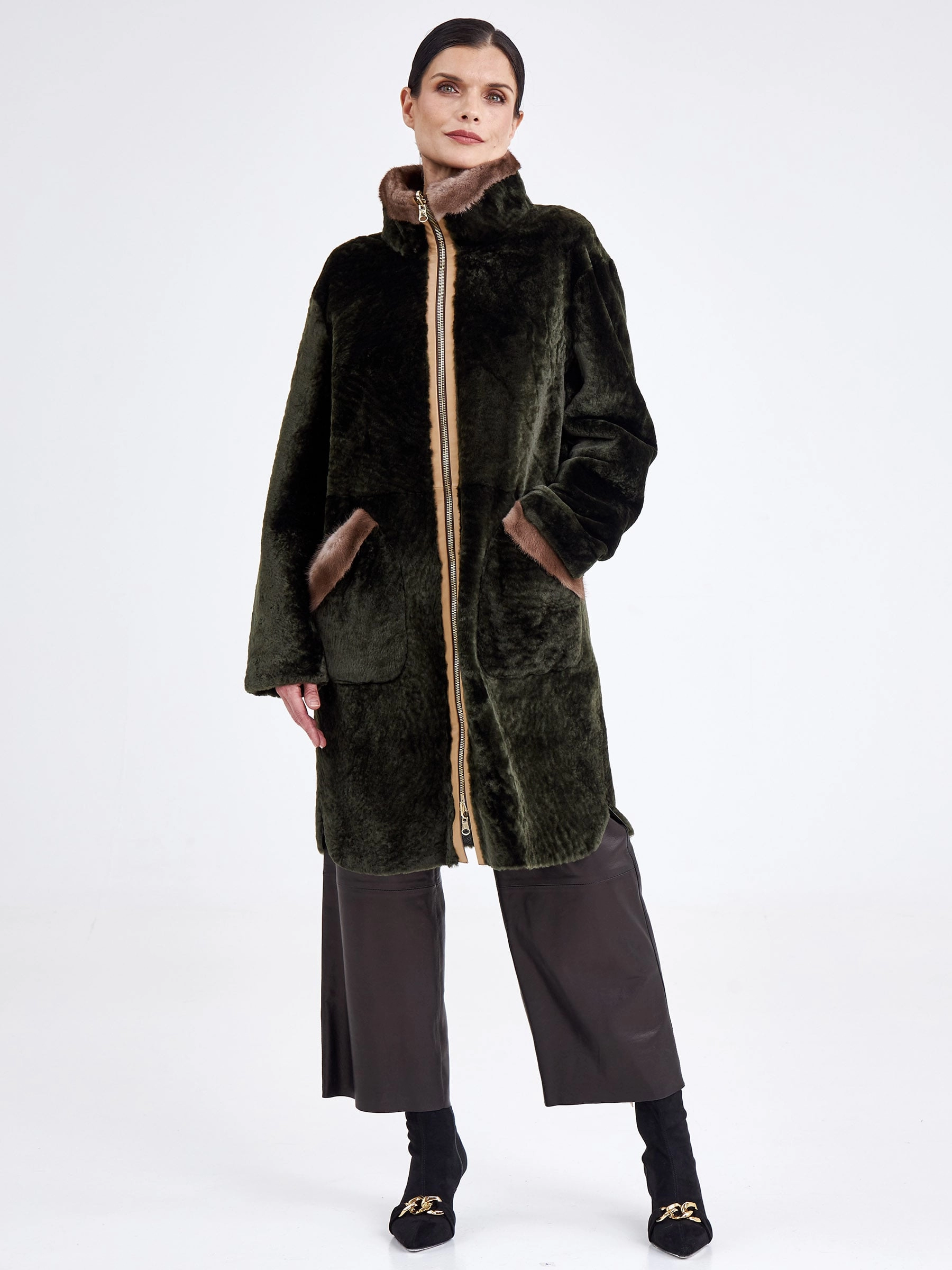 Женская двусторонняя дублёнка из овчины «астраган» с мехом норки премиум-класса — это идеальный сплав стиля и практичности. Модель создана для тех, кто ценит комфорт и функциональность. Удлинённый (свыше 90 см) прямой крой со спущенными плечами обеспечивает расслабленную посадку и универсальность. Изделие выполнено из нежной стриженой овчины: с одной стороны — гладкая кожа, с другой — плотный тёплый мех. Благодаря особой обработке швов дублёнку можно легко трансформировать в элегантную шубу. Модель застёгивается на двухзамковую молнию и дополнена высоким воротником-стойкой из густой норки для дополнительной защиты от холода. Декоративные элементы — кожаный кант и меховая отделка на больших накладных карманах — подчёркивают аккуратный дизайн. Это идеальный вариант для повседневной носки в холодное время года. Совет стилиста: наденьте её как дублёнку с прямыми джинсами и высокими сапогами для стильного городского лука или трансформируйте в шубу и дополните платьем-миди и лакированными лодочками для элегантного