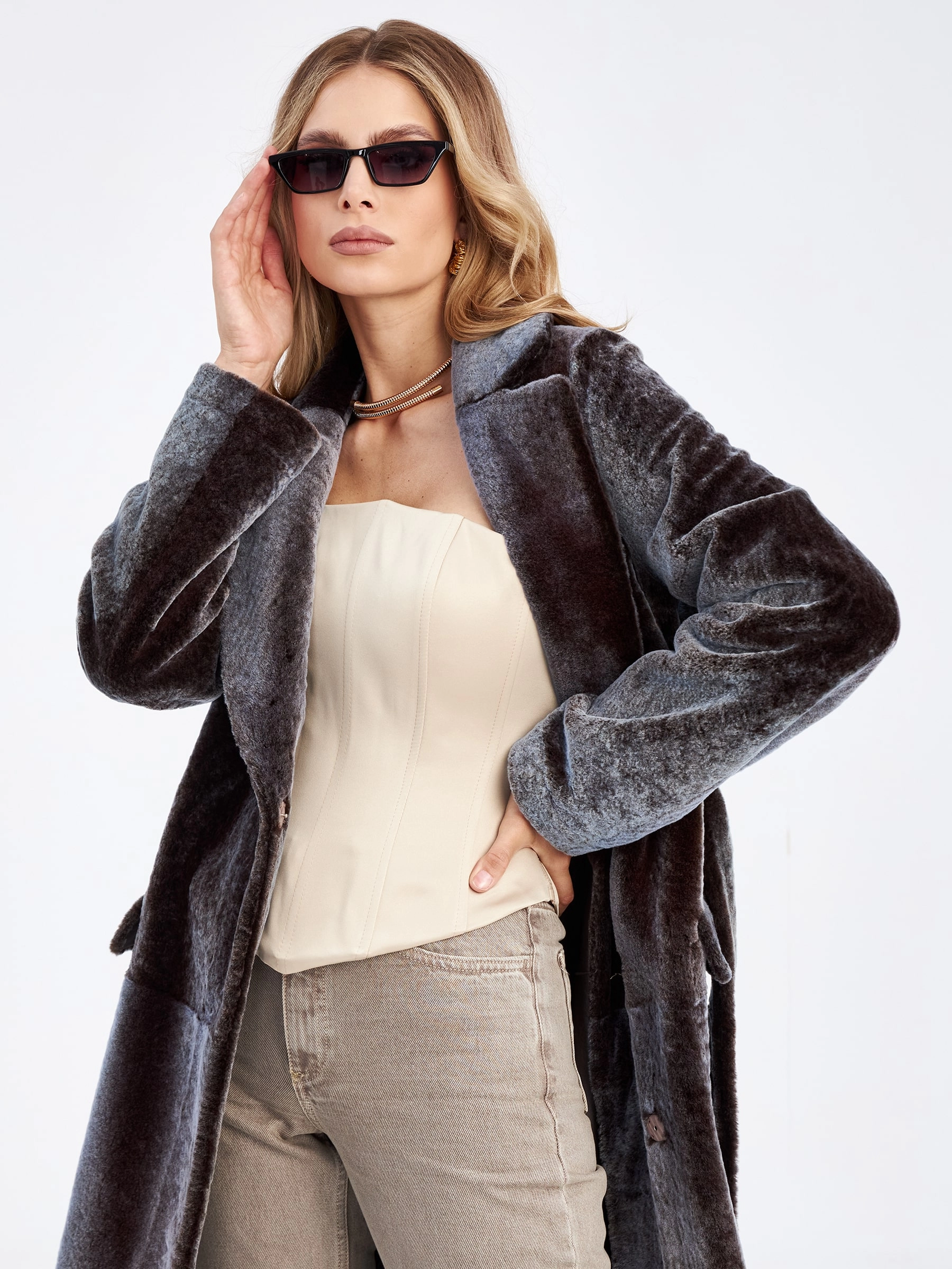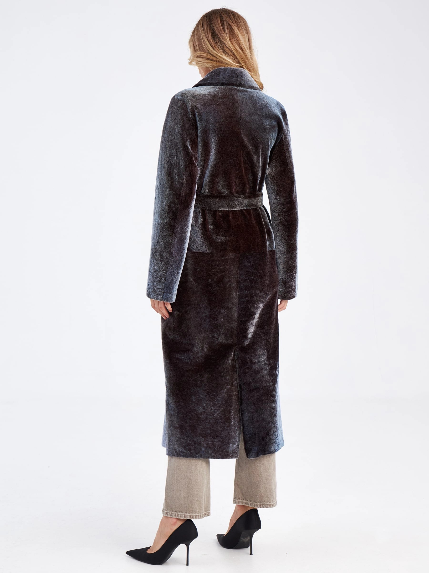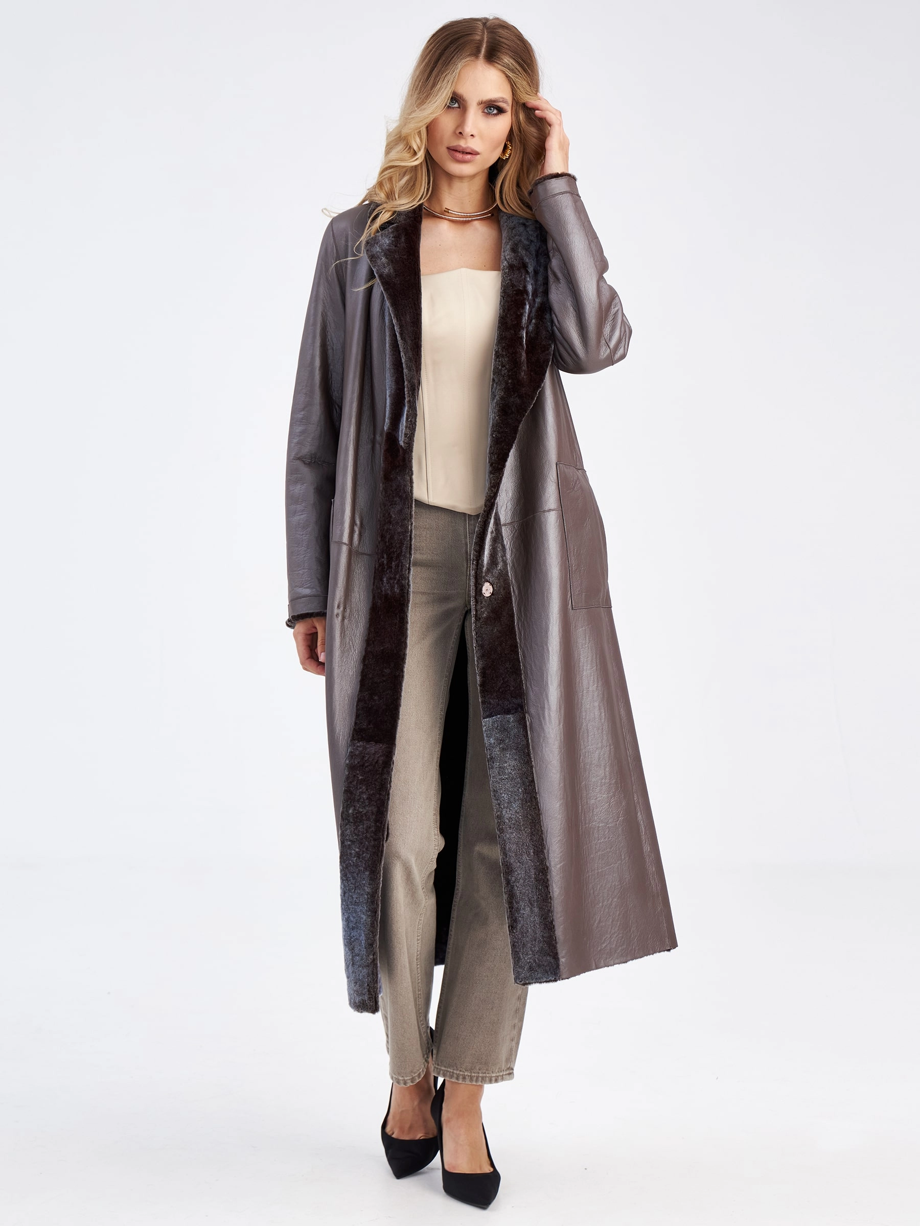 Эта длинная двухсторонняя дубленка станет настоящей находкой для любительниц, которые привыкли ценить классику и комфорт. Для пошива модели, выбрали мягкую овчину-астраган в цвете баклажан, с гладкой внутренней стороной серого оттенка. Изделие не уступает в сдержаности и лаконичности любому пальто. Прямой крой не сковывает движения, английский воротник добавит элегантности. Длинный пояс формирует приталенный силуэт.