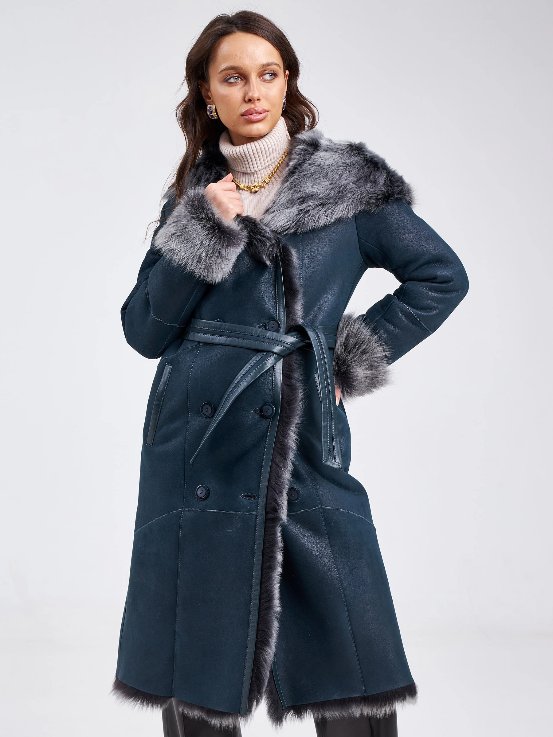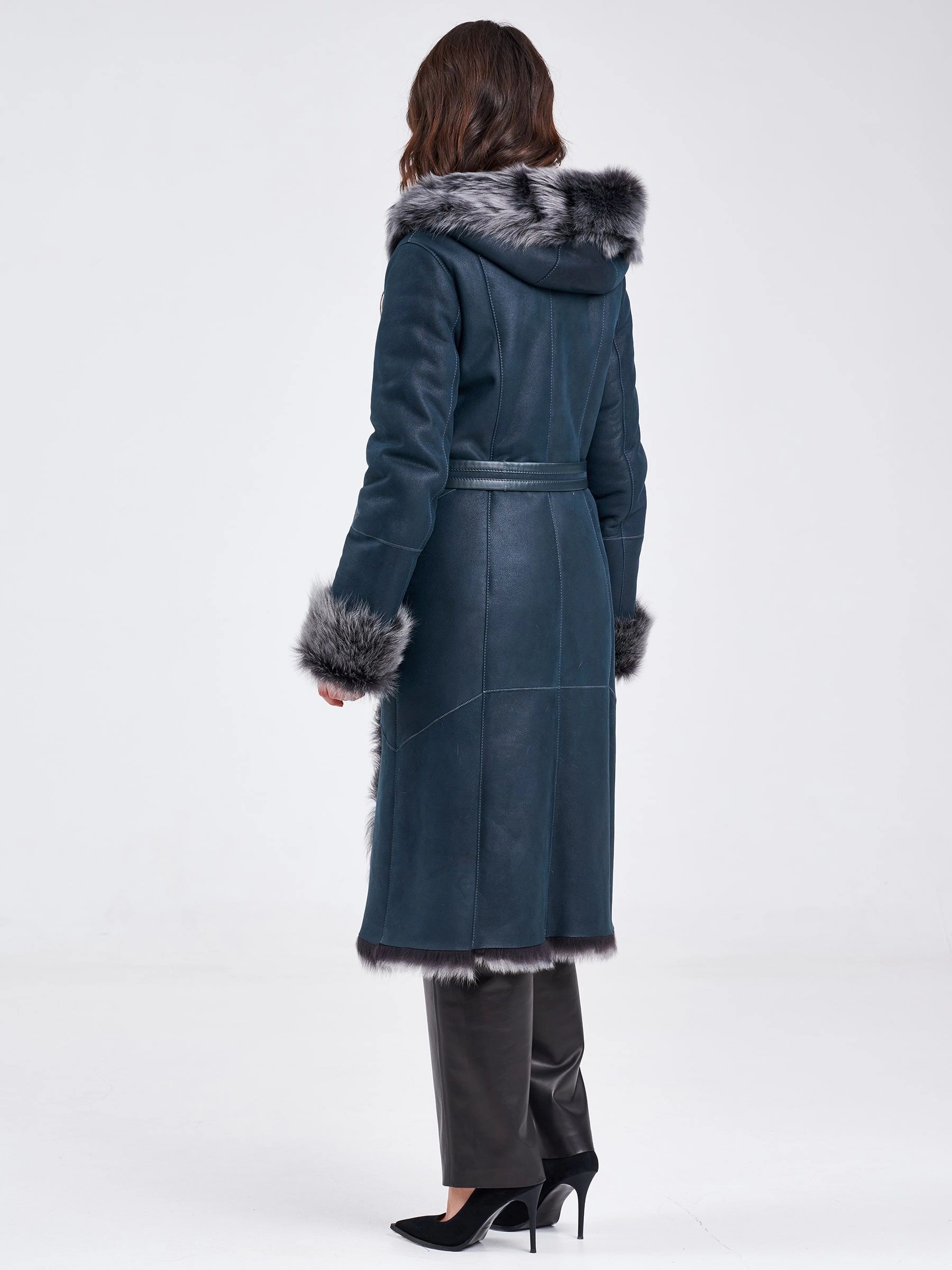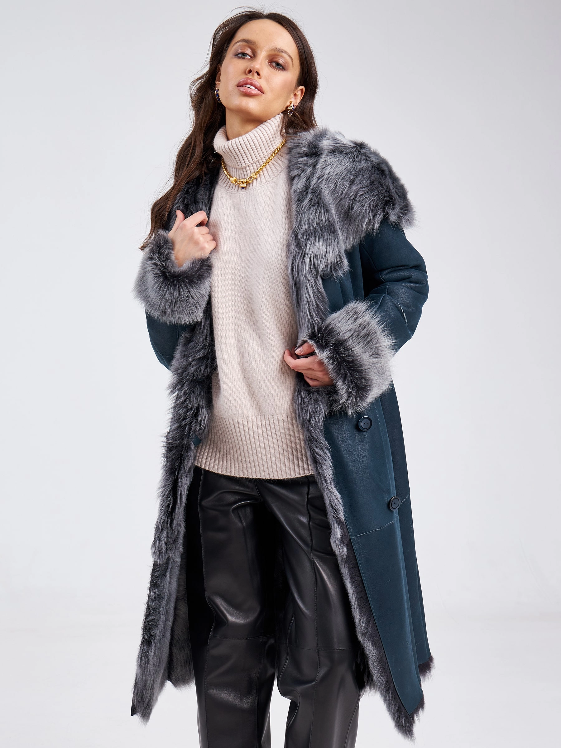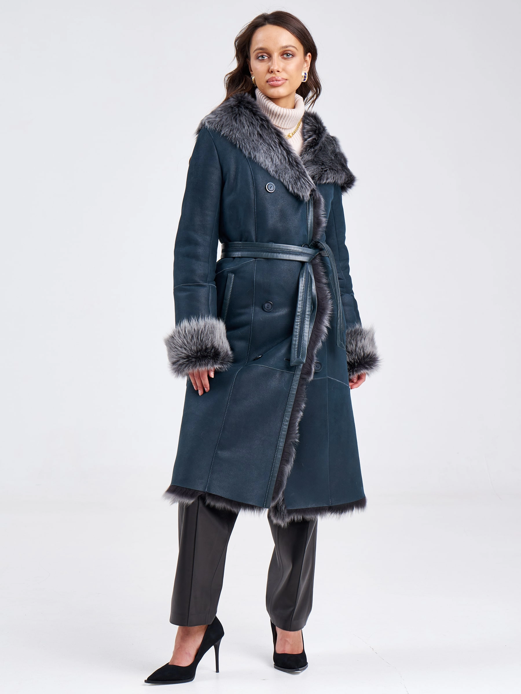 Товар двубортная женская дубленка из тосканы с капюшоном премиум класса 134, синяя, размер 44, артикул 62850 выполнен из овчина "тоскана" с застежкой пуговицы. Рассчитан на сезон: осень-зима. Длина изделия 110 см, силуэт полуприлегающий.