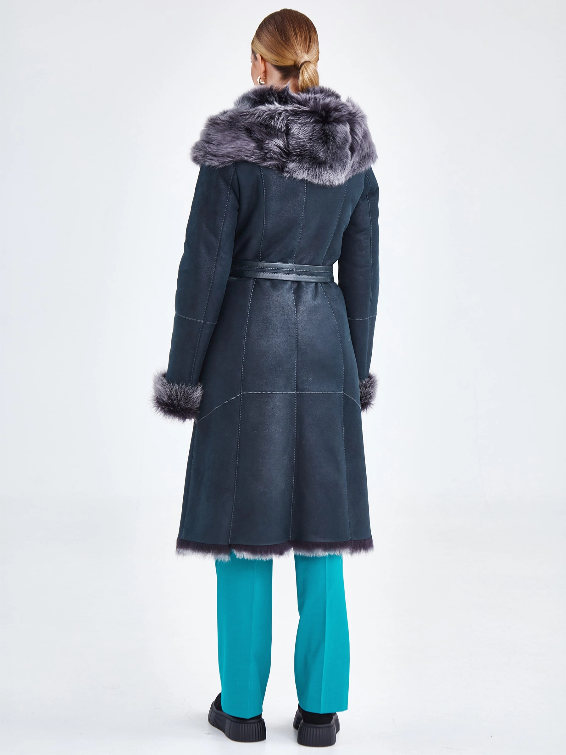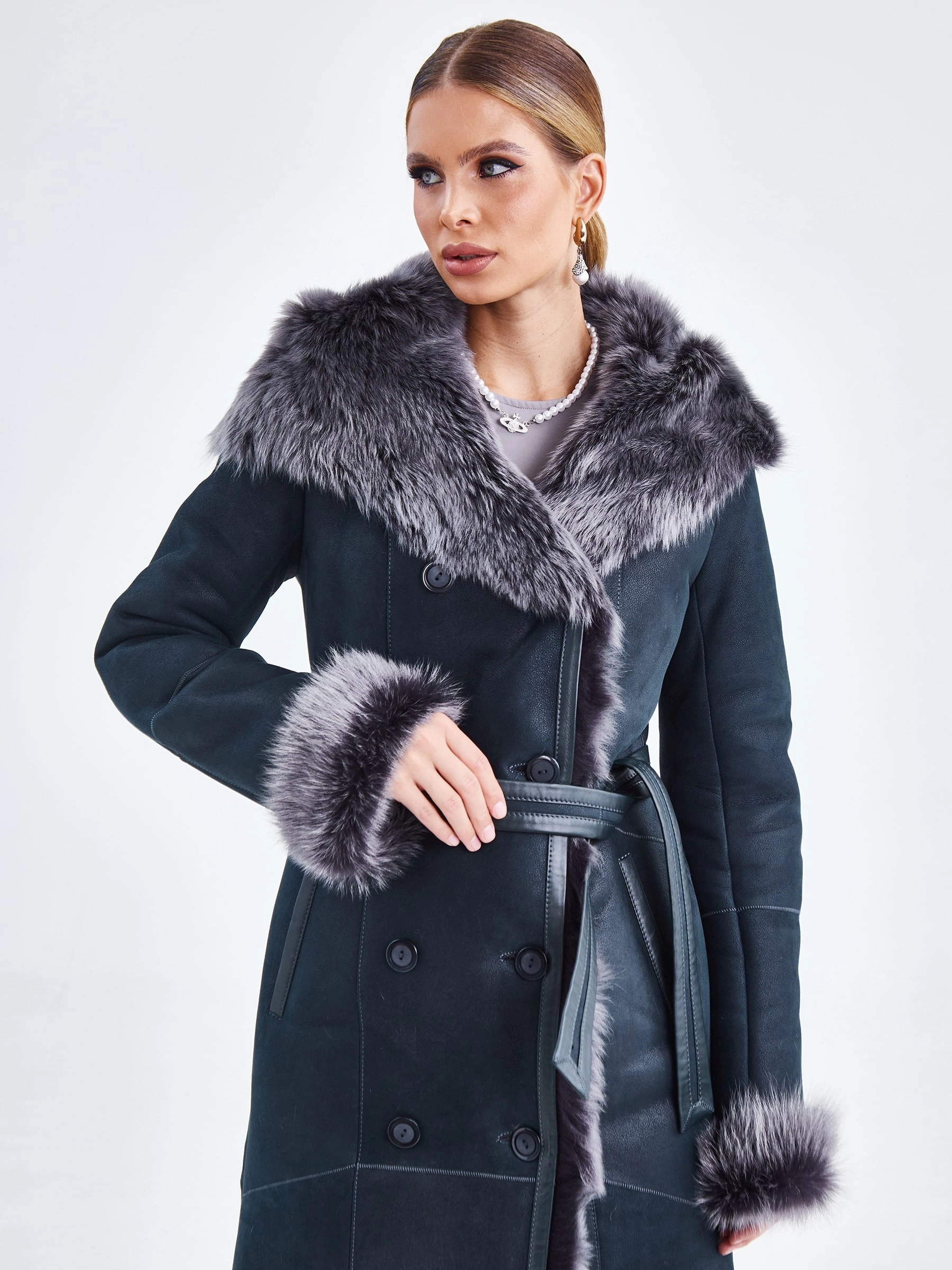 Теплая двубортная дубленка из нежнейшей тосканской овчины. Полуприлегающий силуэт классической длины. Объемный капюшон защитит от капризной погоды, а длинный пояс-лента элегантно подчеркнет талию.