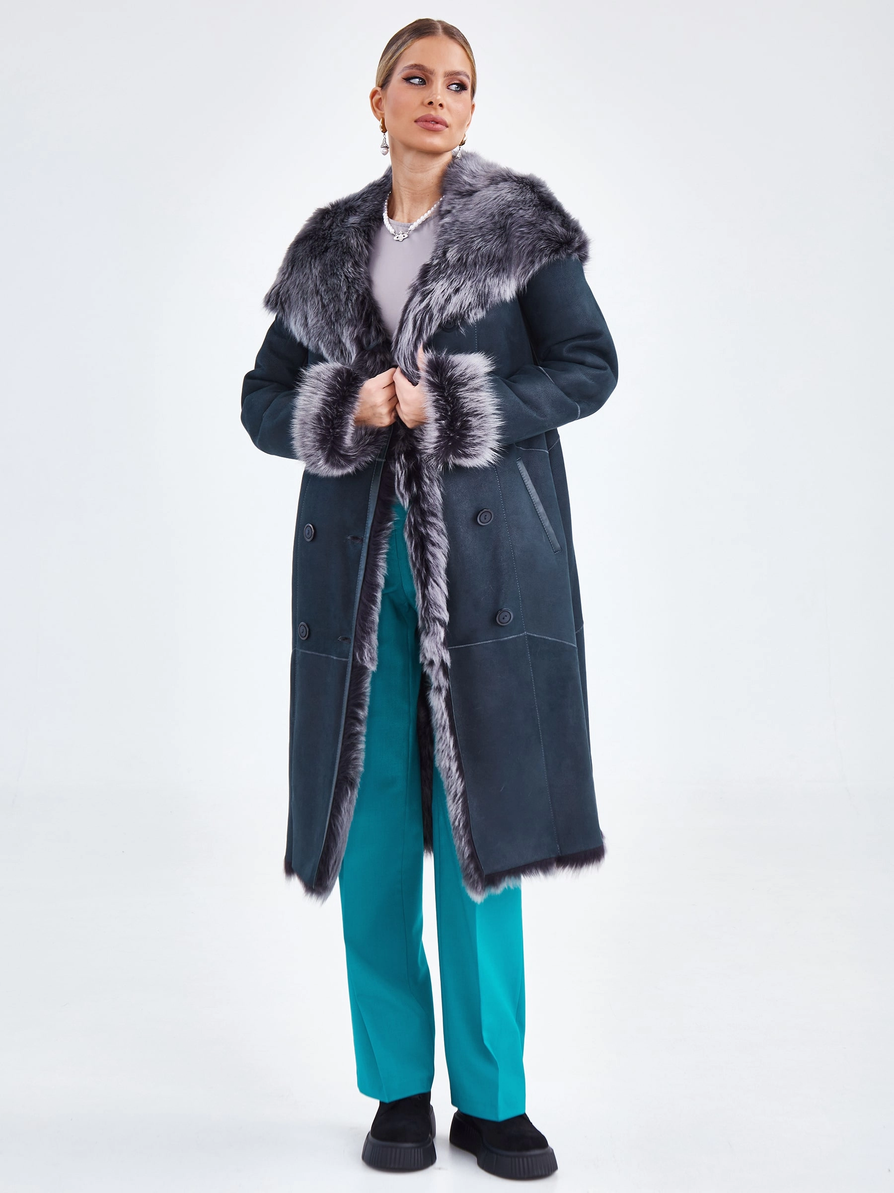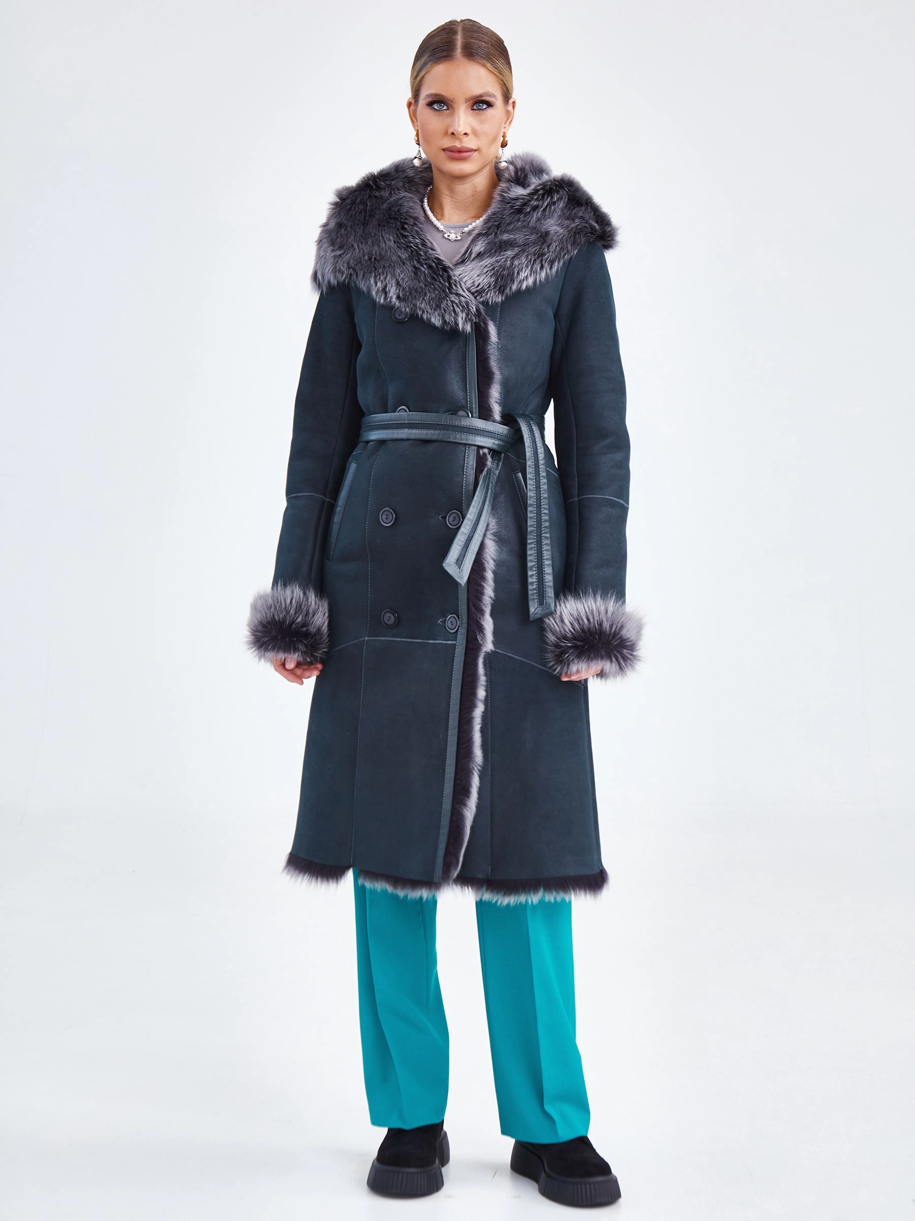 Товар двубортная женская дубленка из тосканы с капюшоном премиум класса 134, синяя, размер 44, артикул 62851 выполнен из овчина "тоскана" с застежкой пуговицы. Рассчитан на сезон: осень-зима. Длина изделия 110 см, силуэт полуприлегающий.
