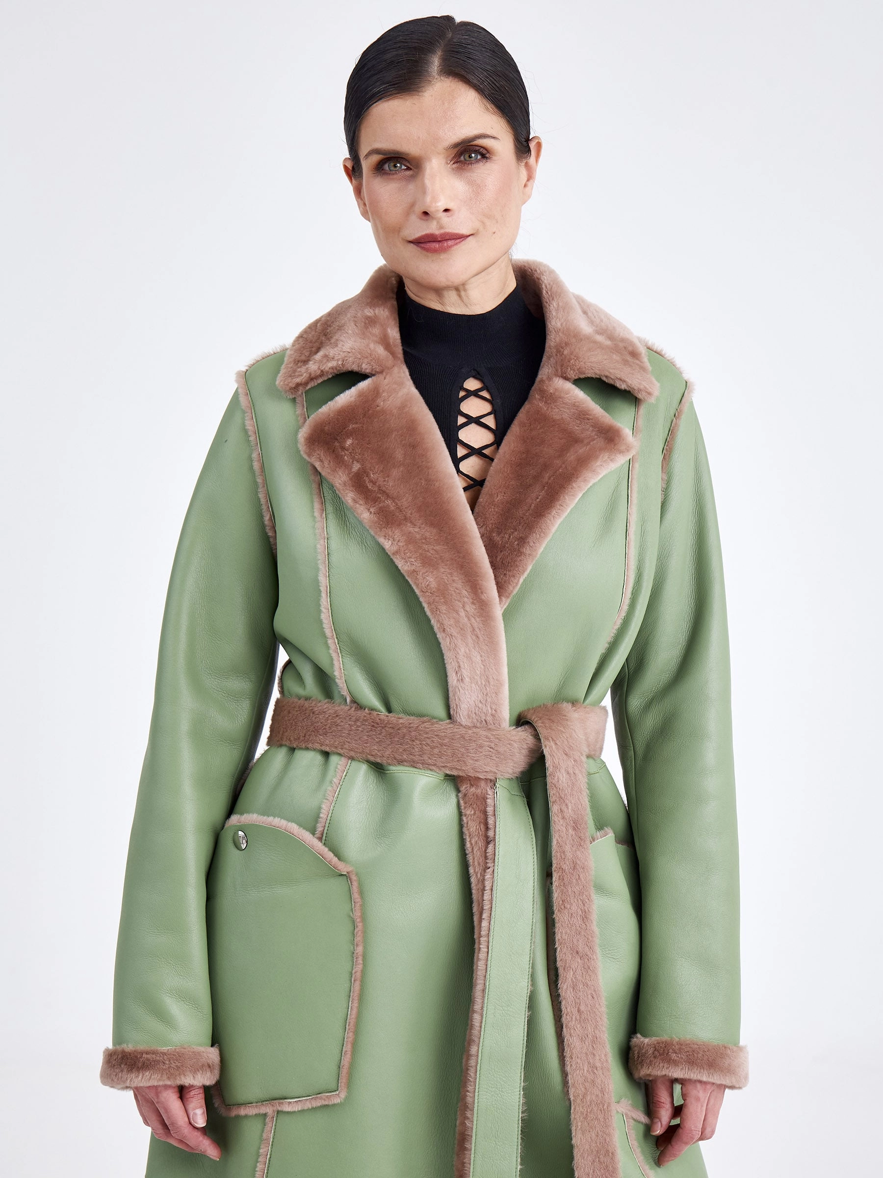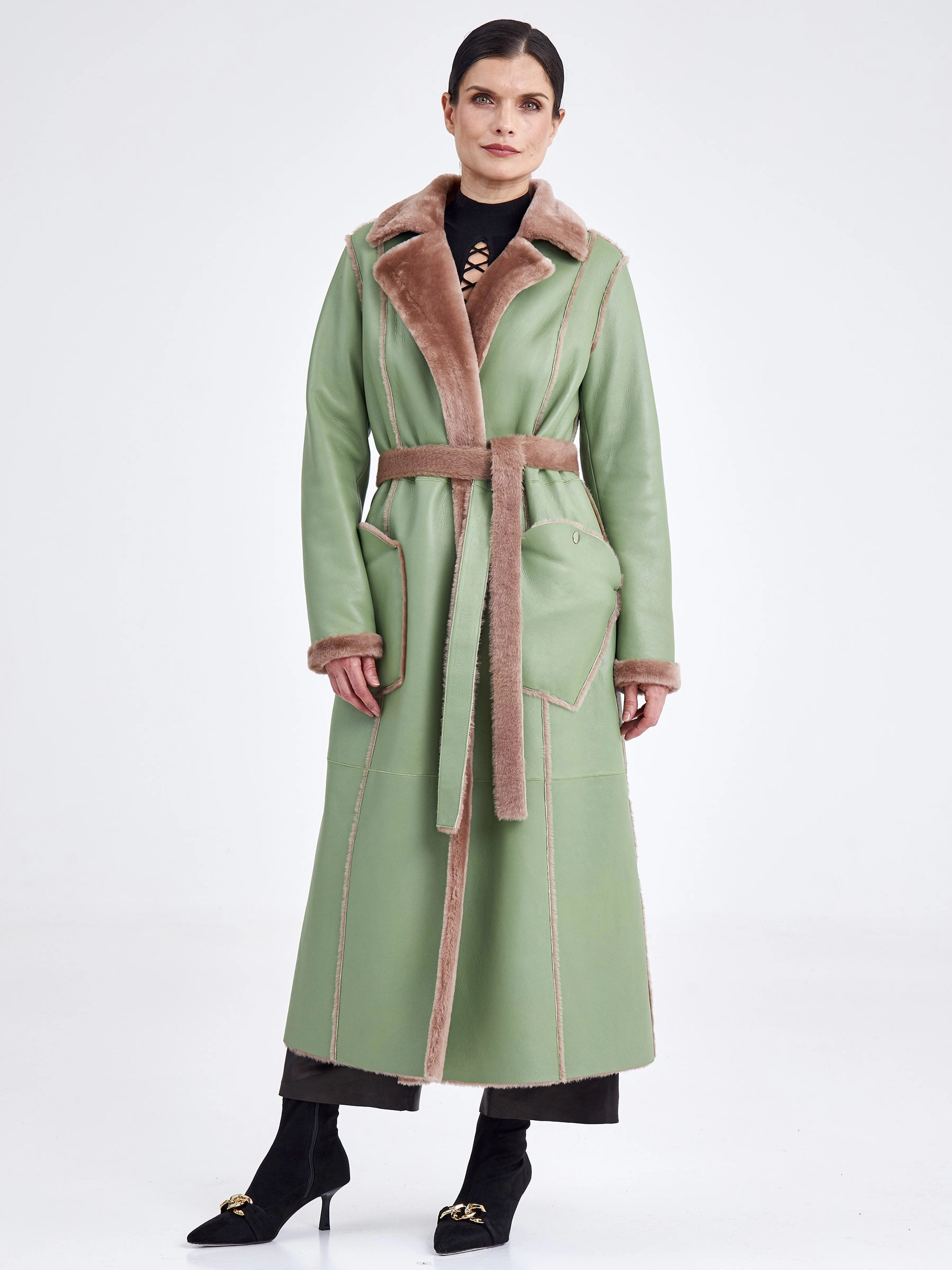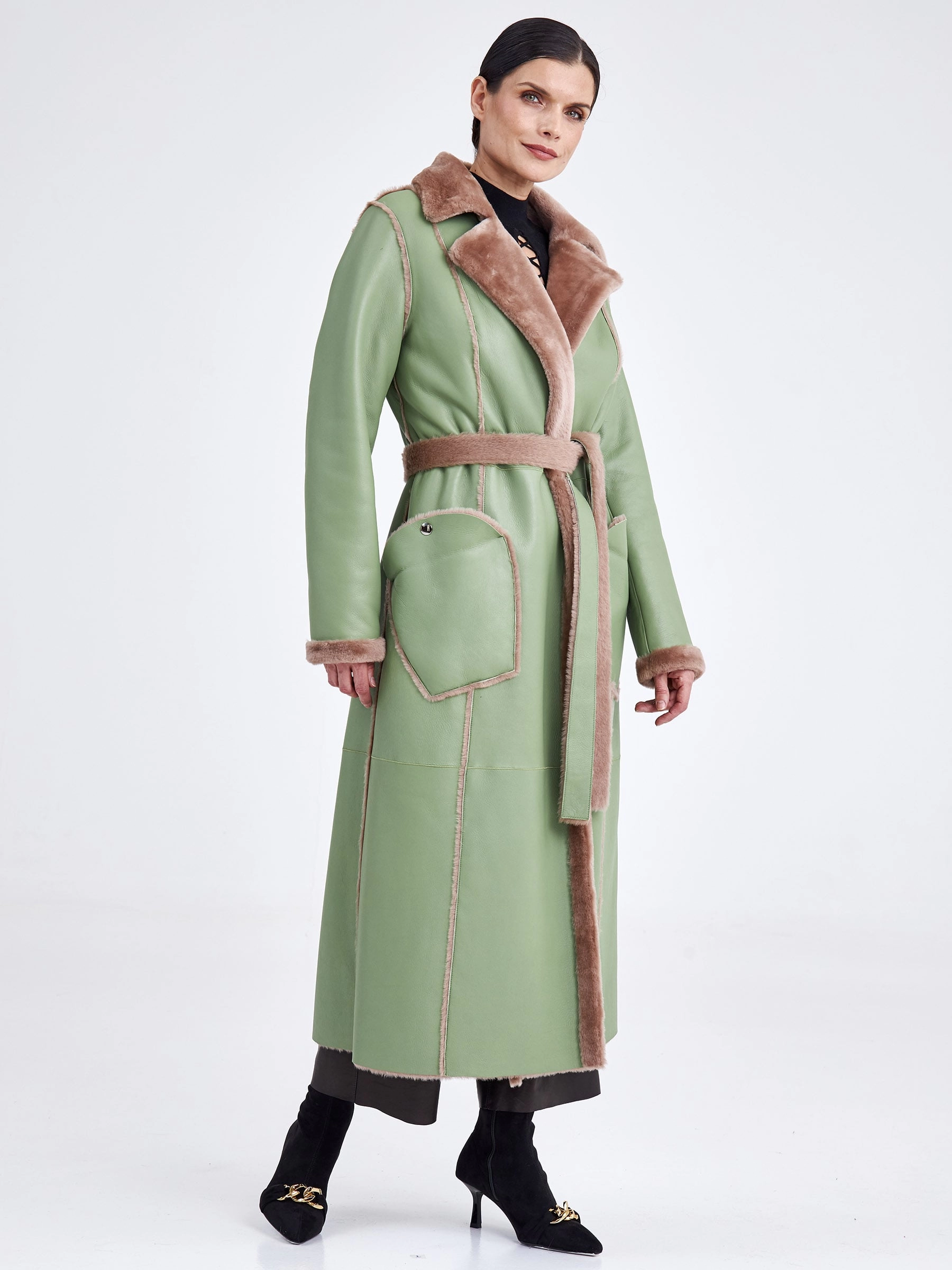 Стиль и комфорт читаются в каждом движении этой дублёнки длиной более 90 см. Модель выполнена из мягкой овчины: внутри — бежевого оттенка, снаружи — оливкового, что благодаря бережной выделке делает её лёгкой и невероятно тёплой. Особенность модели — отсутствие застёжек, только элегантный запах и длинный пояс, подчеркивающий полуприлегающий силуэт. Детали завершают образ: классический английский воротник и пара карманов с меховым отворотом на кнопках. Совет стилиста: Эта дублёнка самодостаточна. Носите её с однотонными базовыми вещами — например, с чёрными узкими брюками или джинсами, водолазкой и высокими сапогами, чтобы акцент оставался на фактуре и цвете меха. Длинный пояс можно свободно завязать, подчеркнув талию, или оставить свисать для более расслабленного образа.