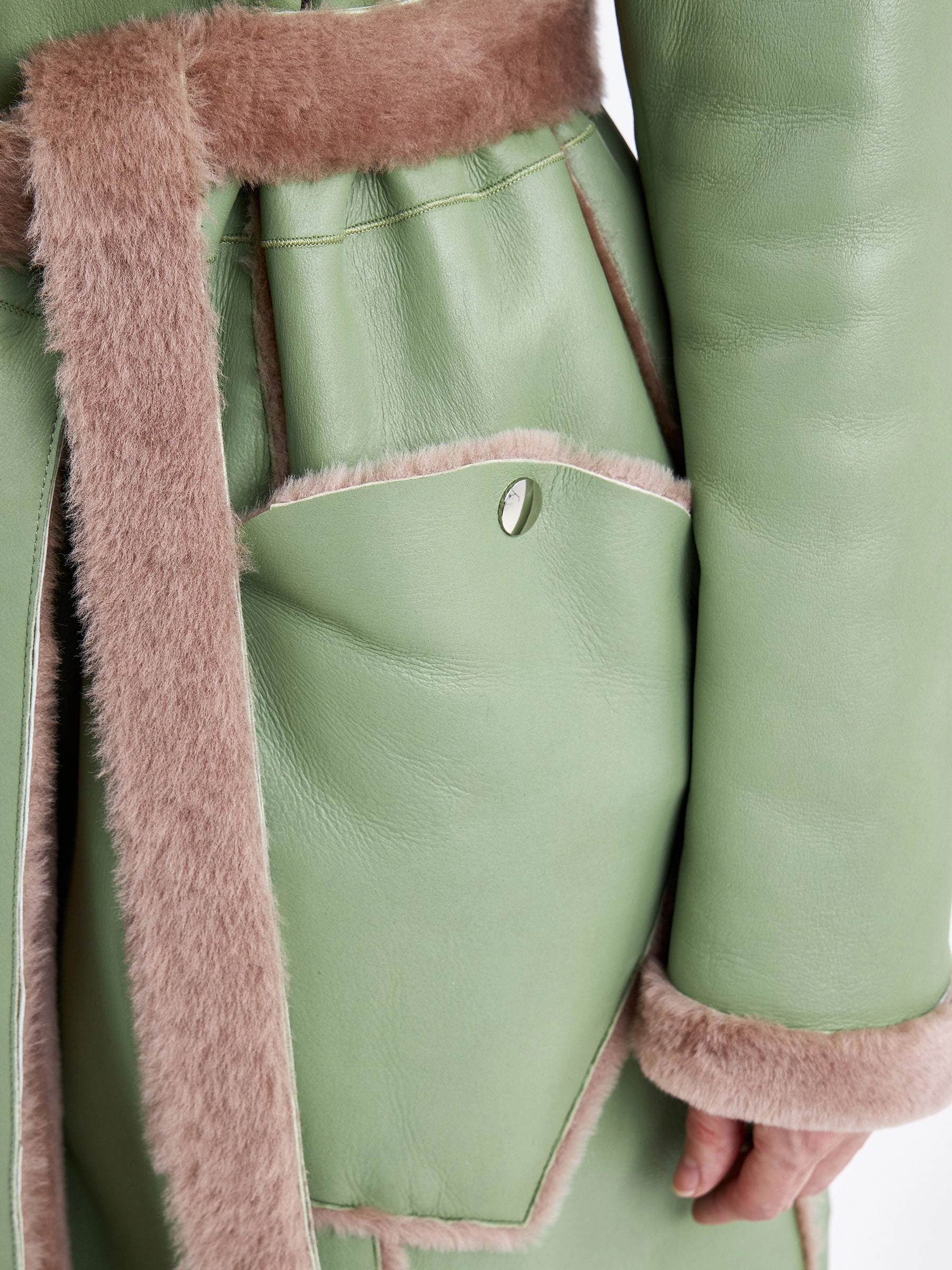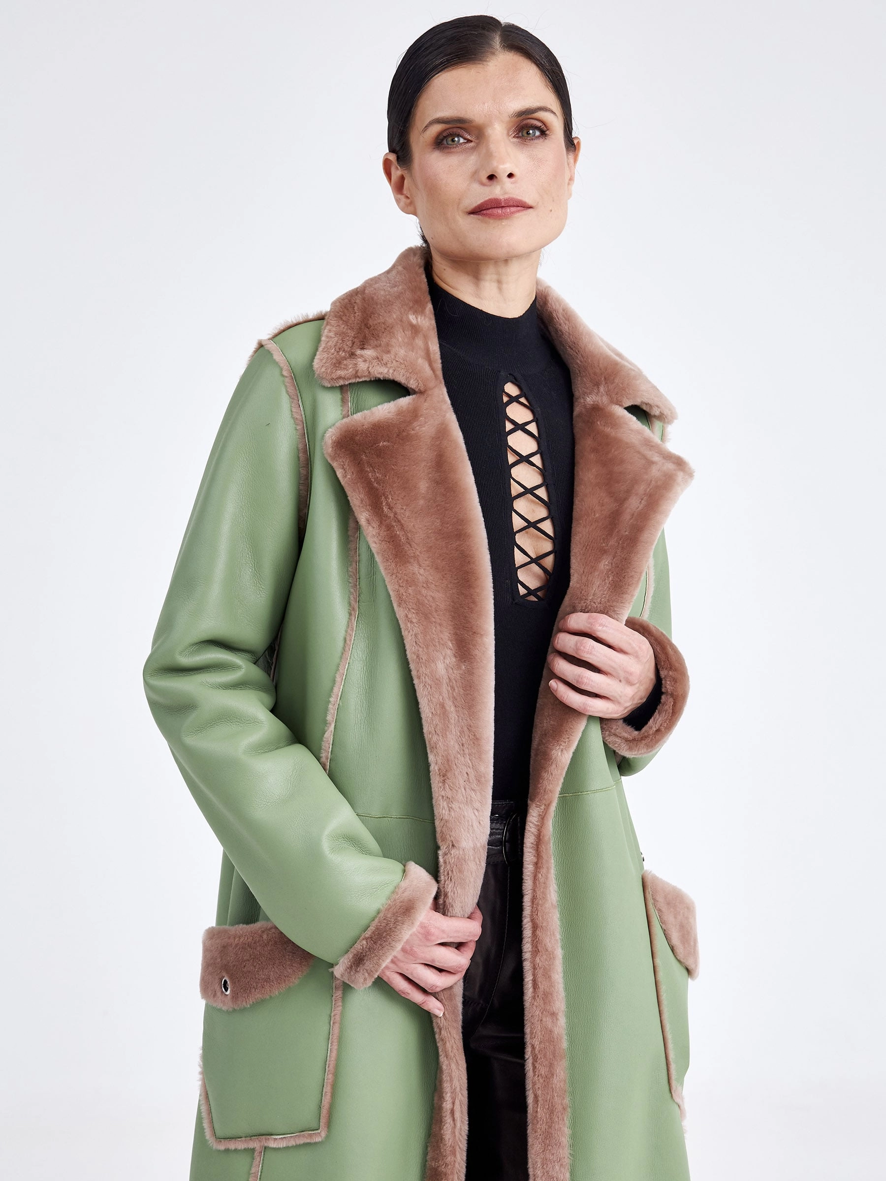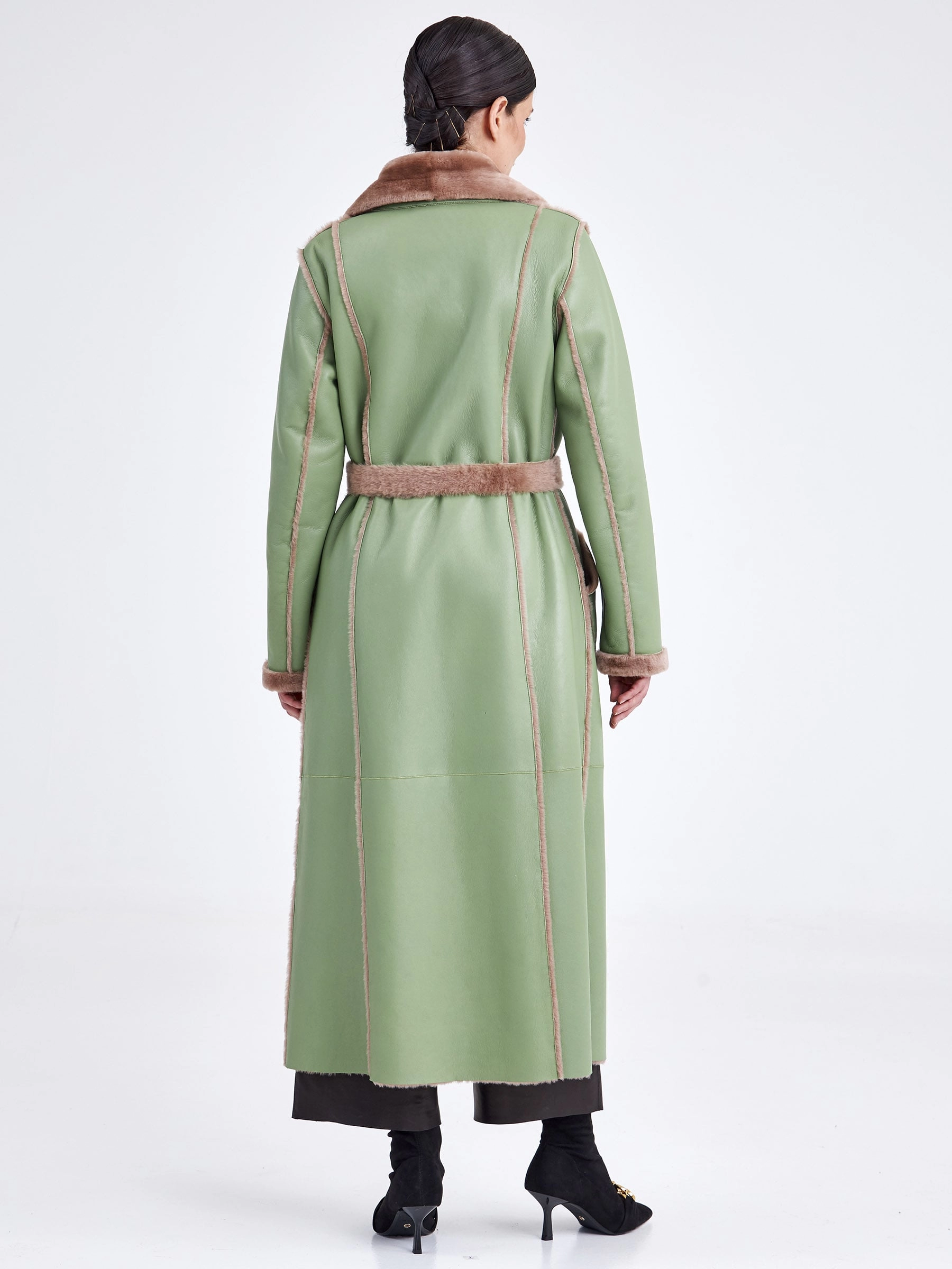 Стиль и комфорт читаются в каждом движении этой дублёнки длиной более 90 см. Модель выполнена из мягкой овчины: внутри — бежевого оттенка, снаружи — оливкового, что благодаря бережной выделке делает её лёгкой и невероятно тёплой. Особенность модели — отсутствие застёжек, только элегантный запах и длинный пояс, подчеркивающий полуприлегающий силуэт. Детали завершают образ: классический английский воротник и пара карманов с меховым отворотом на кнопках. Совет стилиста: Эта дублёнка самодостаточна. Носите её с однотонными базовыми вещами — например, с чёрными узкими брюками или джинсами, водолазкой и высокими сапогами, чтобы акцент оставался на фактуре и цвете меха. Длинный пояс можно свободно завязать, подчеркнув талию, или оставить свисать для более расслабленного образа.