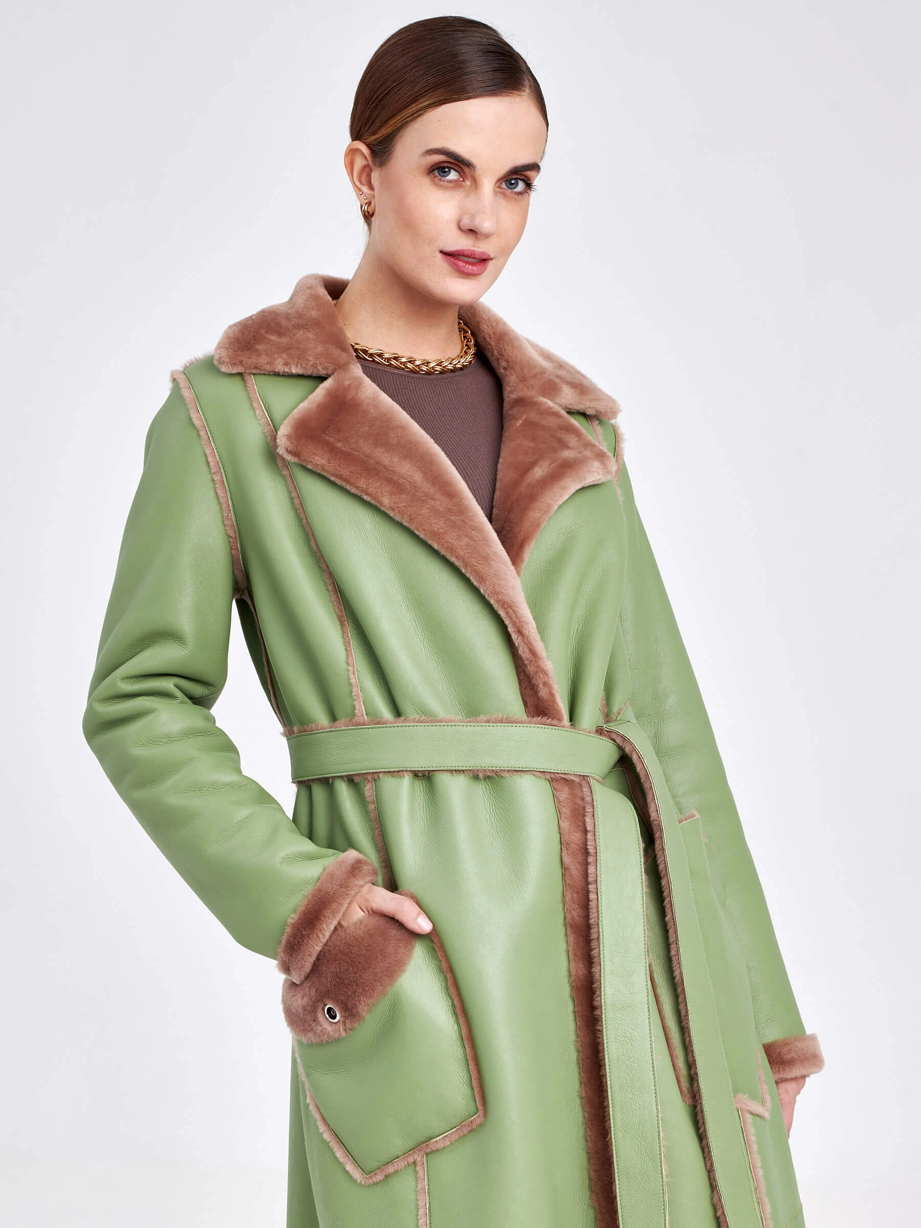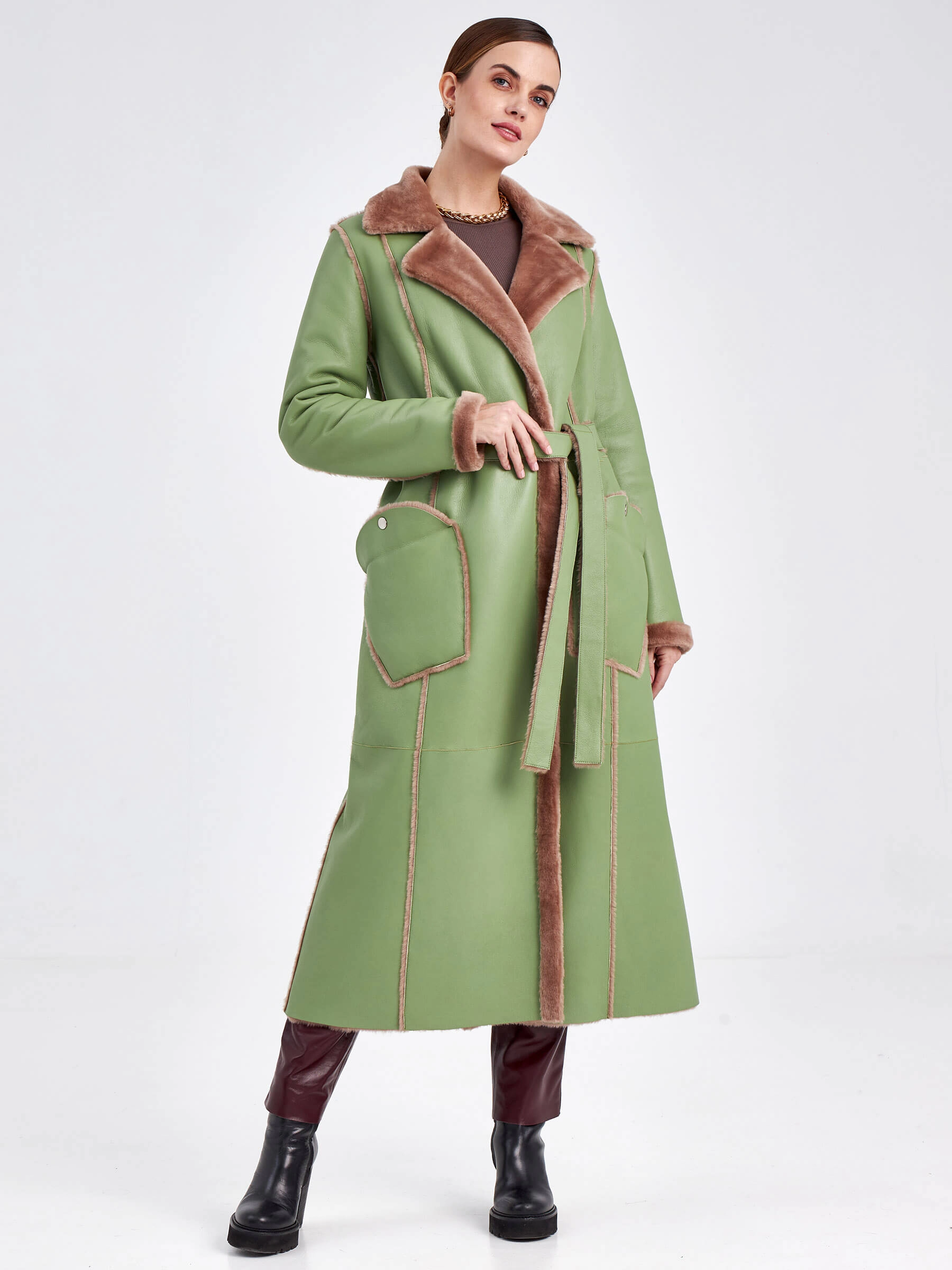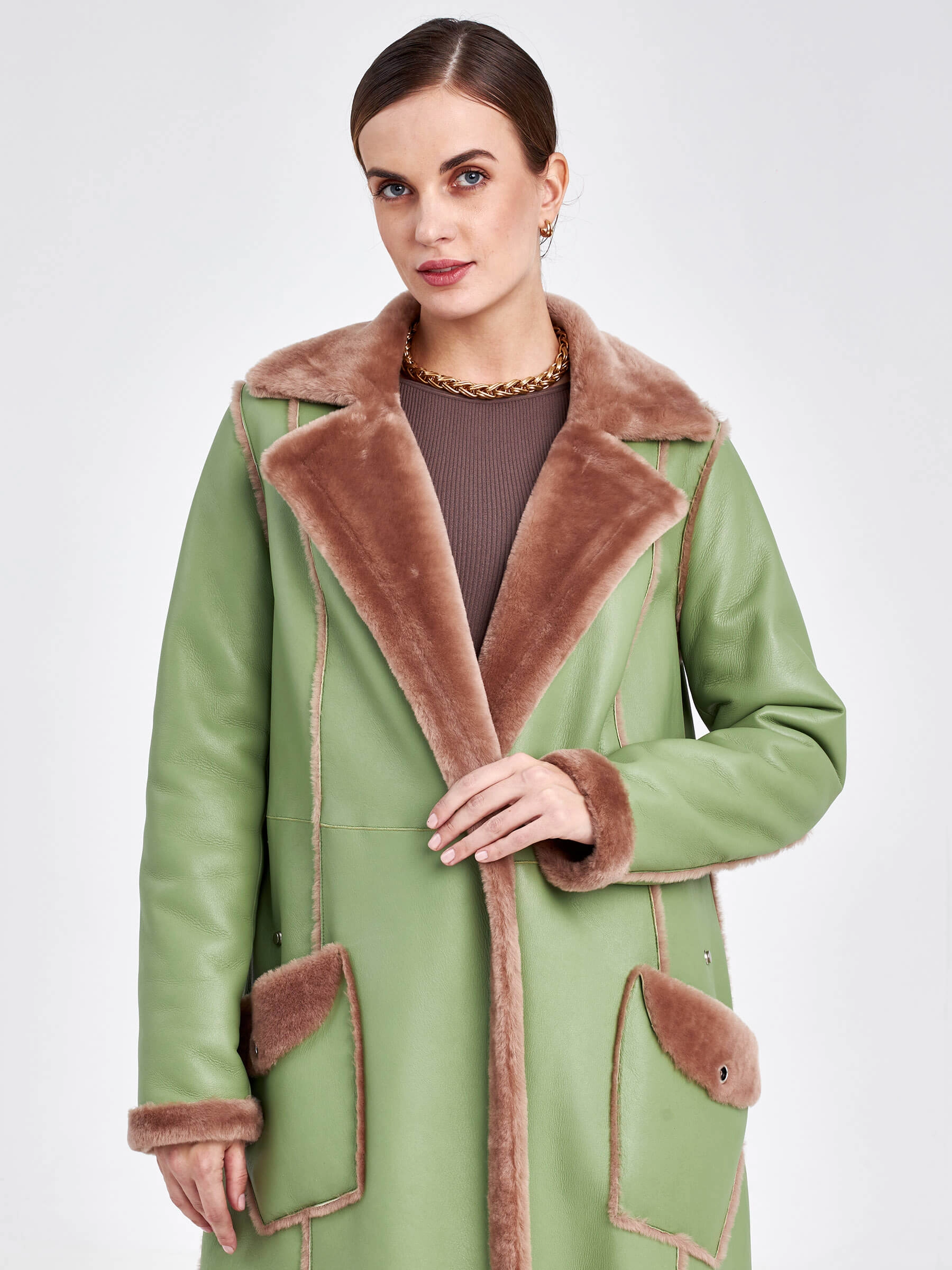 Стиль и комфорт читаются в каждом движении этой дублёнки длиной более 90 см. Модель выполнена из мягкой овчины: внутри — бежевого оттенка, снаружи — оливкового, что благодаря бережной выделке делает её лёгкой и невероятно тёплой. Особенность модели — отсутствие застёжек, только элегантный запах и длинный пояс, подчеркивающий полуприлегающий силуэт. Детали завершают образ: классический английский воротник и пара карманов с меховым отворотом на кнопках. Совет стилиста: Эта дублёнка самодостаточна. Носите её с однотонными базовыми вещами — например, с чёрными узкими брюками или джинсами, водолазкой и высокими сапогами, чтобы акцент оставался на фактуре и цвете меха. Длинный пояс можно свободно завязать, подчеркнув талию, или оставить свисать для более расслабленного образа.