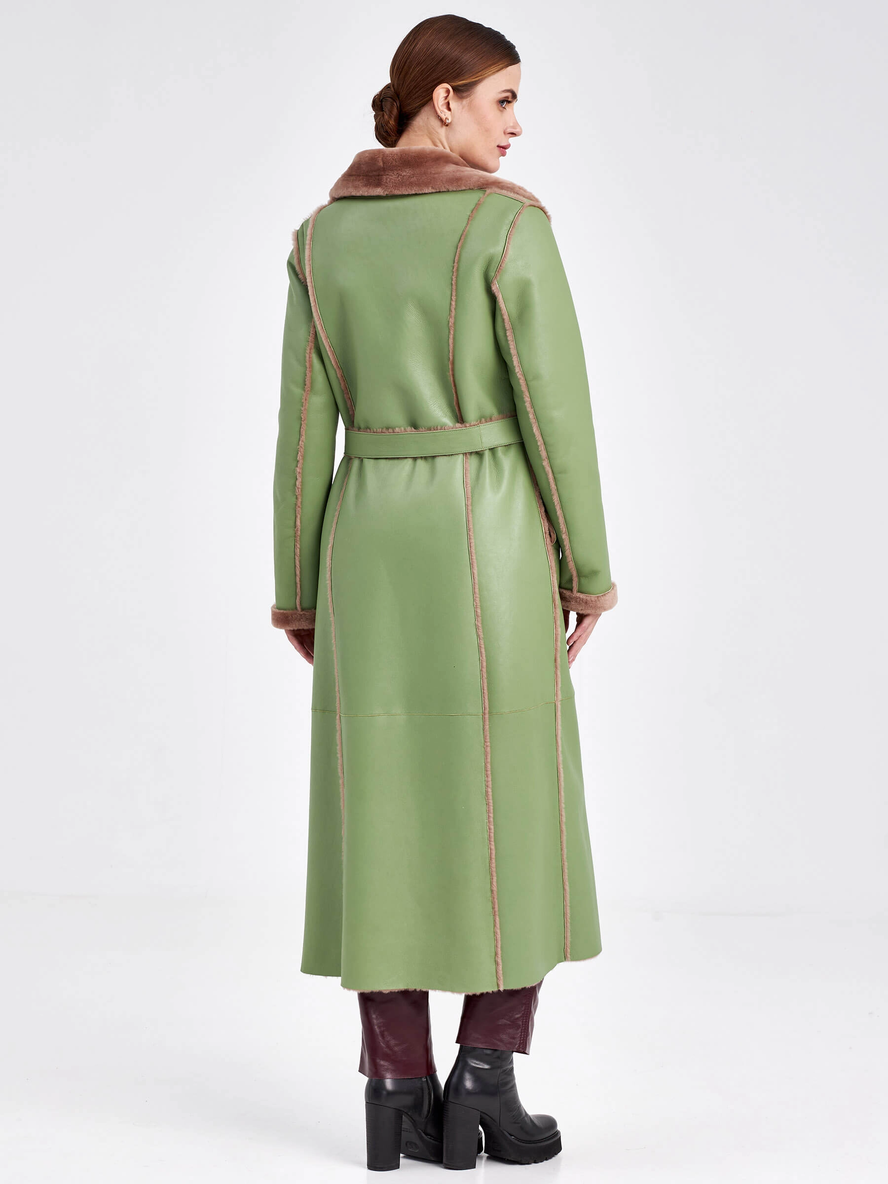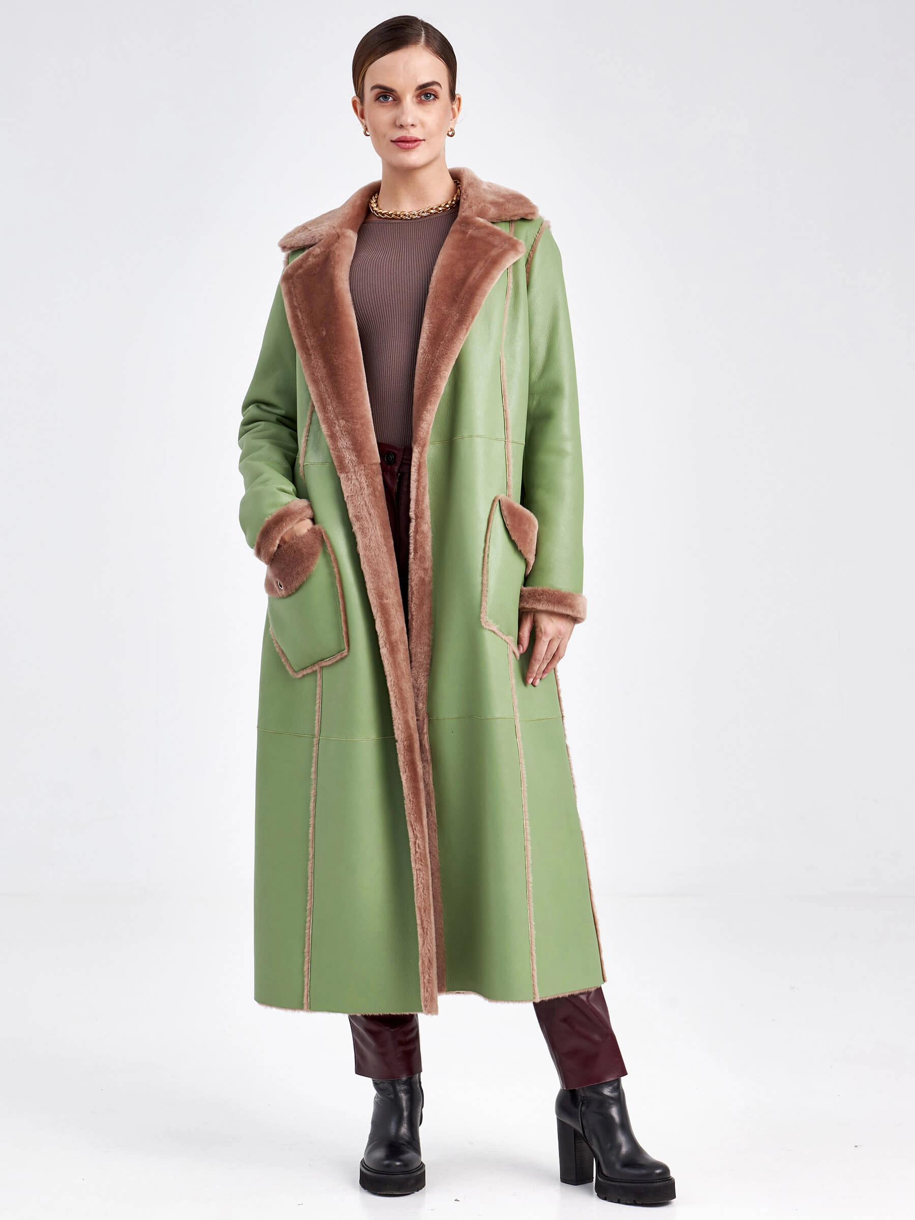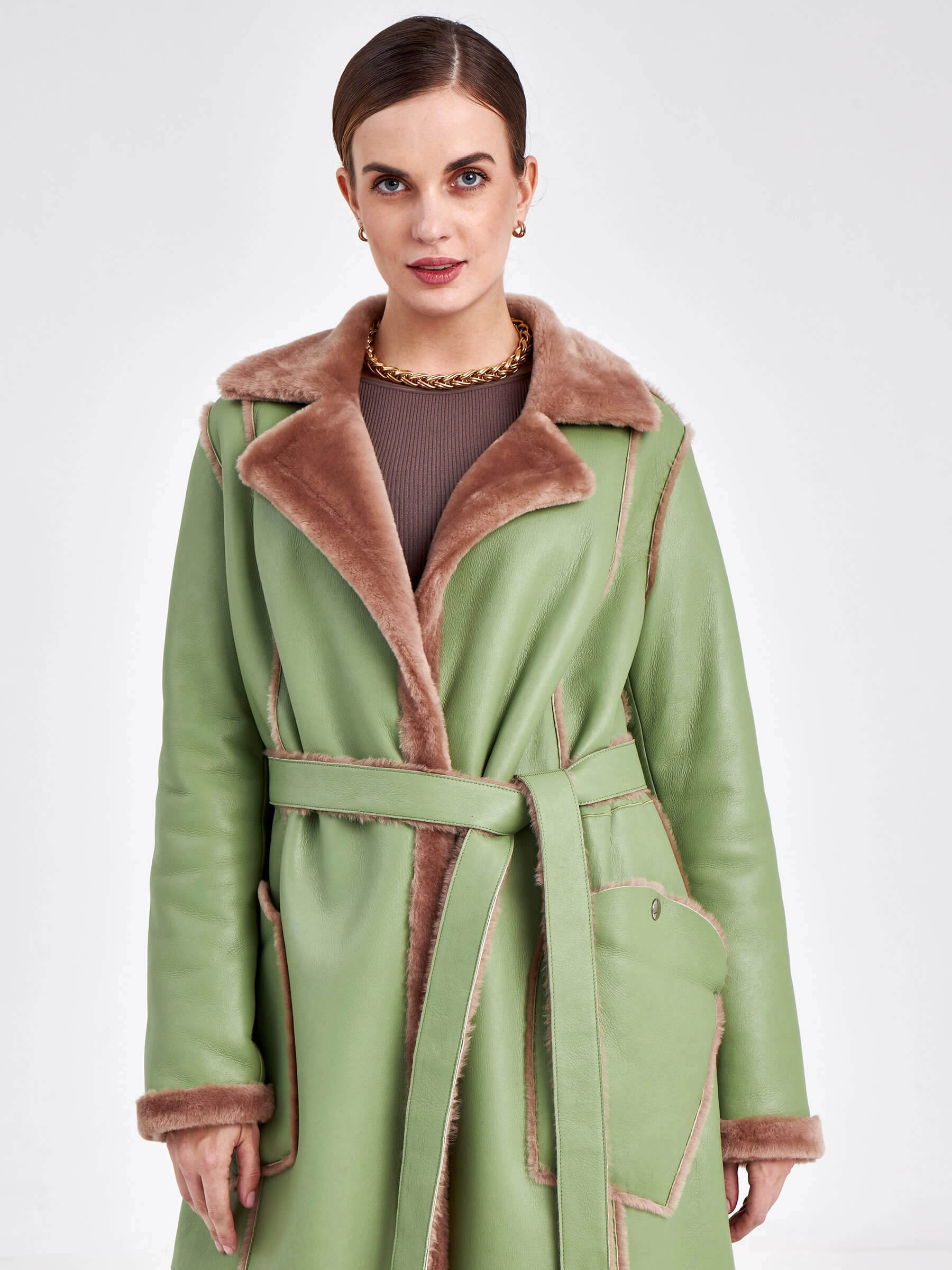 Стиль и комфорт читаются в каждом движении этой дублёнки длиной более 90 см. Модель выполнена из мягкой овчины: внутри — бежевого оттенка, снаружи — оливкового, что благодаря бережной выделке делает её лёгкой и невероятно тёплой. Особенность модели — отсутствие застёжек, только элегантный запах и длинный пояс, подчеркивающий полуприлегающий силуэт. Детали завершают образ: классический английский воротник и пара карманов с меховым отворотом на кнопках. Совет стилиста: Эта дублёнка самодостаточна. Носите её с однотонными базовыми вещами — например, с чёрными узкими брюками или джинсами, водолазкой и высокими сапогами, чтобы акцент оставался на фактуре и цвете меха. Длинный пояс можно свободно завязать, подчеркнув талию, или оставить свисать для более расслабленного образа.