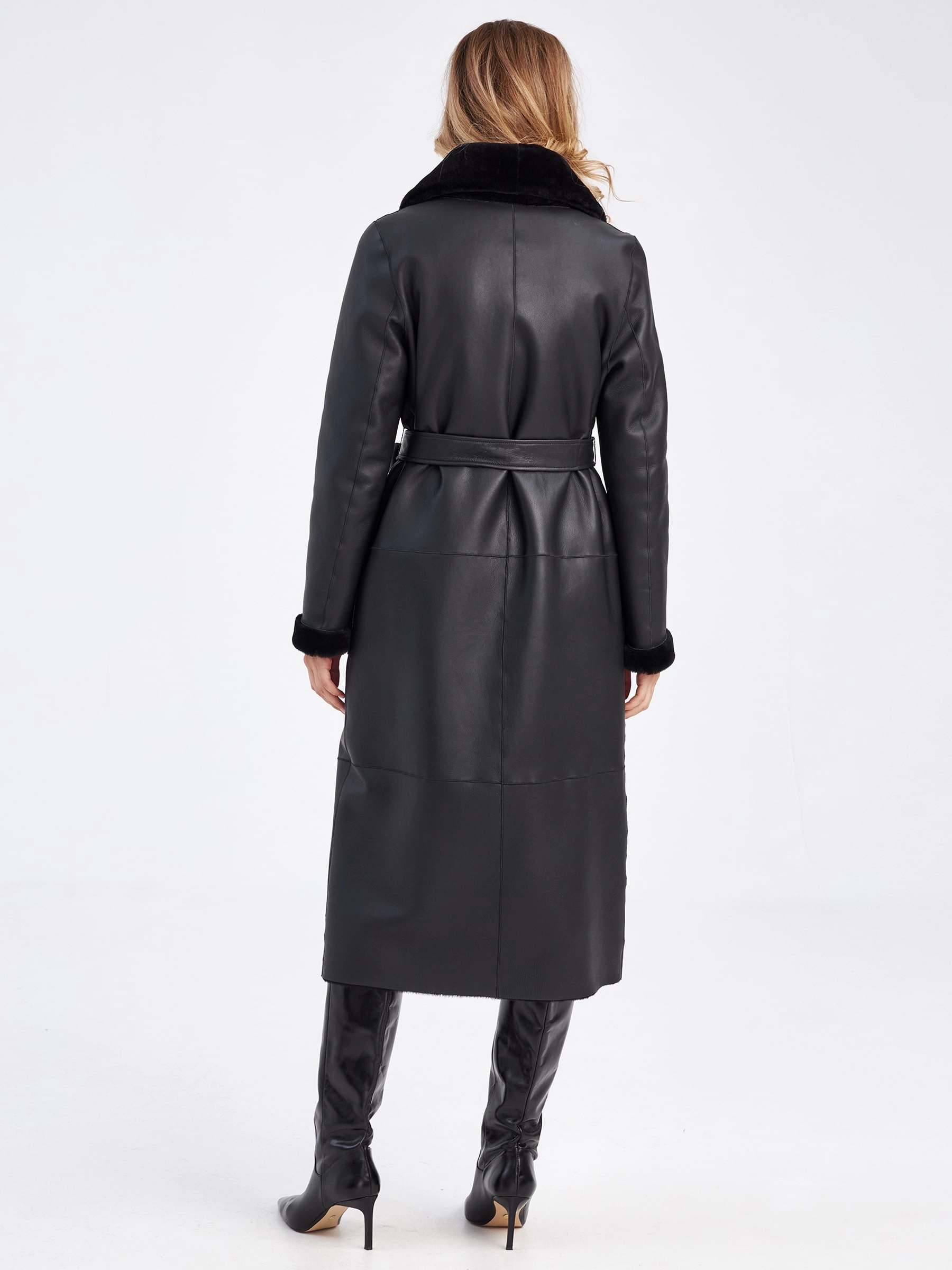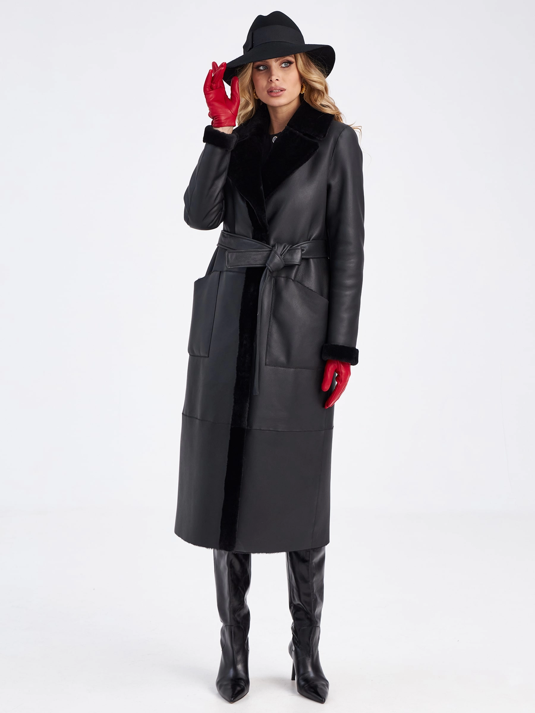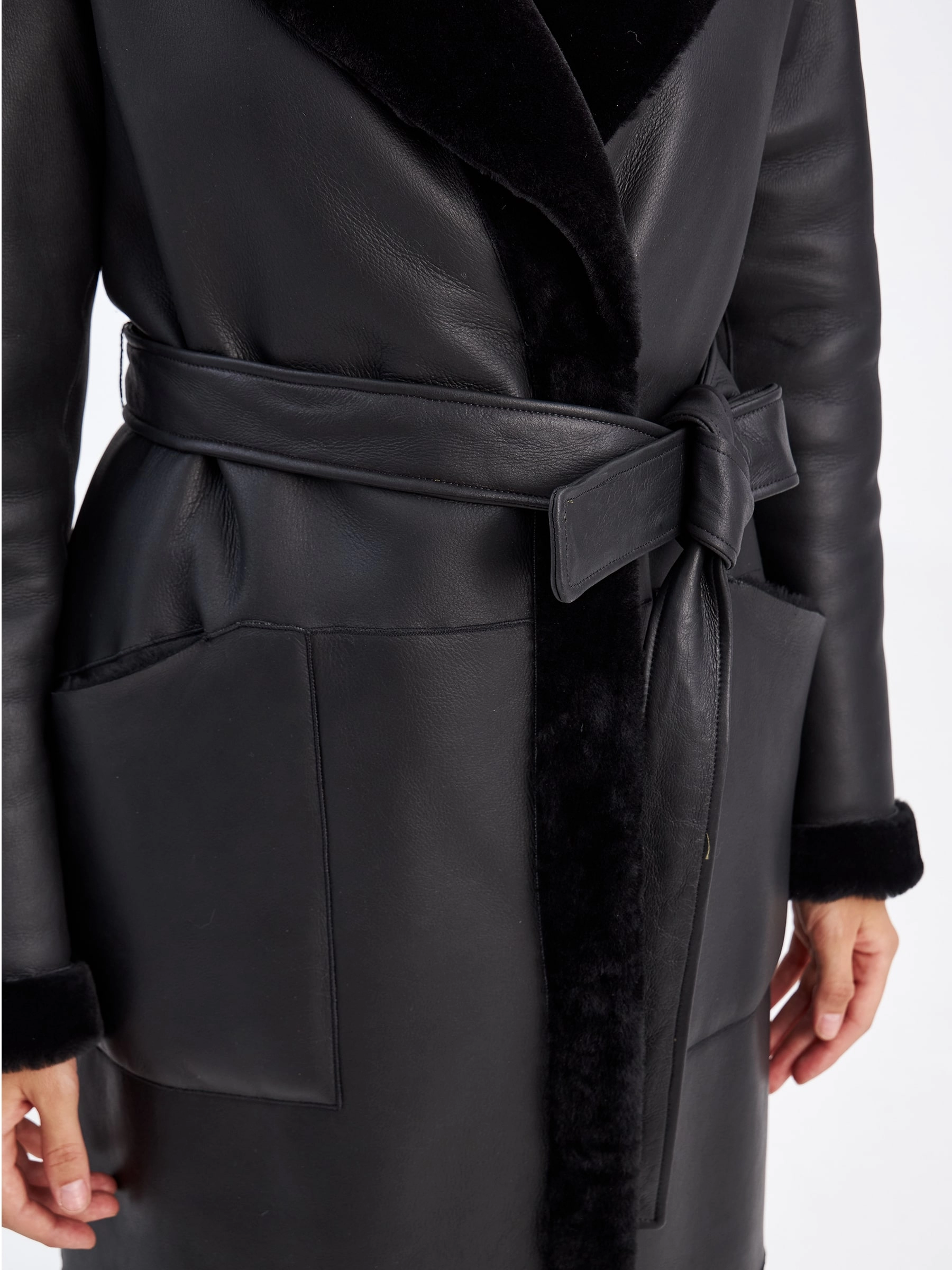 Женская классическая длинная дубленка с поясом премиум класса 2006н, черная, размер 52, артикул 63250