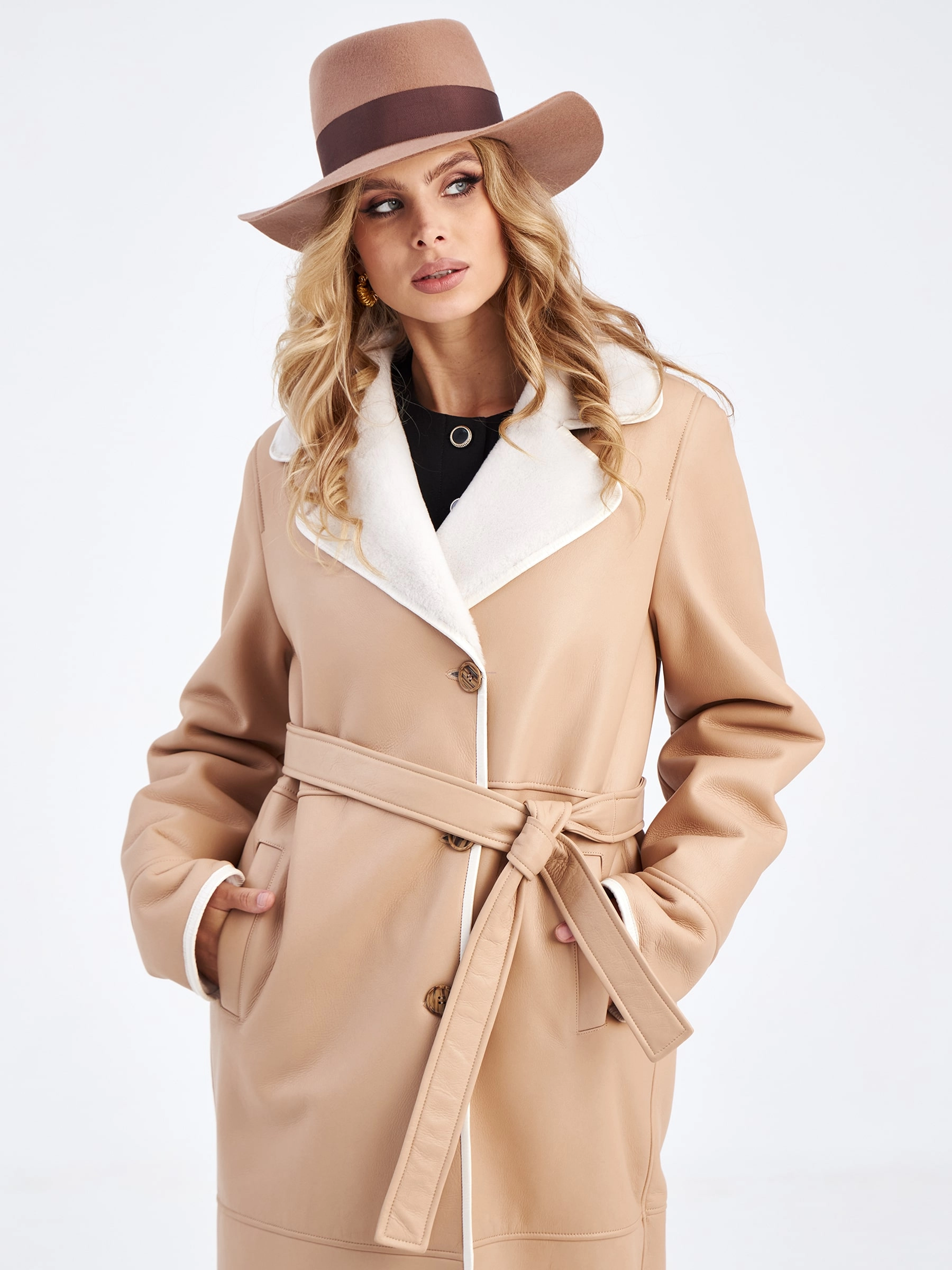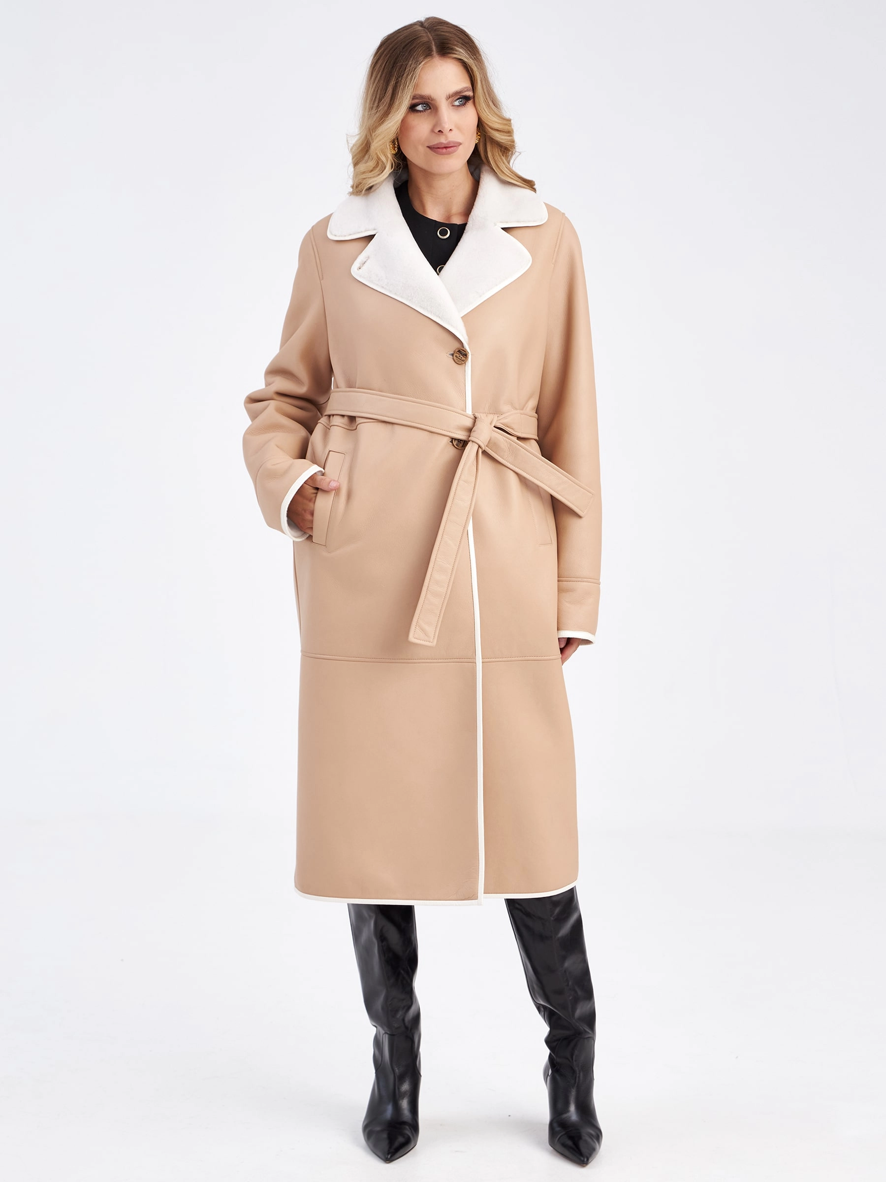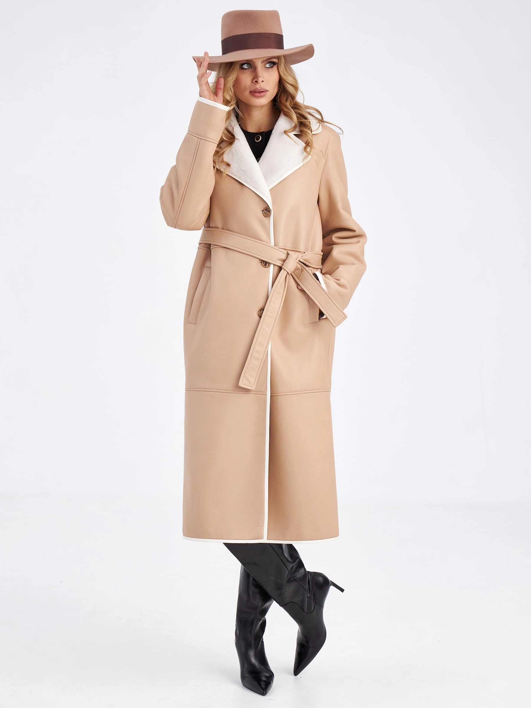 Длинная классическая дубленка премиум класса для женщин 2009н, бежевая, размер 46, артикул 63210