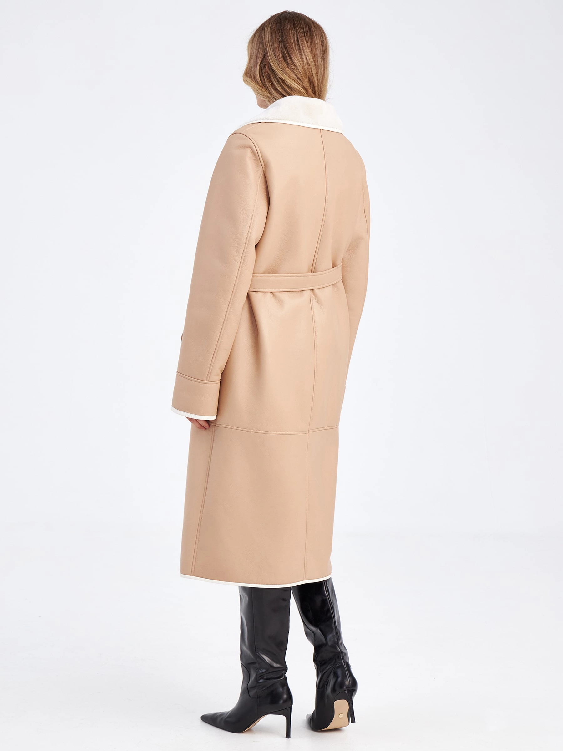 Лаконичная дубленка - это доказательство того, что даже зимой можно выглядеть стильно и безупречно. Дубленку выполнили из нежной мягкой овчины бежевого цвета. Максимально густой мех хорошо сохраняет тепло. Прямой крой. Английский воротник и борт дополнены тонким кожаным кантом. Силуэт изделия можно изменить, при помощи длинного кожаного пояса. На первый план выходит качество и безупрчная посадка.