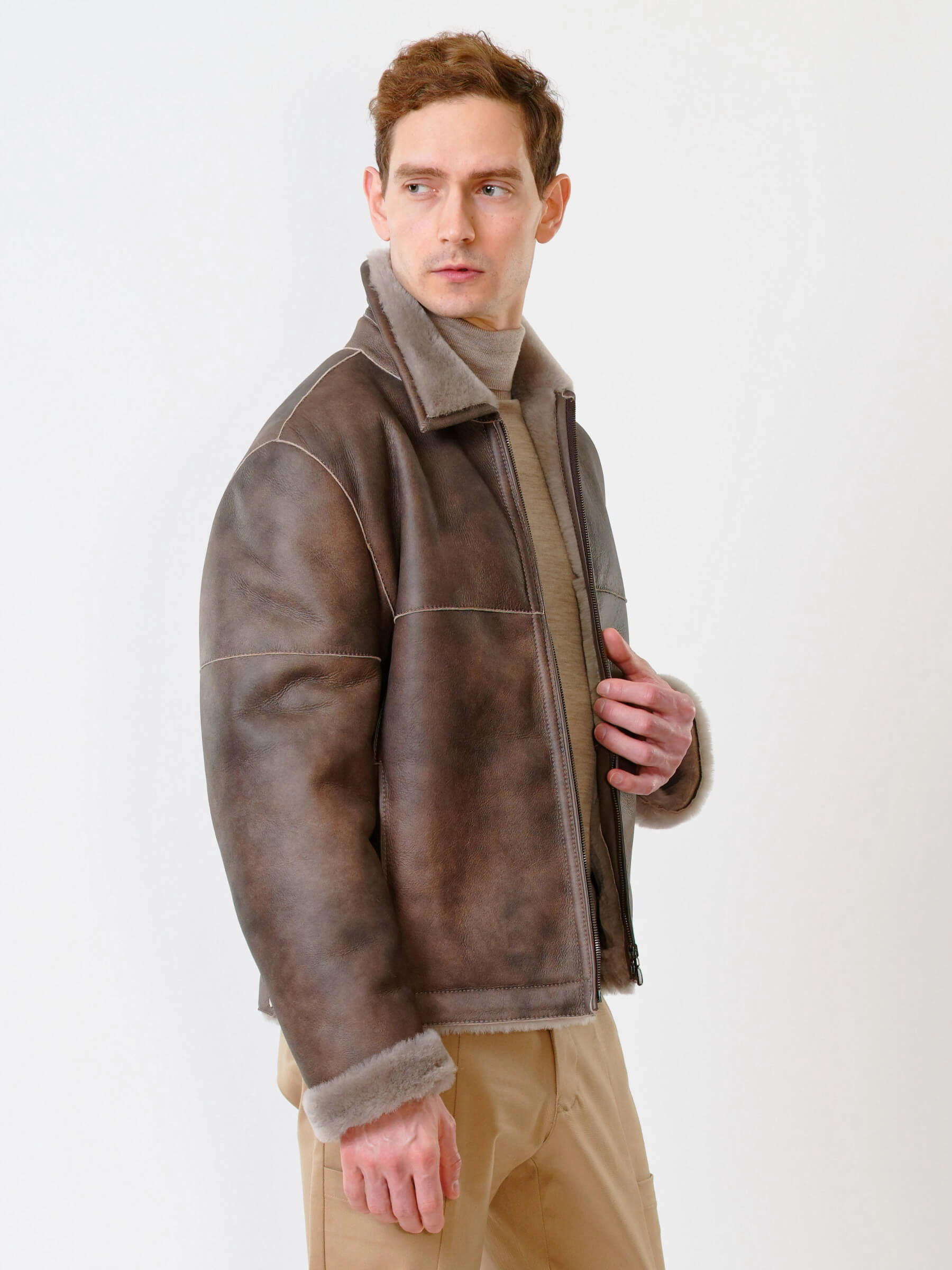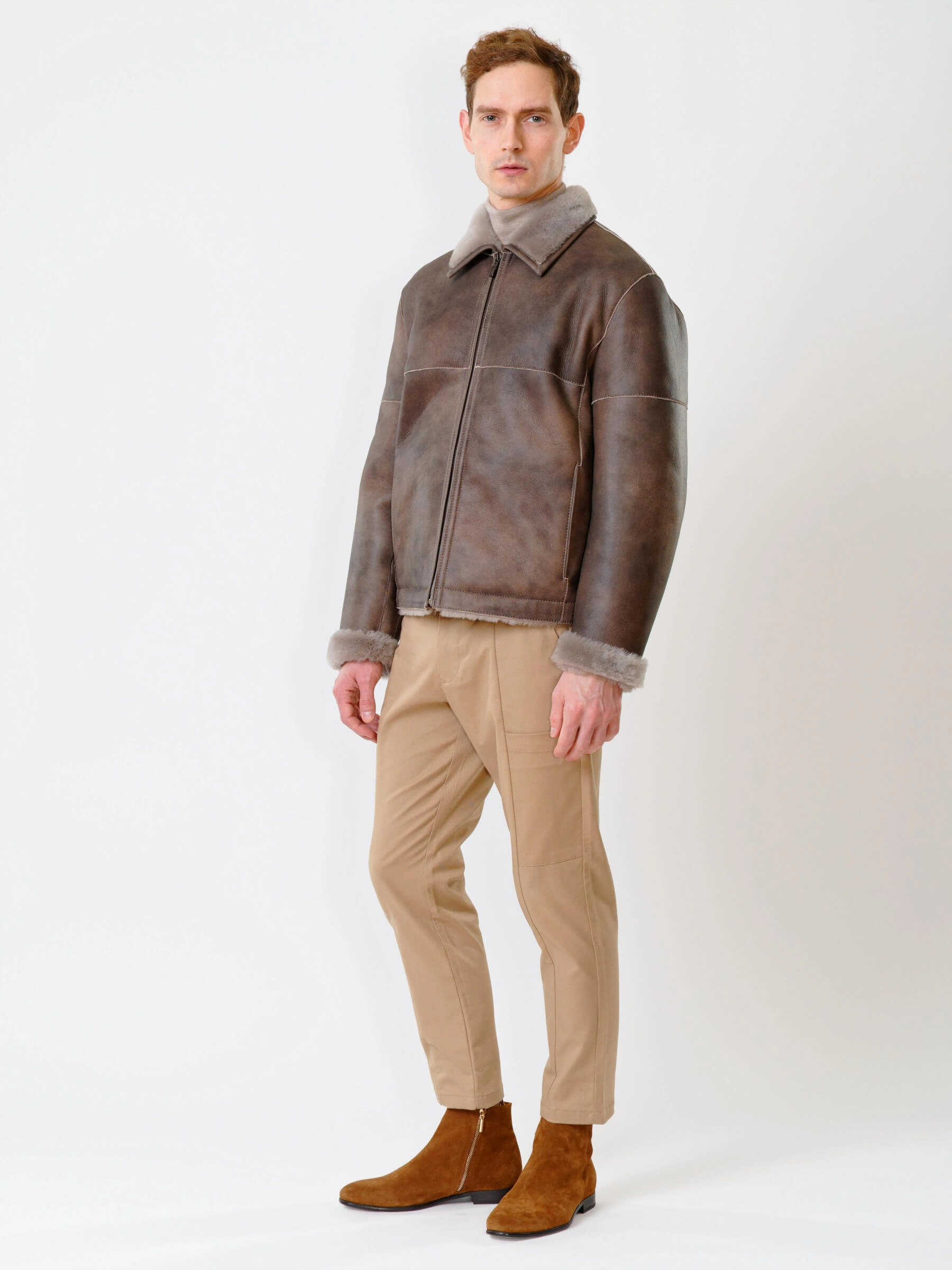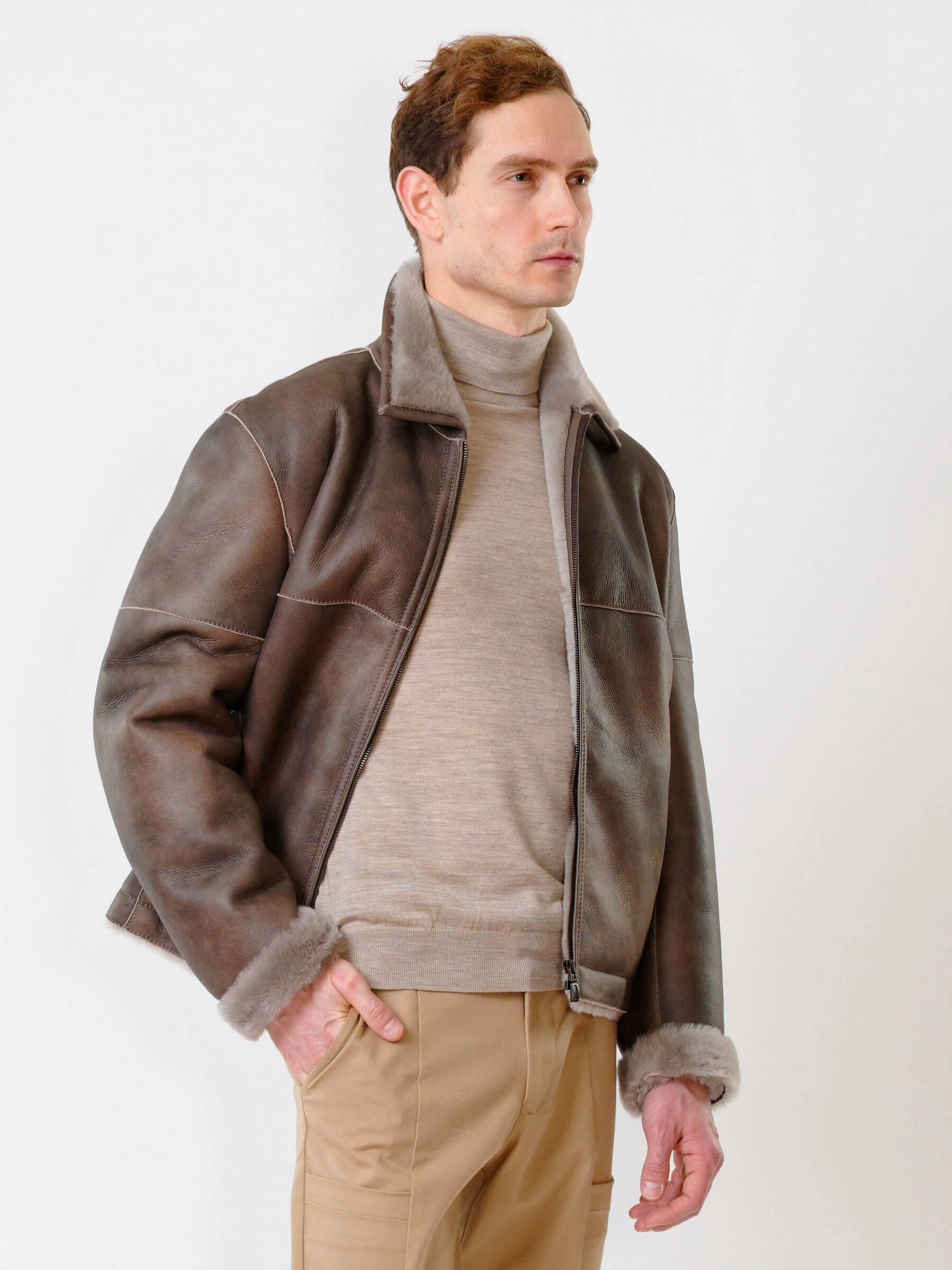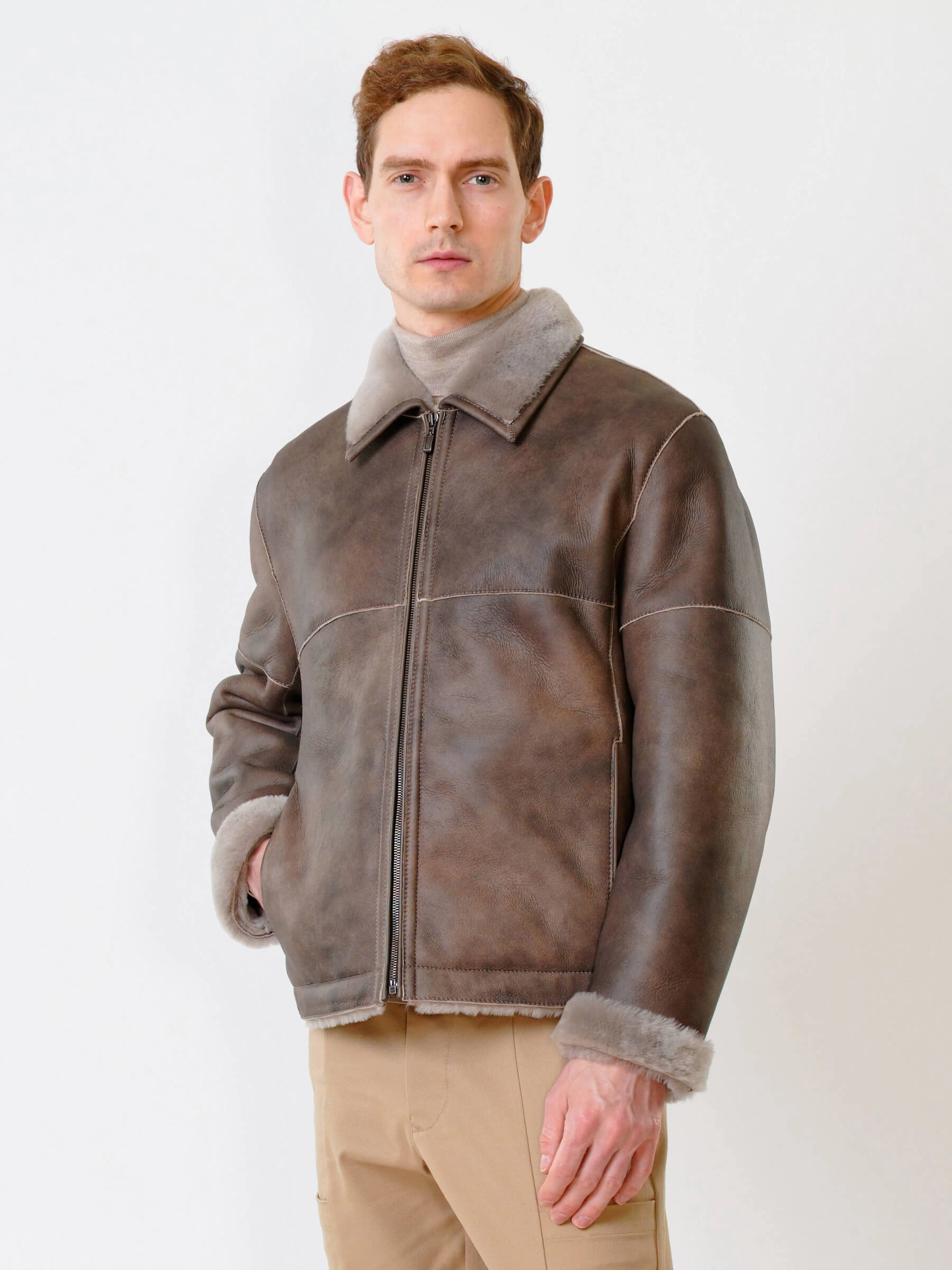 Товар короткая мужская дубленка 140, серо-коричневая, размер 50, артикул 70240 выполнен из овчина "мерино" с застежкой молния. Рассчитан на сезон: осень-зима. Длина изделия 70 см, силуэт прямой.