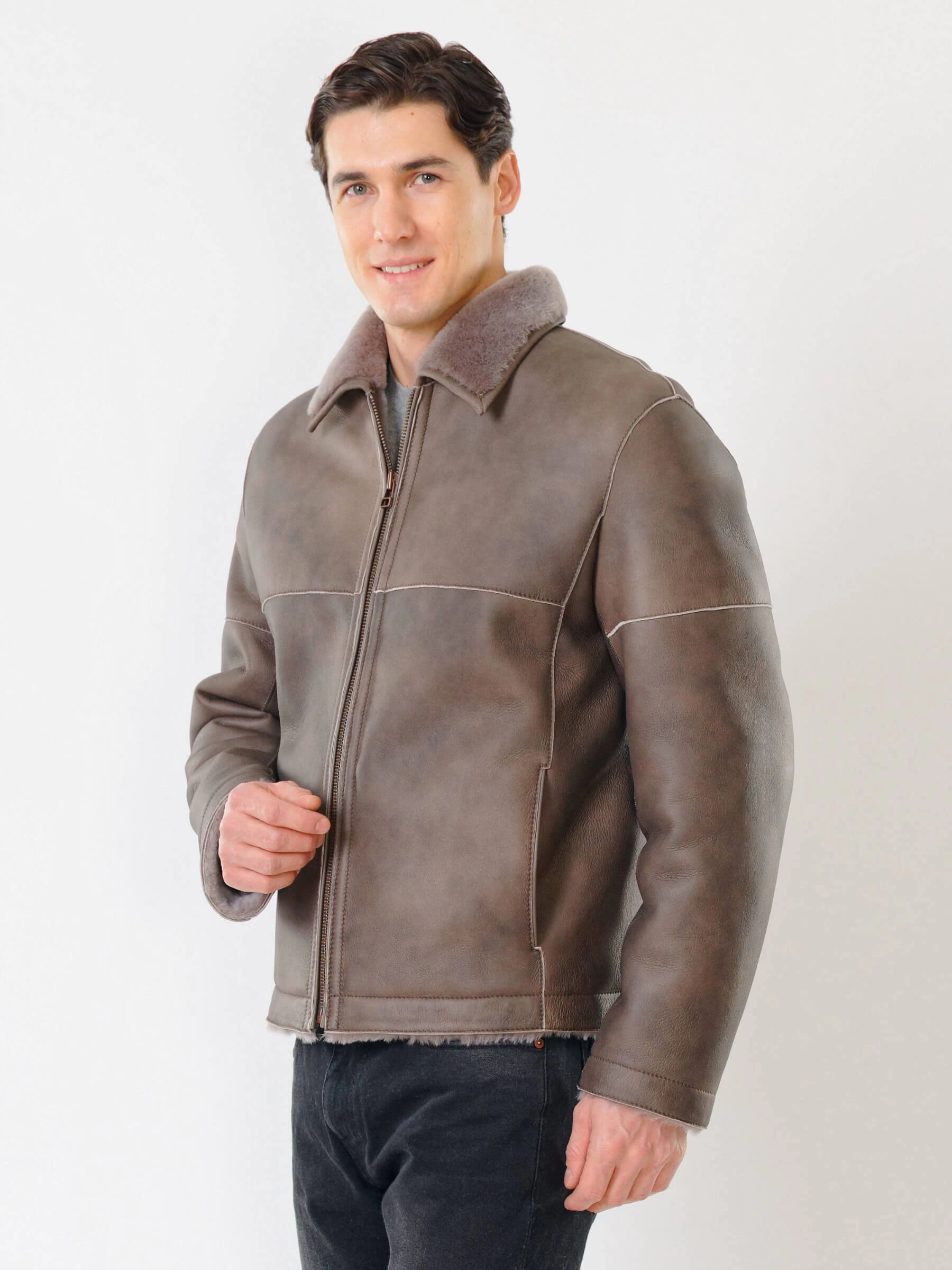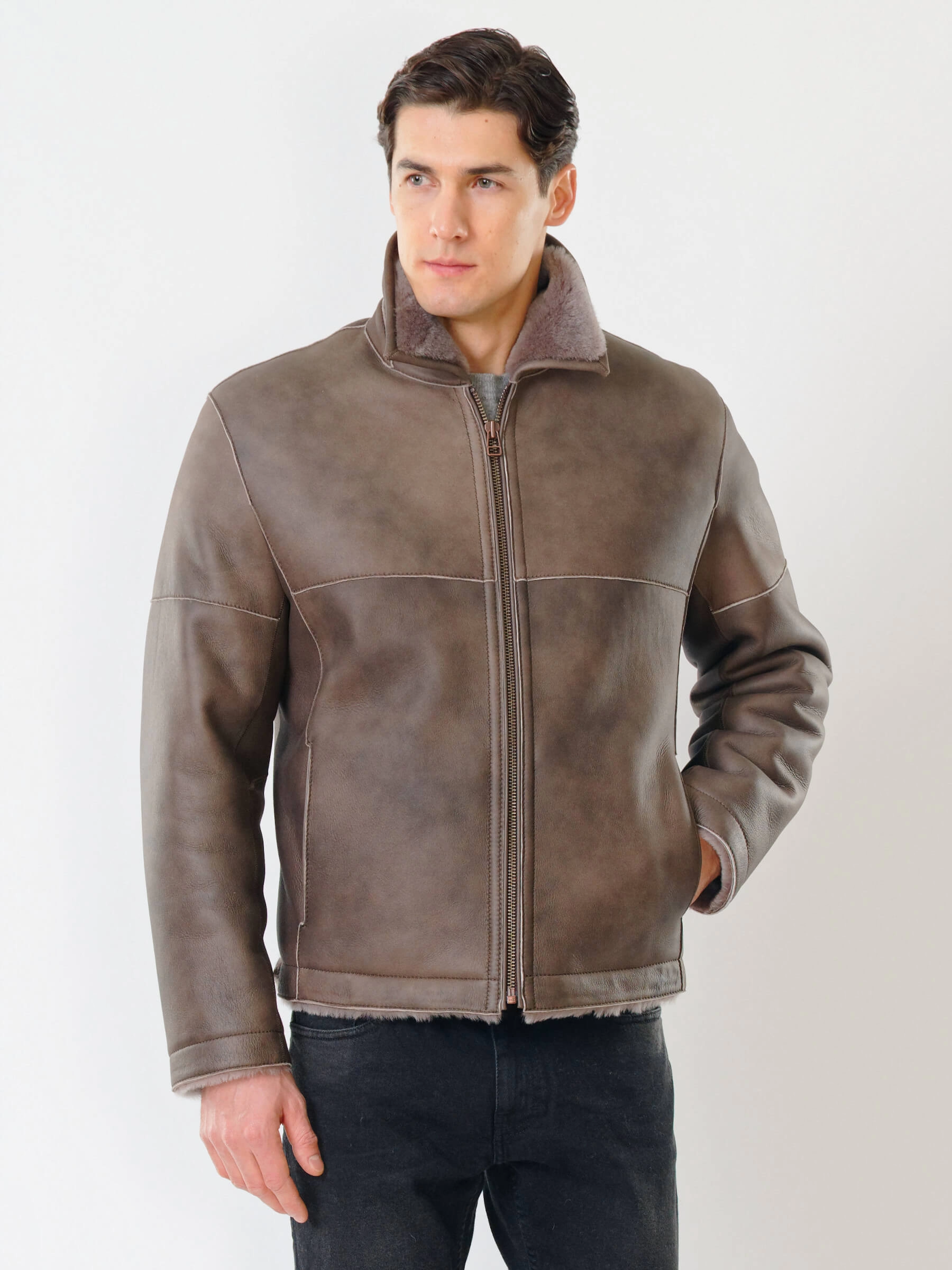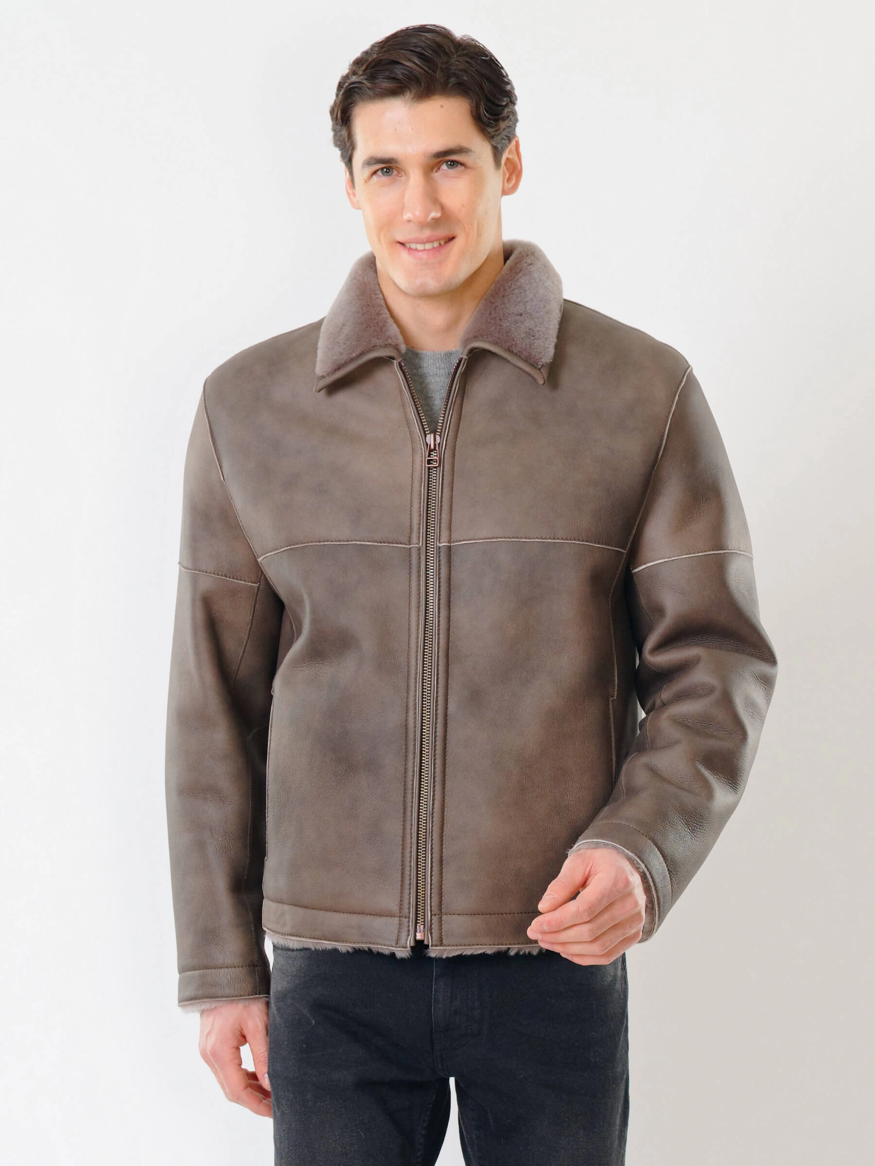 Товар короткая мужская дубленка 140, серо-коричневая, размер 50, артикул 70391 выполнен из овчина "мерино" с застежкой молния. Рассчитан на сезон: осень-зима. Длина изделия 70 см, силуэт прямой.