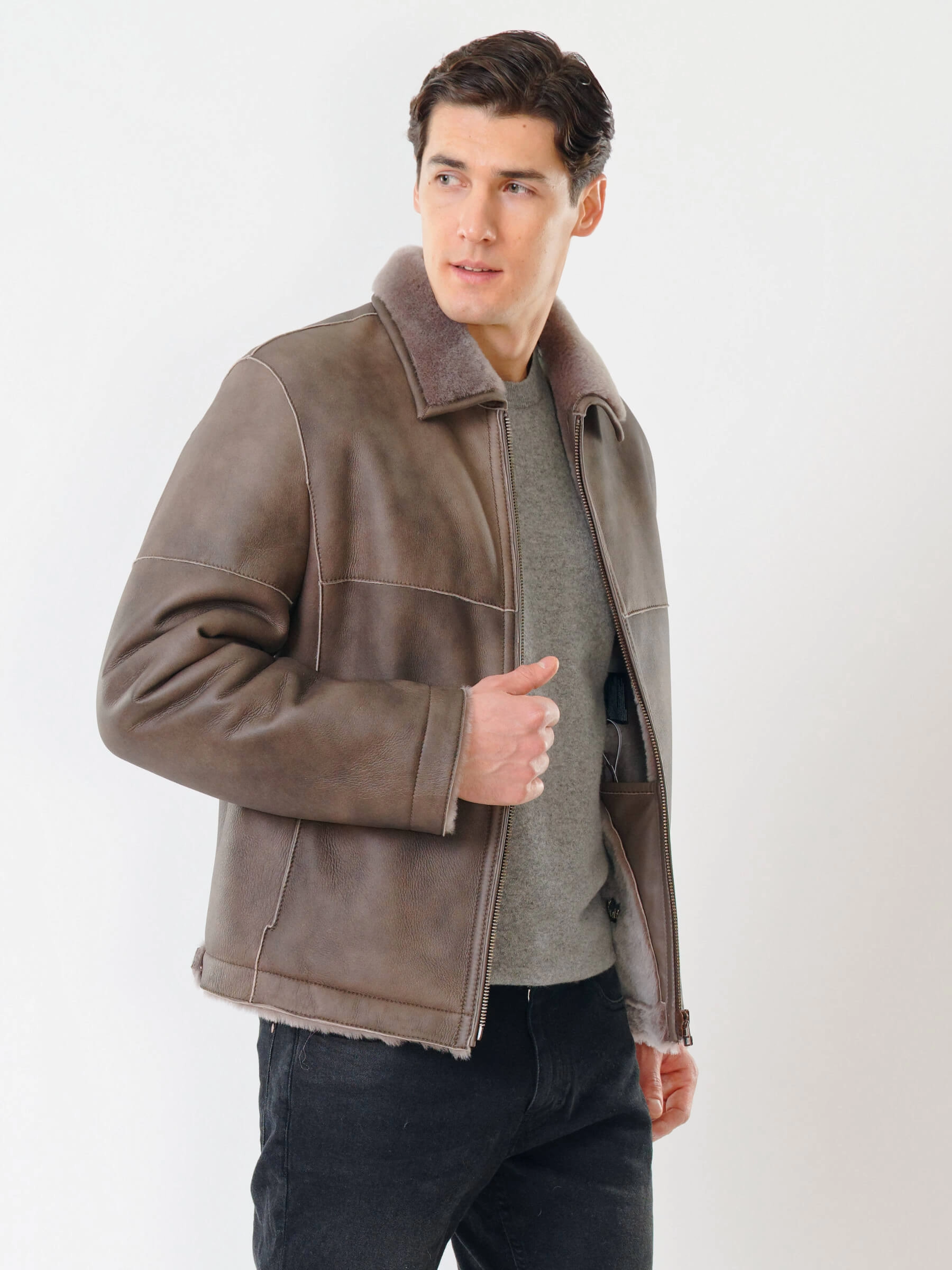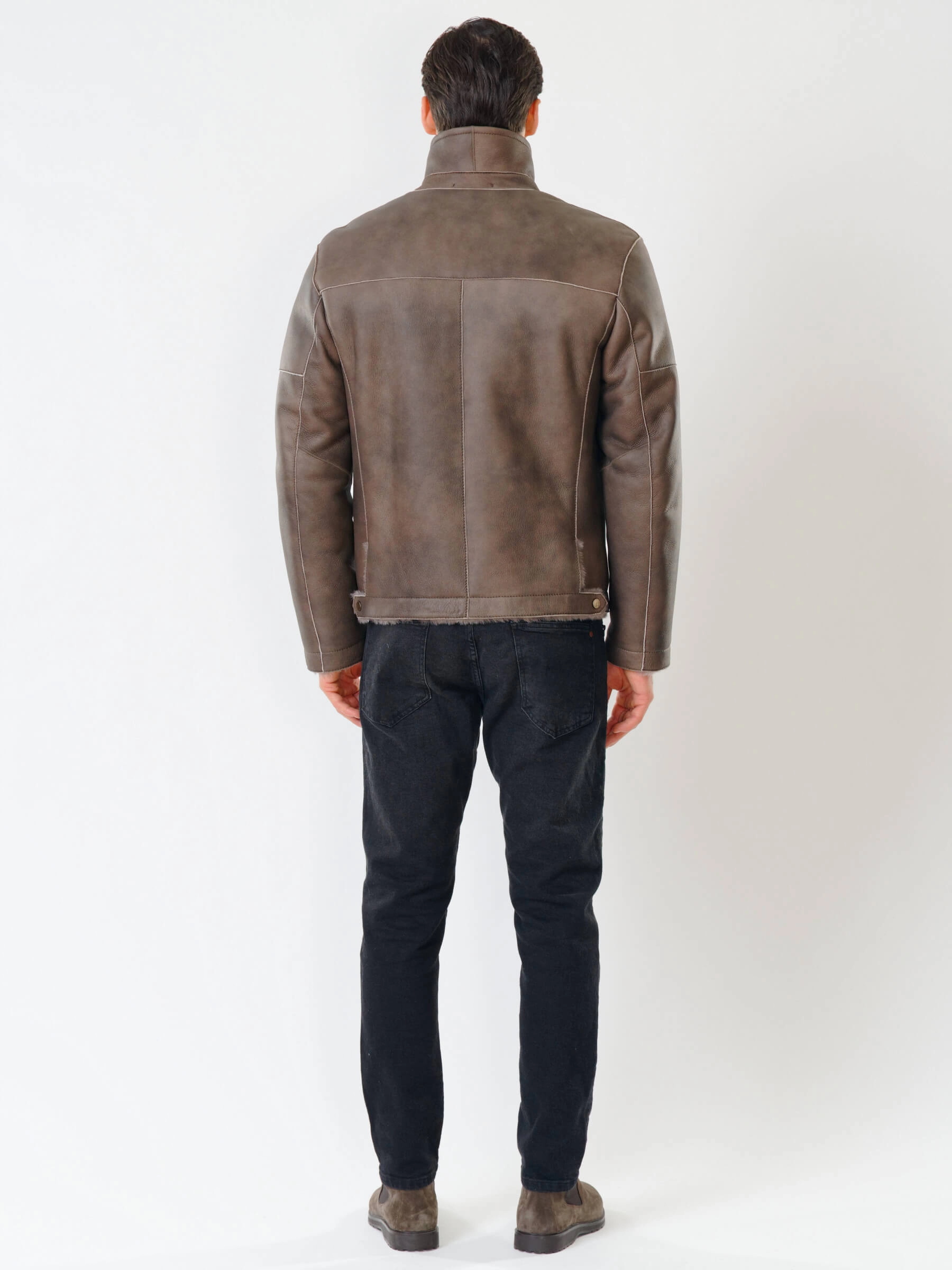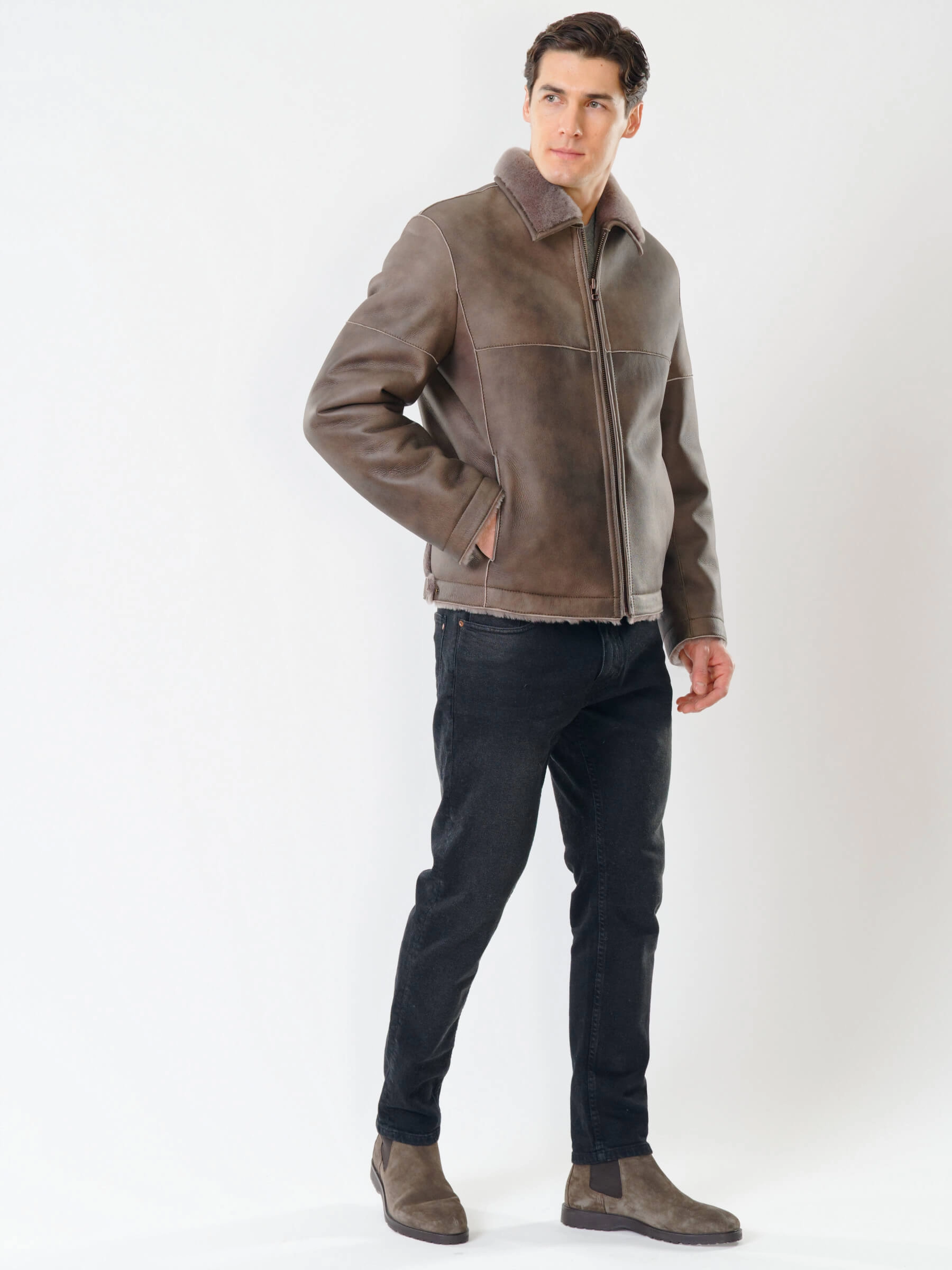 Товар короткая мужская дубленка 140, серо-коричневая, размер 50, артикул 70391 выполнен из овчина "мерино" с застежкой молния. Рассчитан на сезон: осень-зима. Длина изделия 70 см, силуэт прямой.