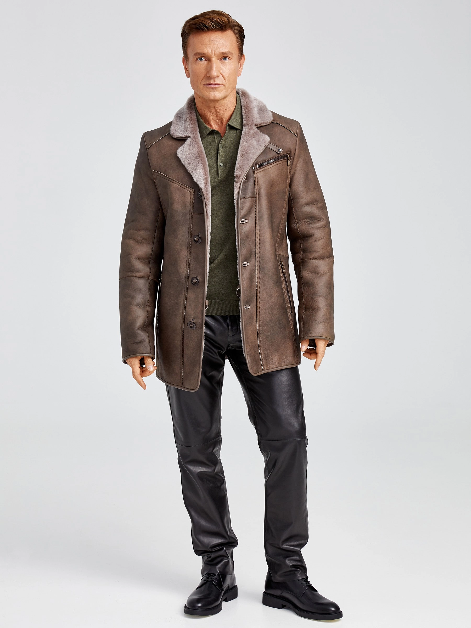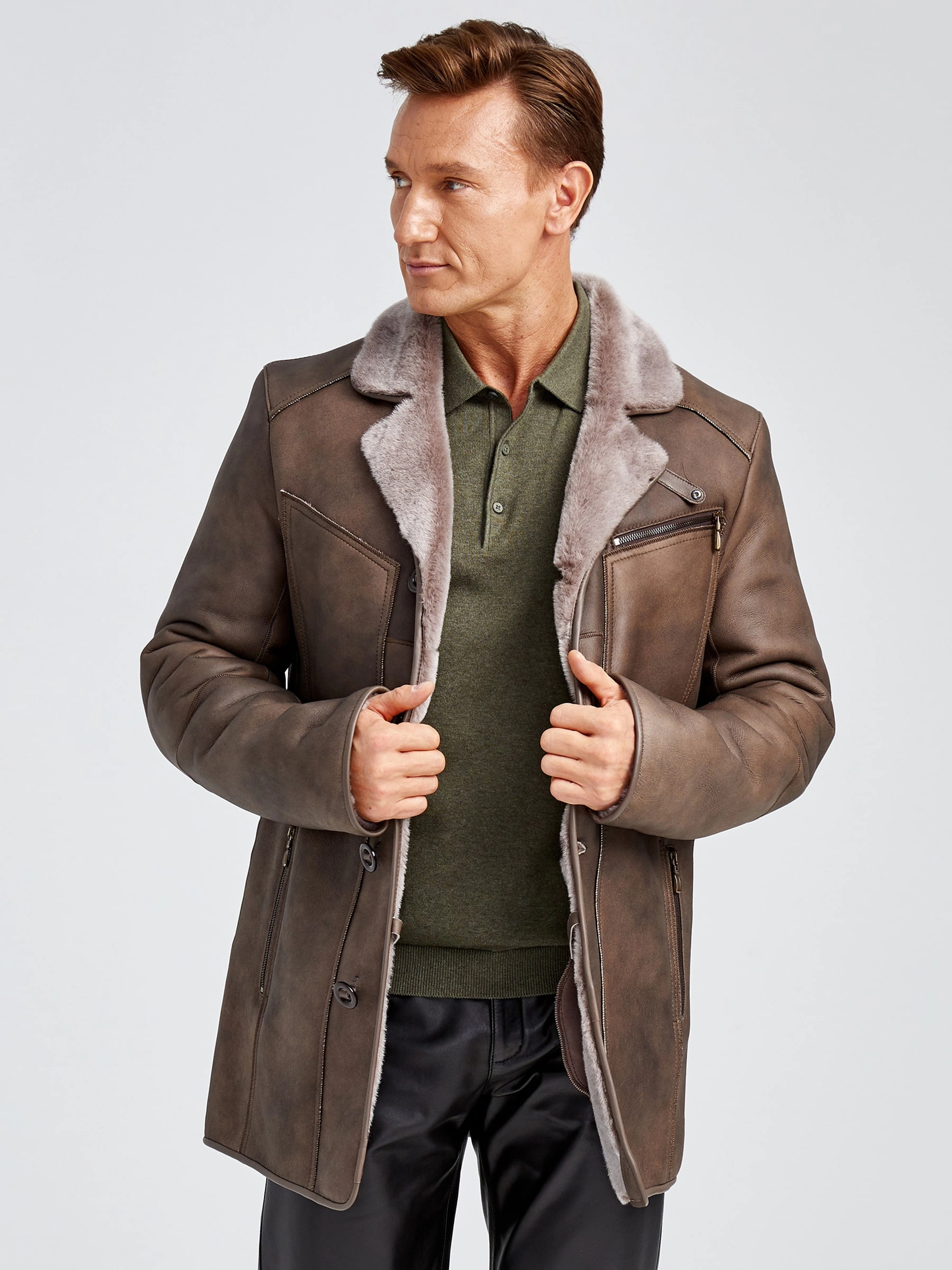 Современная мужская дублёнка, классической длины. Удобные карманы для ключей и документов. Новейшее защитное покрытие. Особо прочные нитки. Приятный на ощупь, максимально густой мех мериносной породы овец. Идеальные швы, продуманные и удобные элементы. Аккуратность во всей работе. Чёткая и очень удобная посадка по фигуре. Великолепная свобода движений. Абсолютный комфорт.
