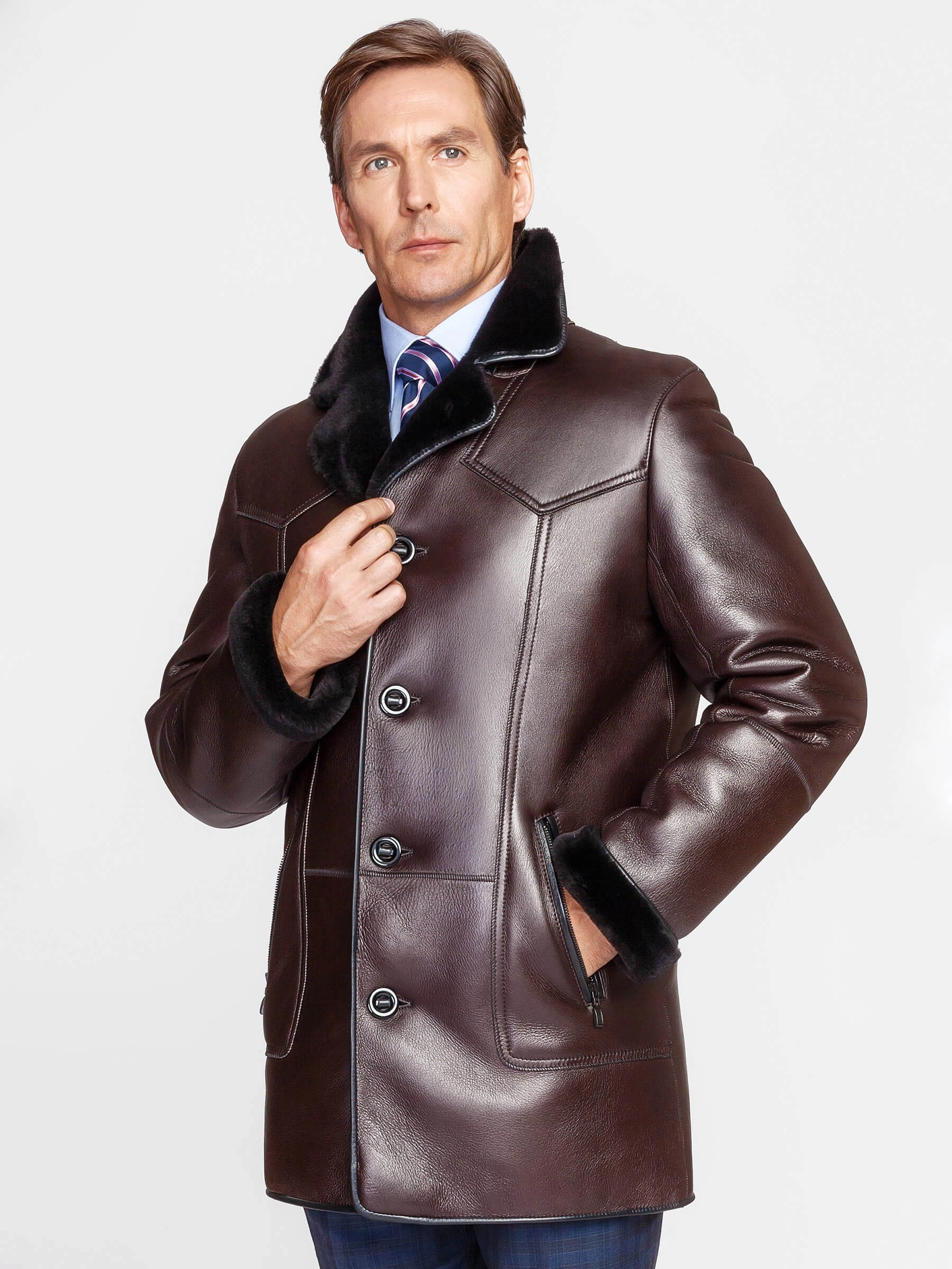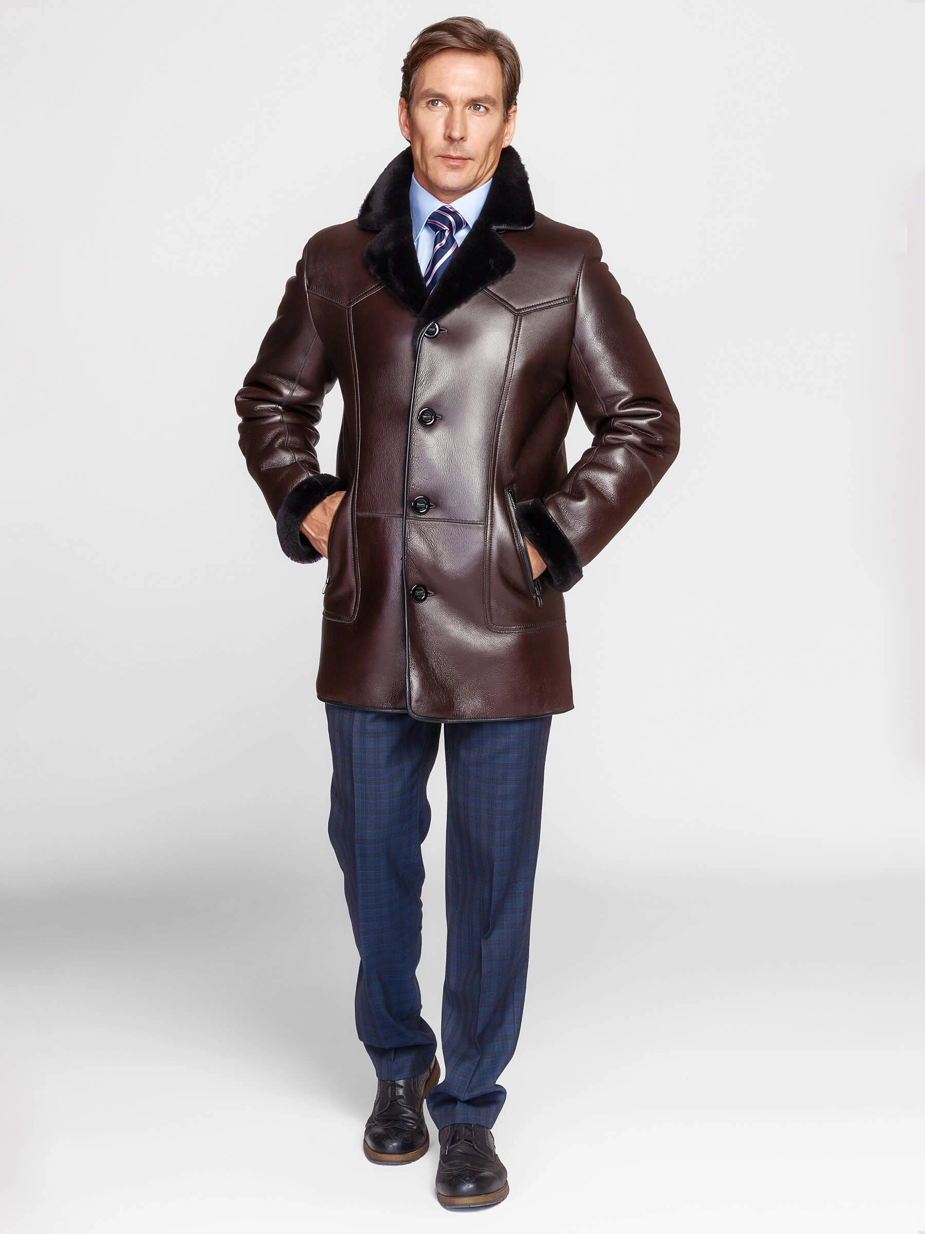Современная мужская дублёнка, закрывающая длину пиджака. Удобные внутренние карманы для хранения ключей и документов. На боковых карманах предусмотрены застёжки-молнии. Борта усилены кожаными вставками. Новейшее устойчивое защитное покрытие предохраняет от засаливания поверхности. Особо-прочные нитки. Приятный на ощупь, густой, красивый мех.