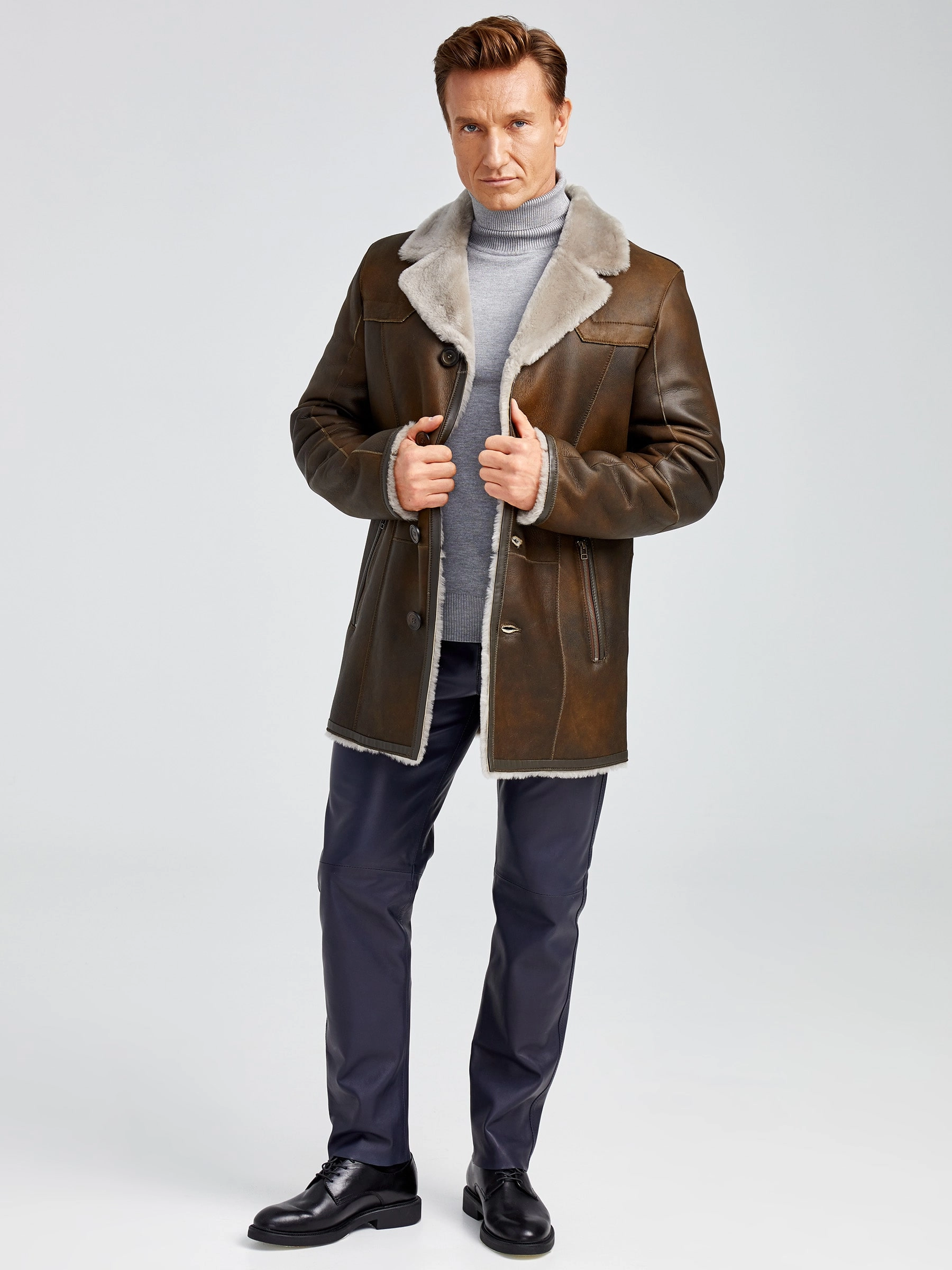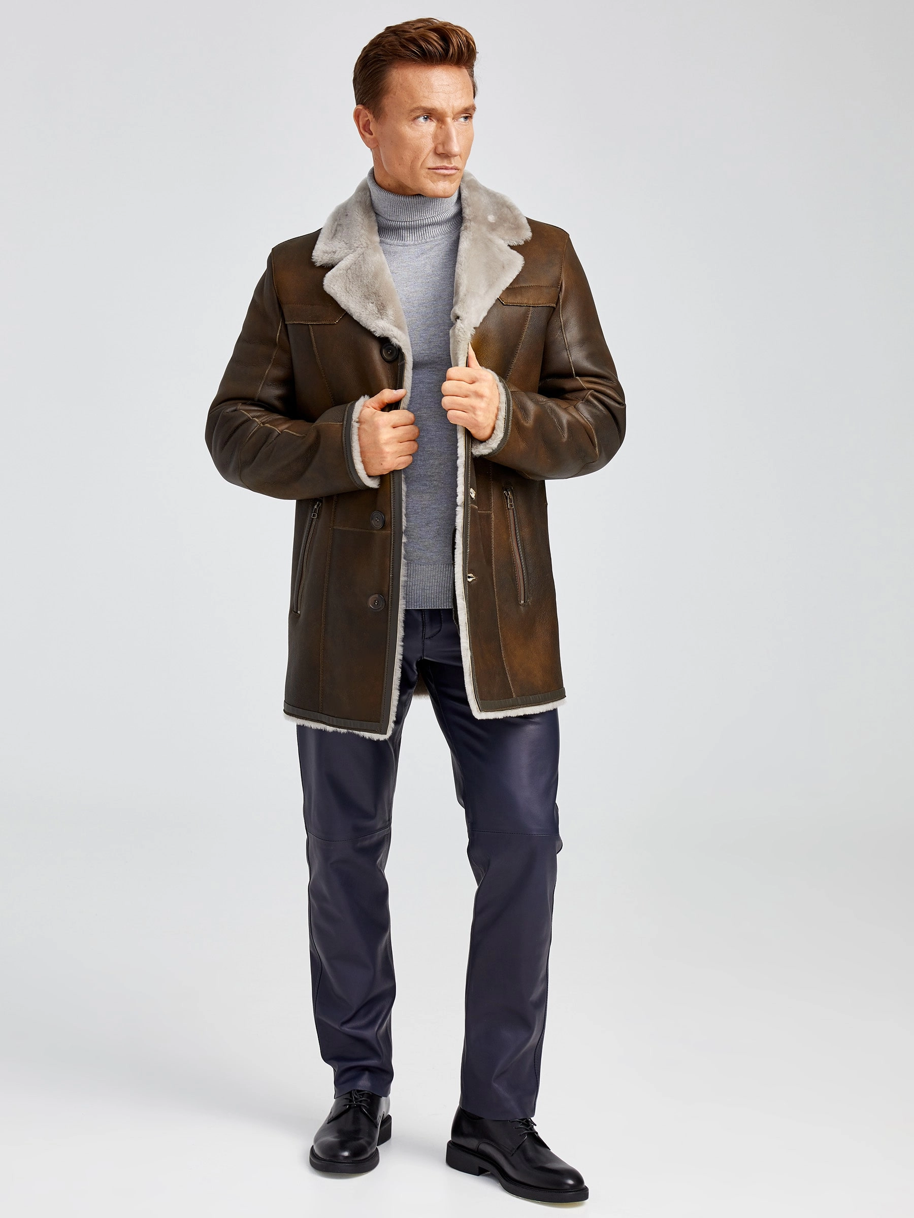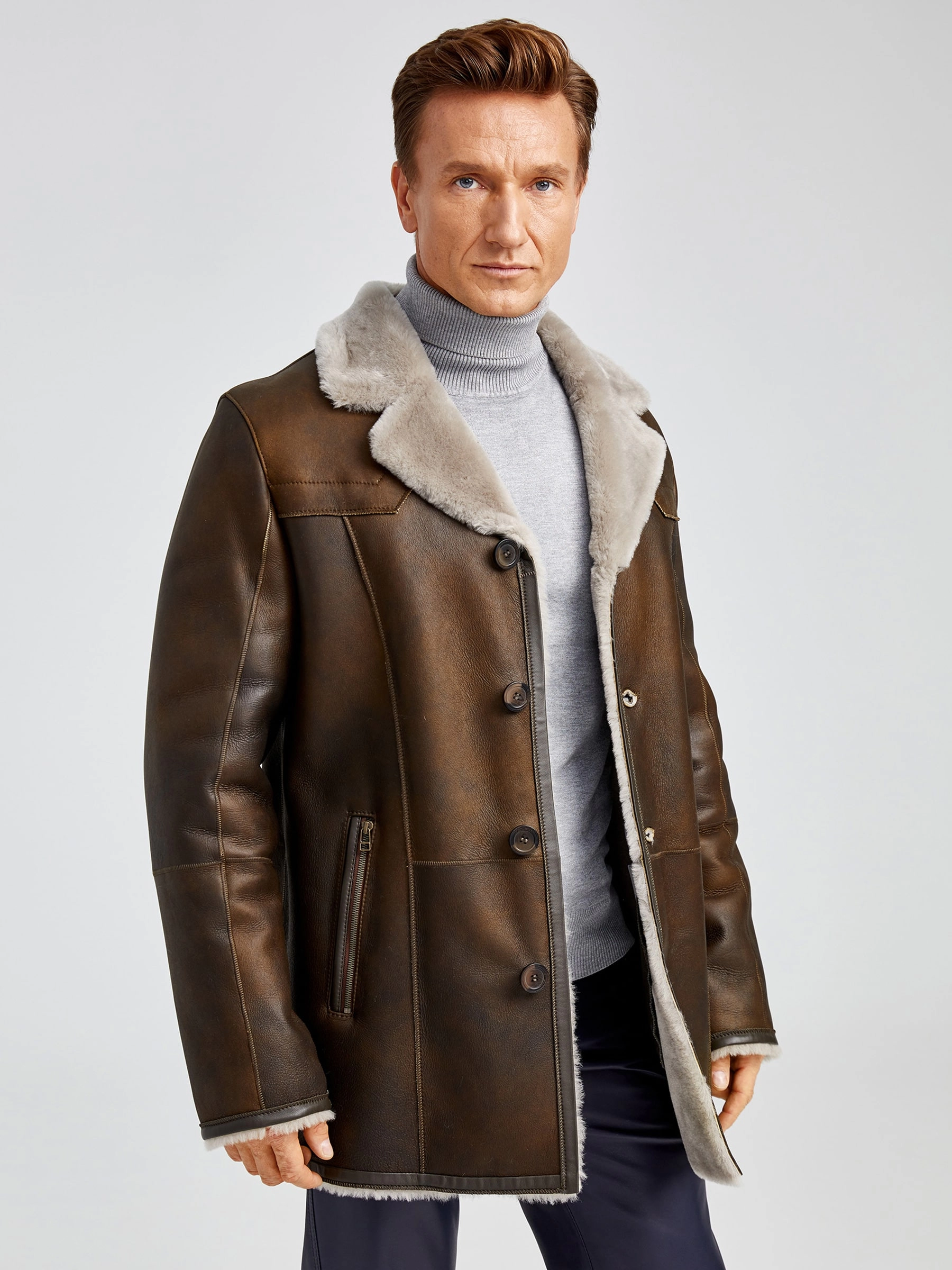 Современная мужская дублёнка, классической длины. Удобные карманы для ключей и документов. Верхняя застёжка закрывает горловину. Новейшее защитное покрытие. Особо прочные нитки. Приятный на ощупь, максимально густой мех мериносной породы овец. Идеальные швы, продуманные и удобные элементы. Аккуратность во всей работе. Чёткая и очень удобная посадка по фигуре. Великолепная свобода движений. Абсолютный комфорт.