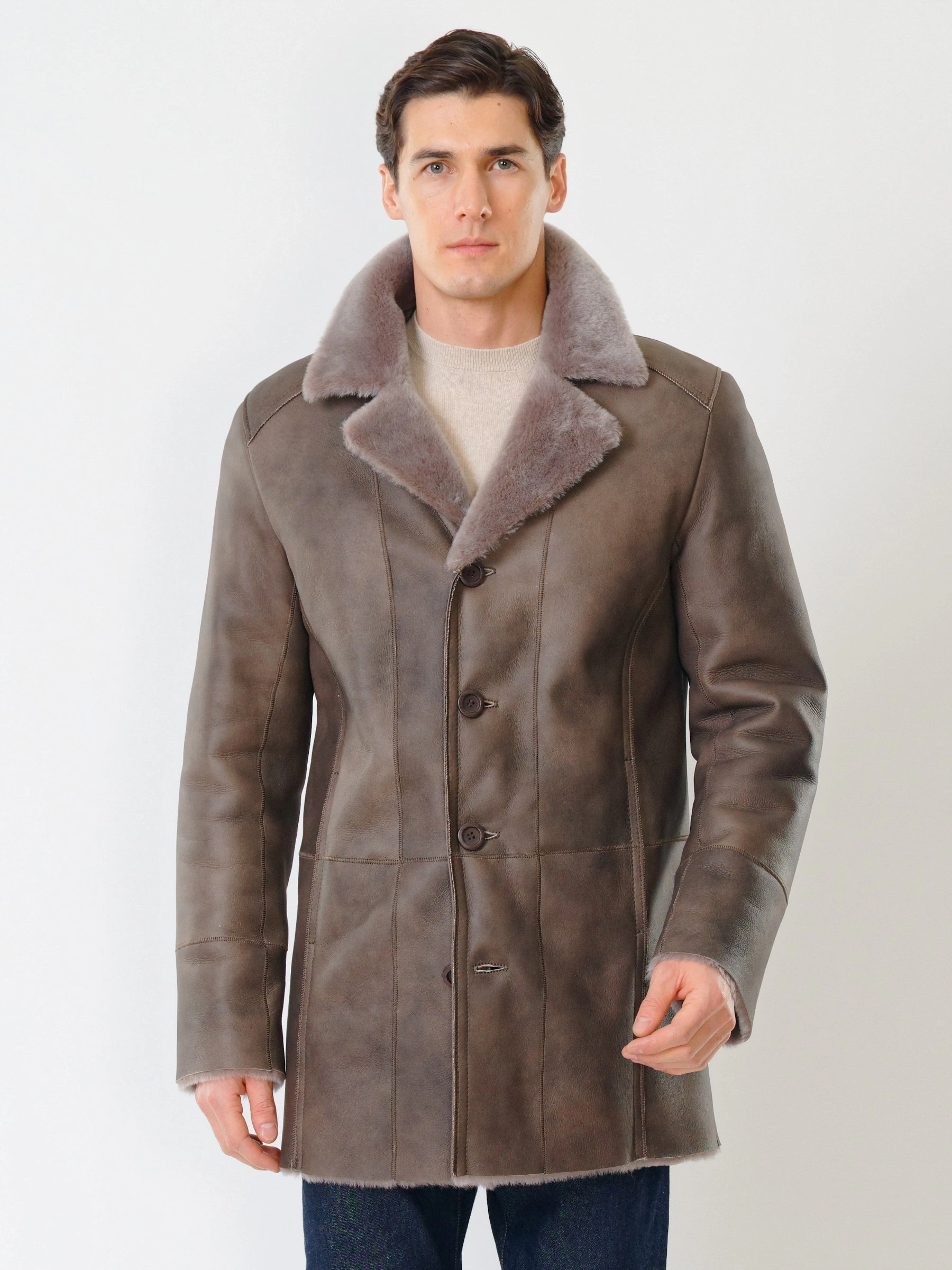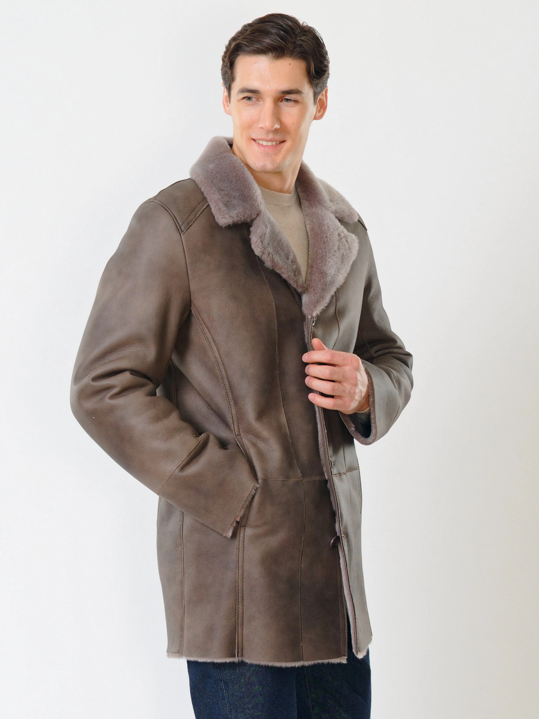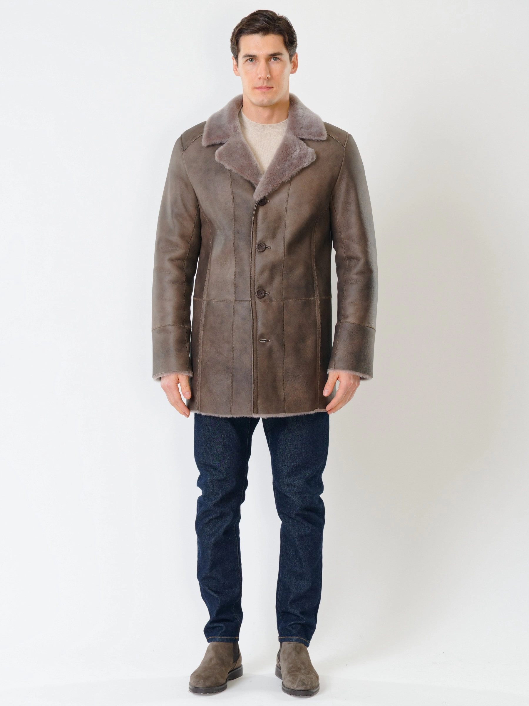 Дубленка классическая мужская 412, серо-коричневая, размер 50, артикул 70451