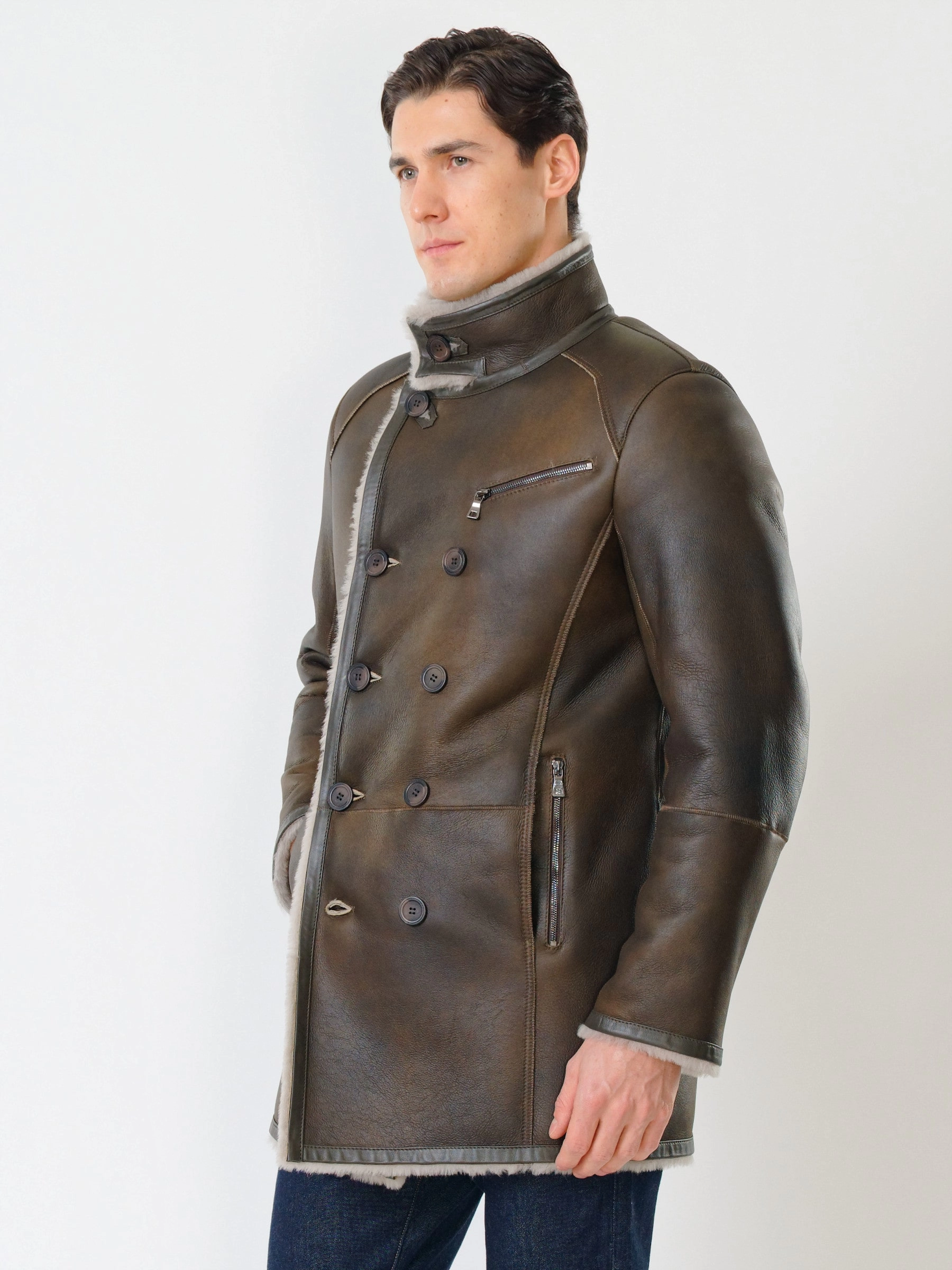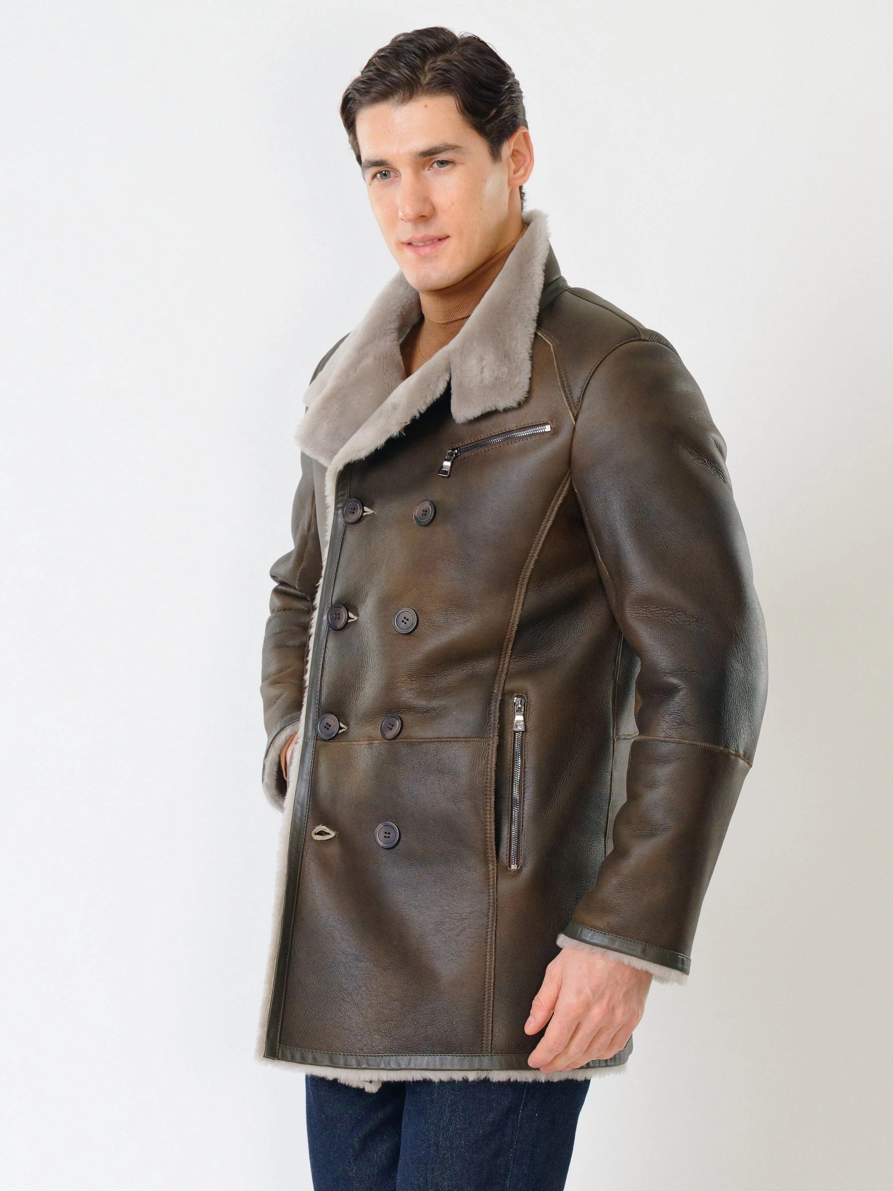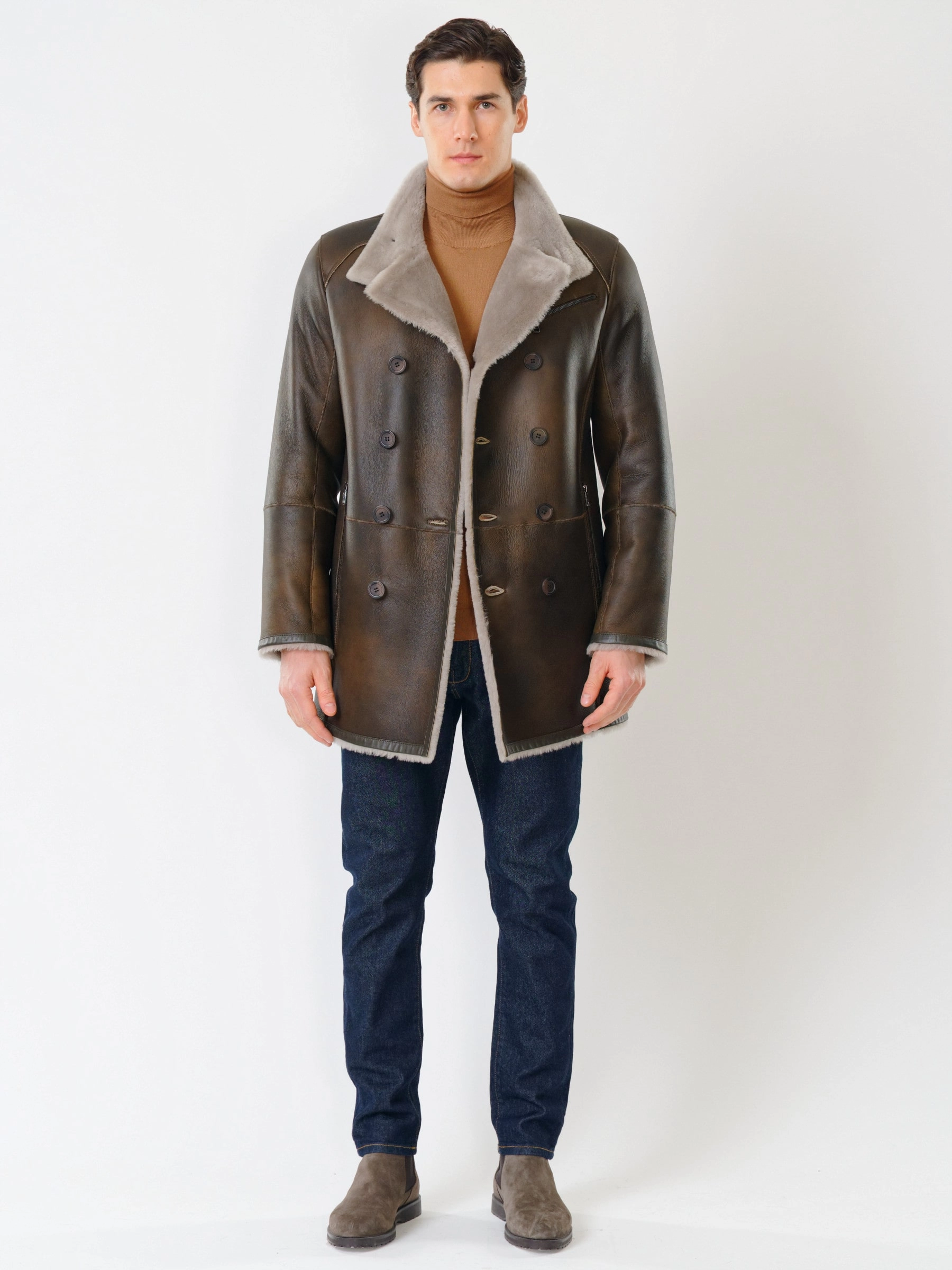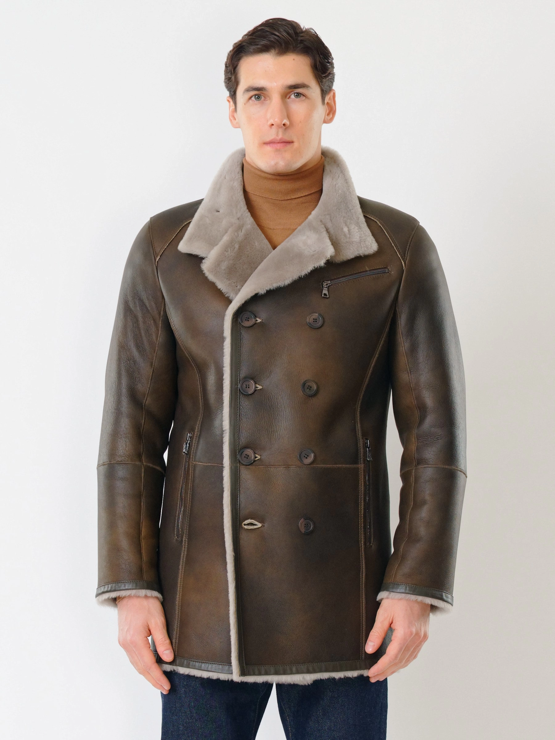 Стильная двубортная мужская дублёнка. Овчина мериносной породы овец высшего качества. Максимально густой мех прекрасно защитит от любого мороза. Новейшее устойчивое защитное покрытие. Воротник-трансформер. Удобные карманы для ключей и документов. Чёткая, выверенная посадка по фигуре. Безупречная работа наших портных.
