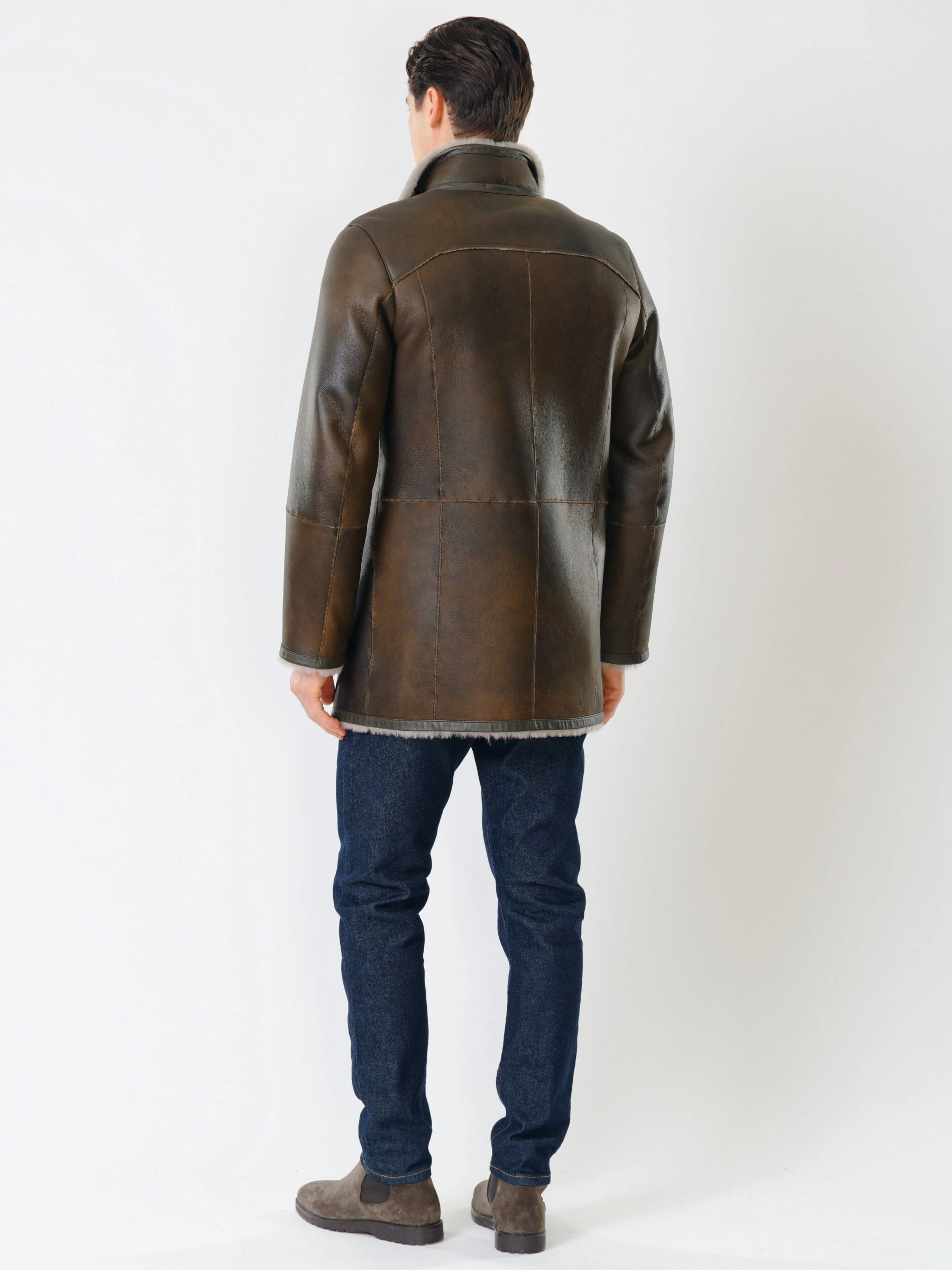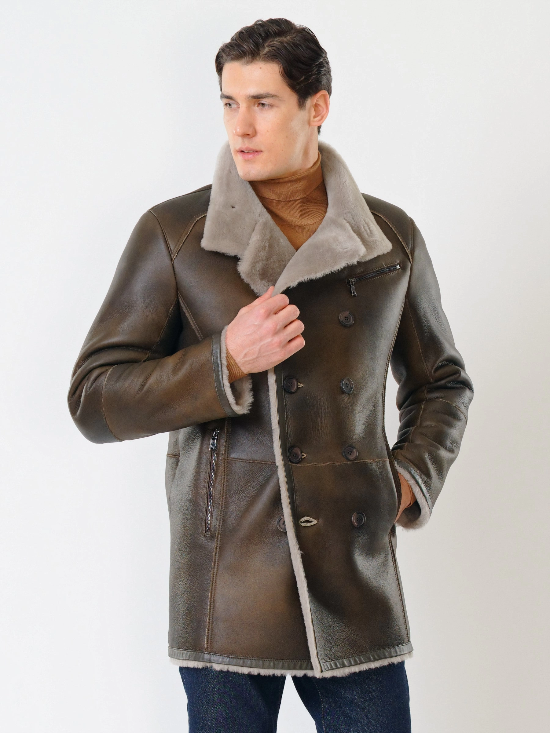 Классическая двубортная мужская дубленка 414, оливковая, размер 48, артикул 70460