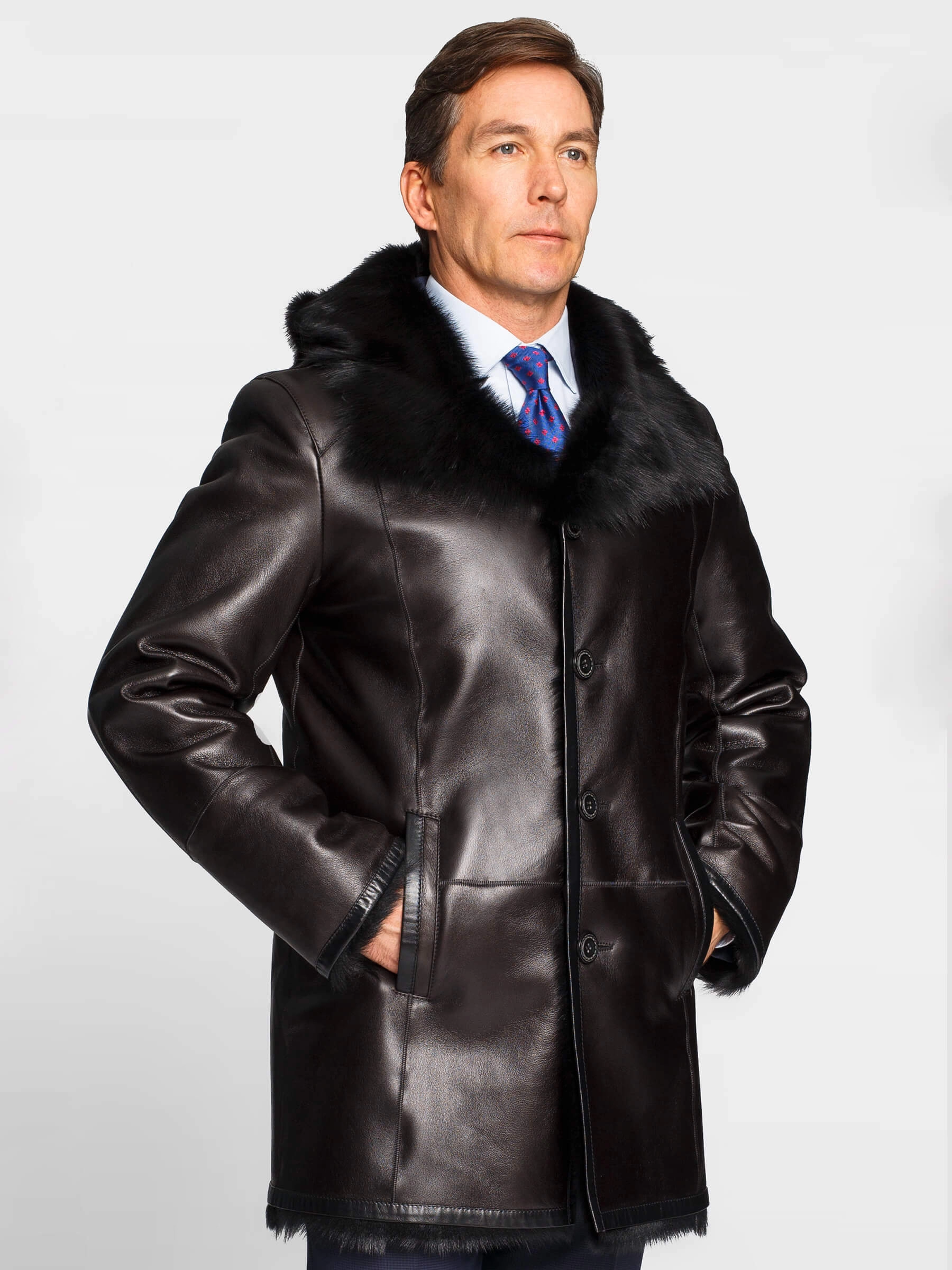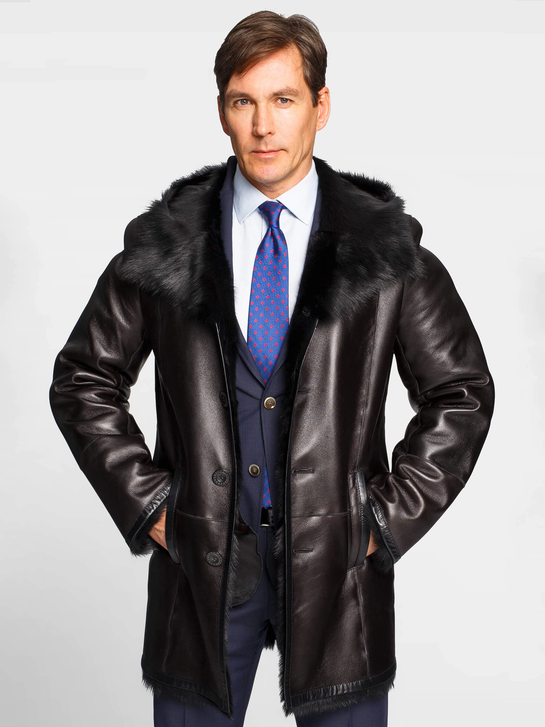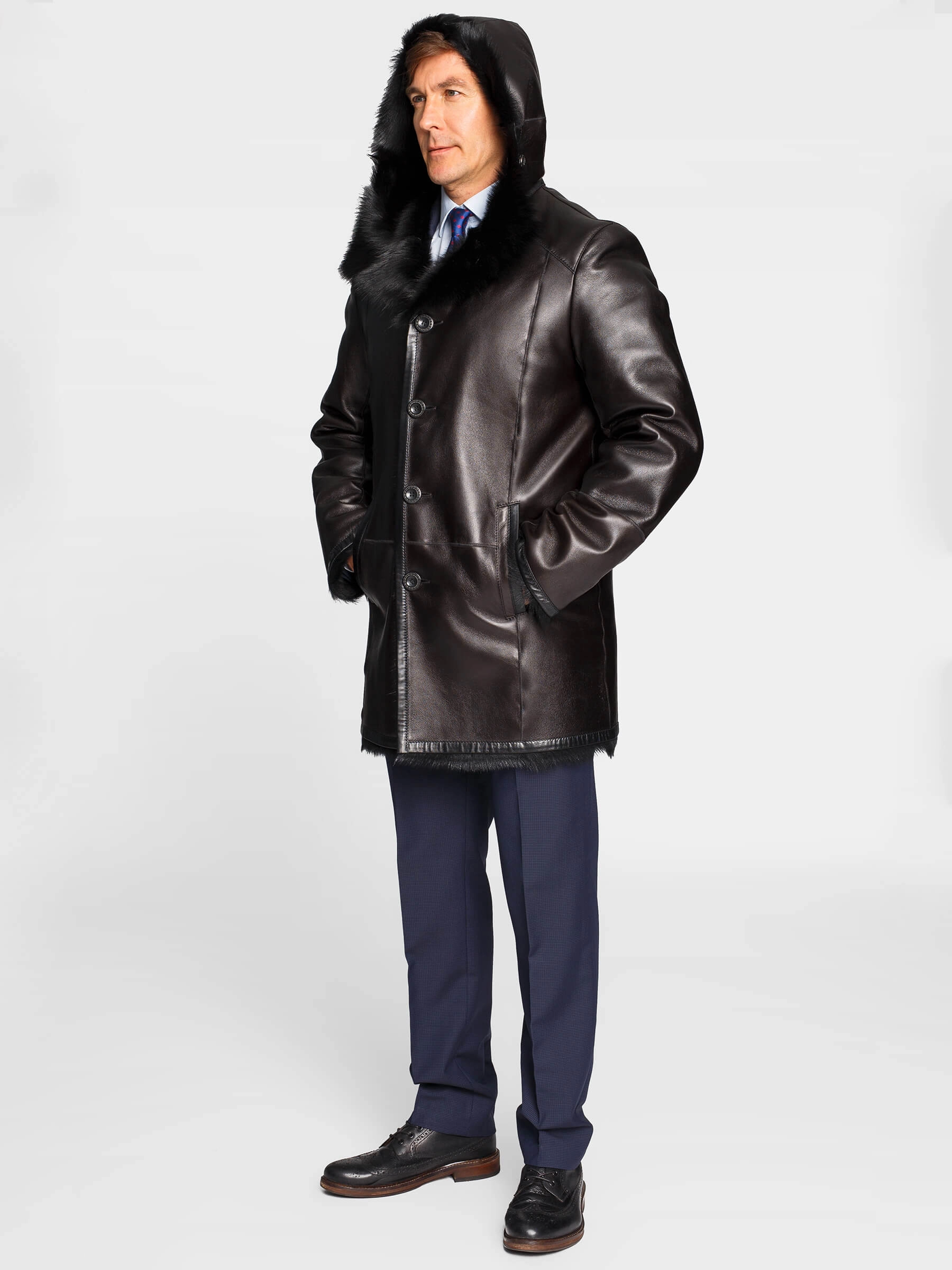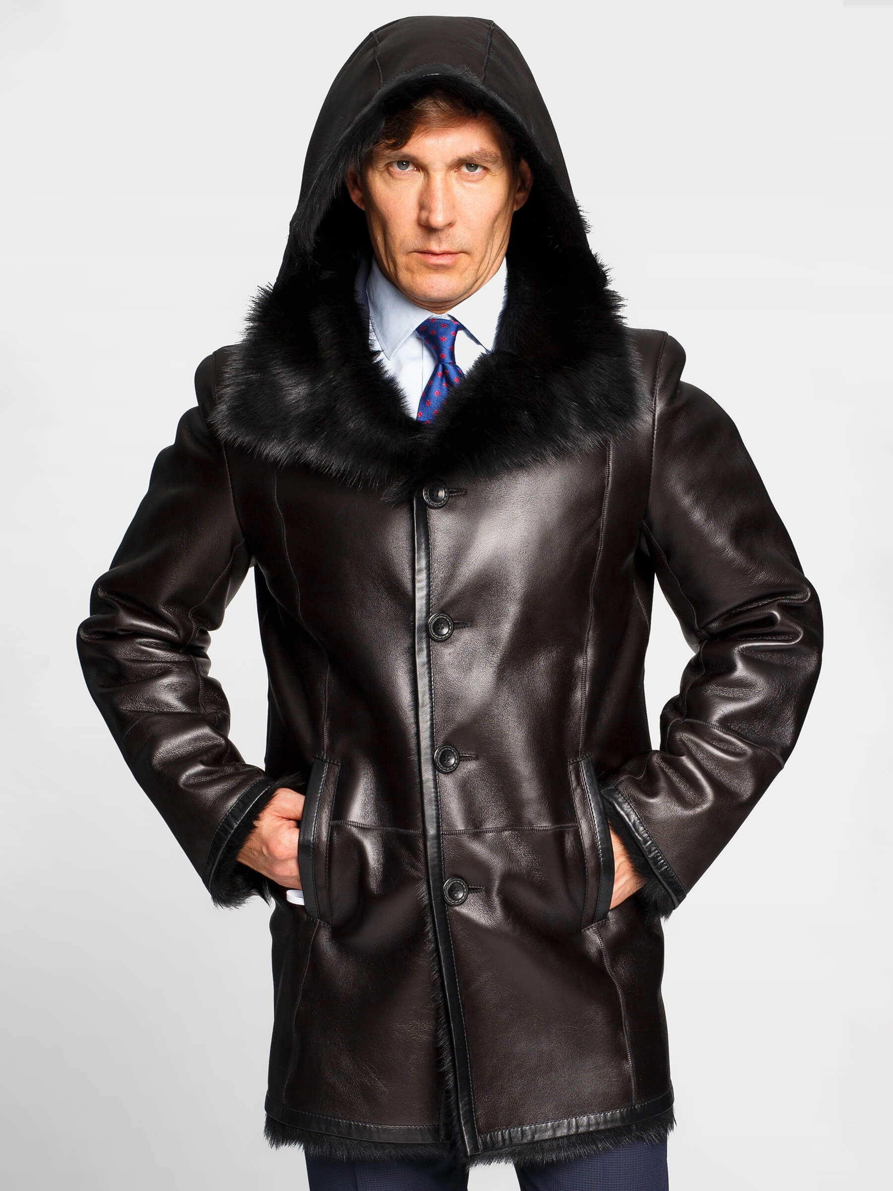 Мужское меховое полупальто с капюшоном. Мех тосканской овчины с густым высоким шелковистым волосом. Новейшее защитное покрытие. Великолепное сочетание, как с классическим костюмом, так и с одеждой в стиле сasual. Прямой силуэт. Объём капюшона регулируется шнуром с фиксаторами. На капюшоне и на лацкане предусмотрены дополнительные застёжки, закрывающие горловину. Рукав втачной двухшовный. Манжет-отворот регулирует длину рукава. Эргономичные боковые карманы-листочки. Предусмотрен внутренний карман для документов. Карманы-листочки, низ манжет, низ модели и борта полочек усилены настрочными кожаными кантами для предотвращения деформаций. Обеспечена чёткая комфортная посадка по фигуре и прекрасная свобода движений.
