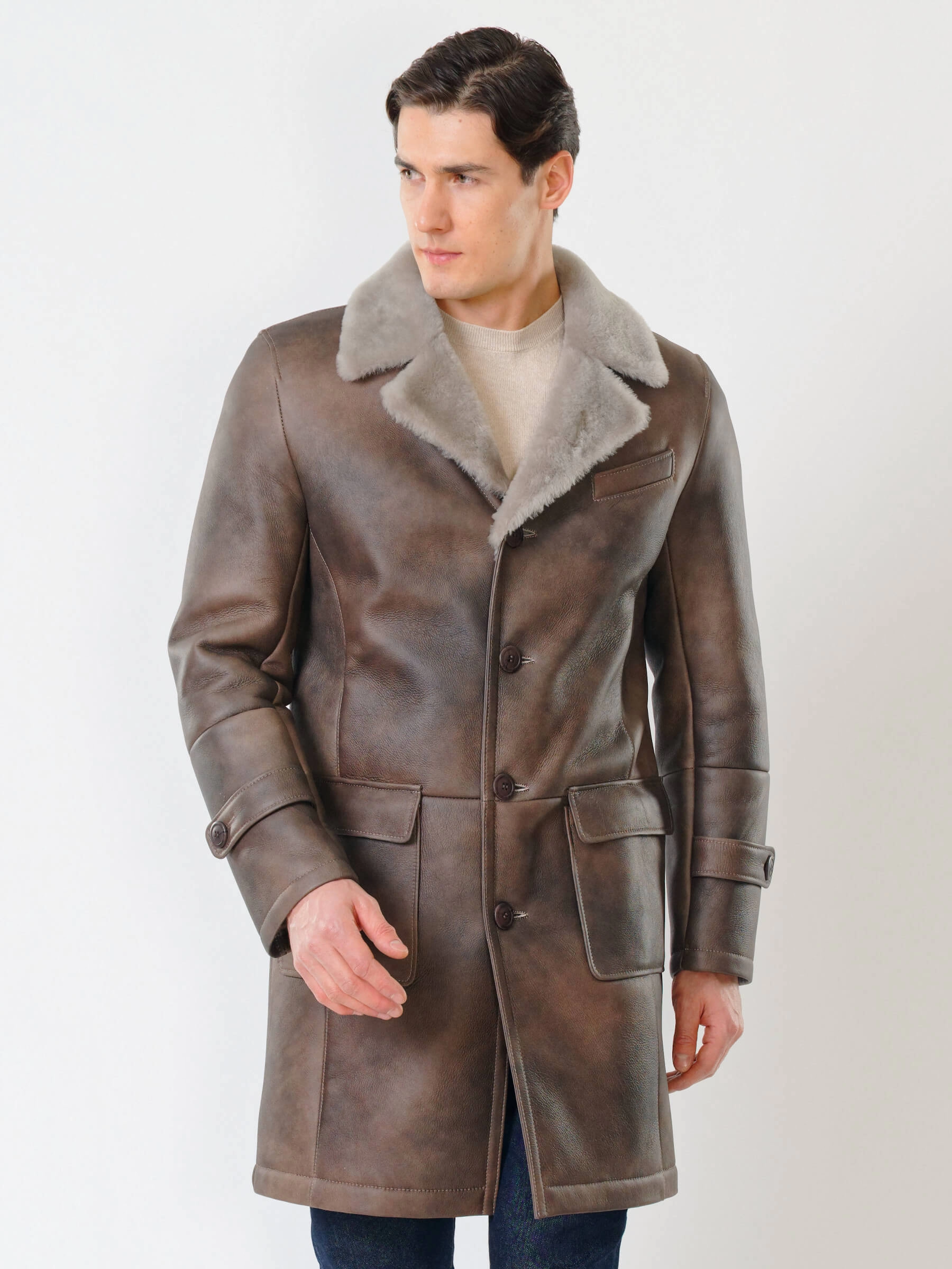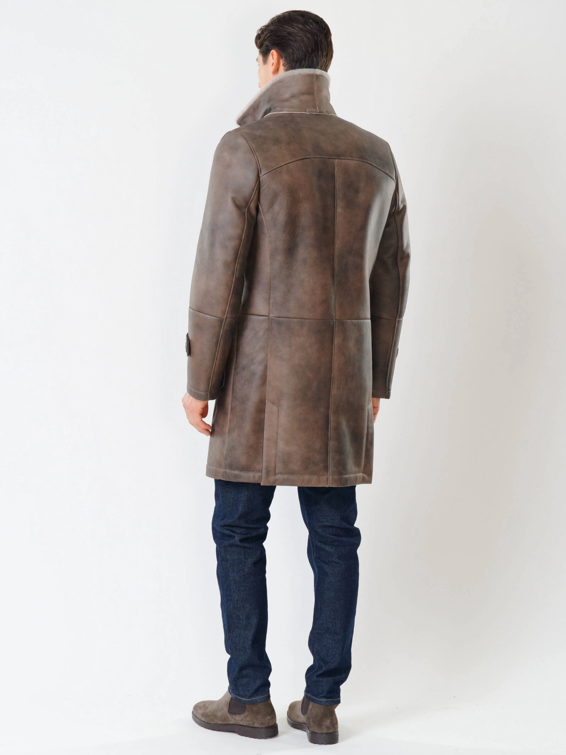 Длинная классическая мужская дубленка 419, серо-коричневая, размер 48, артикул 70470