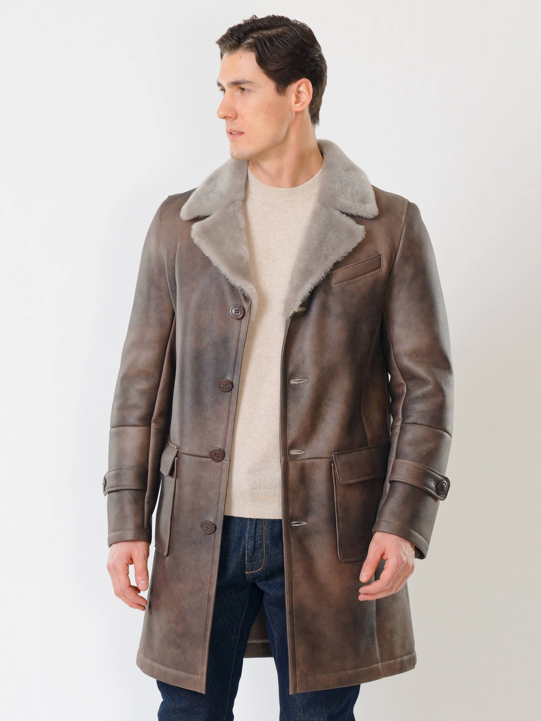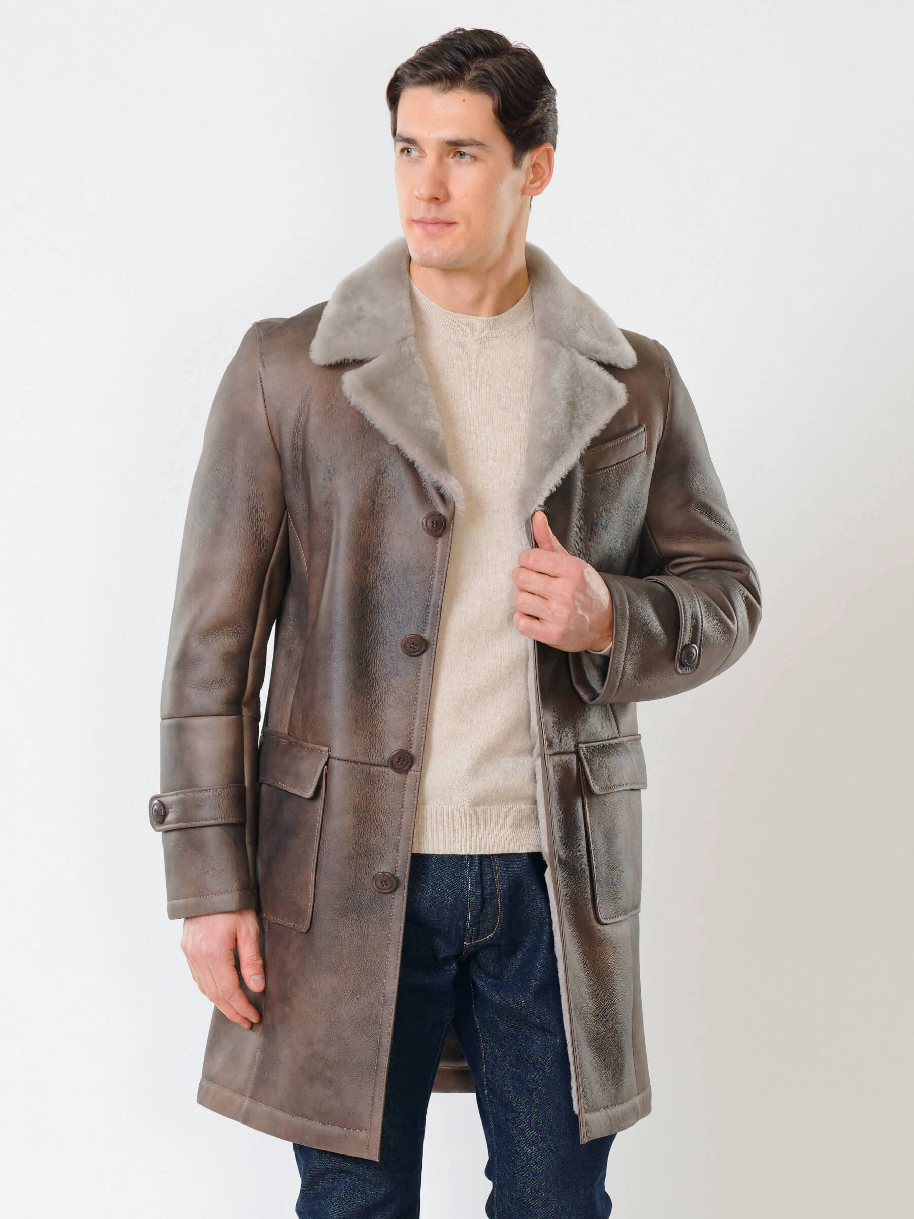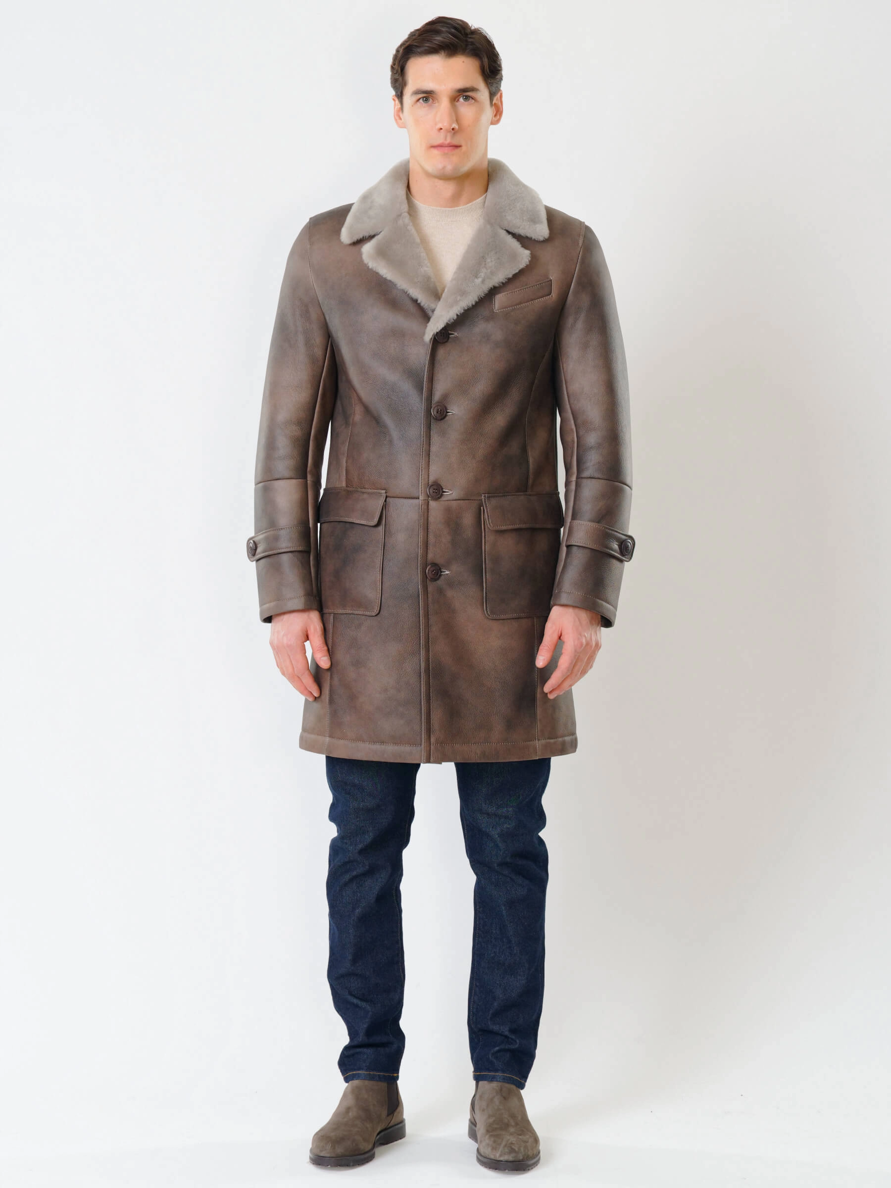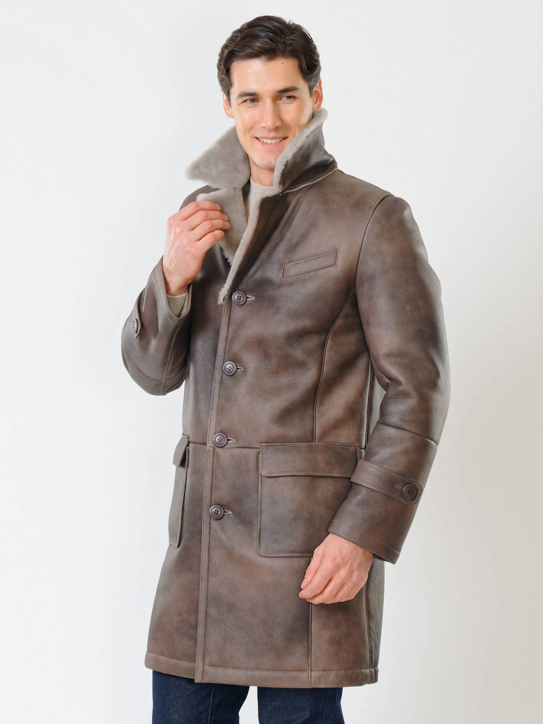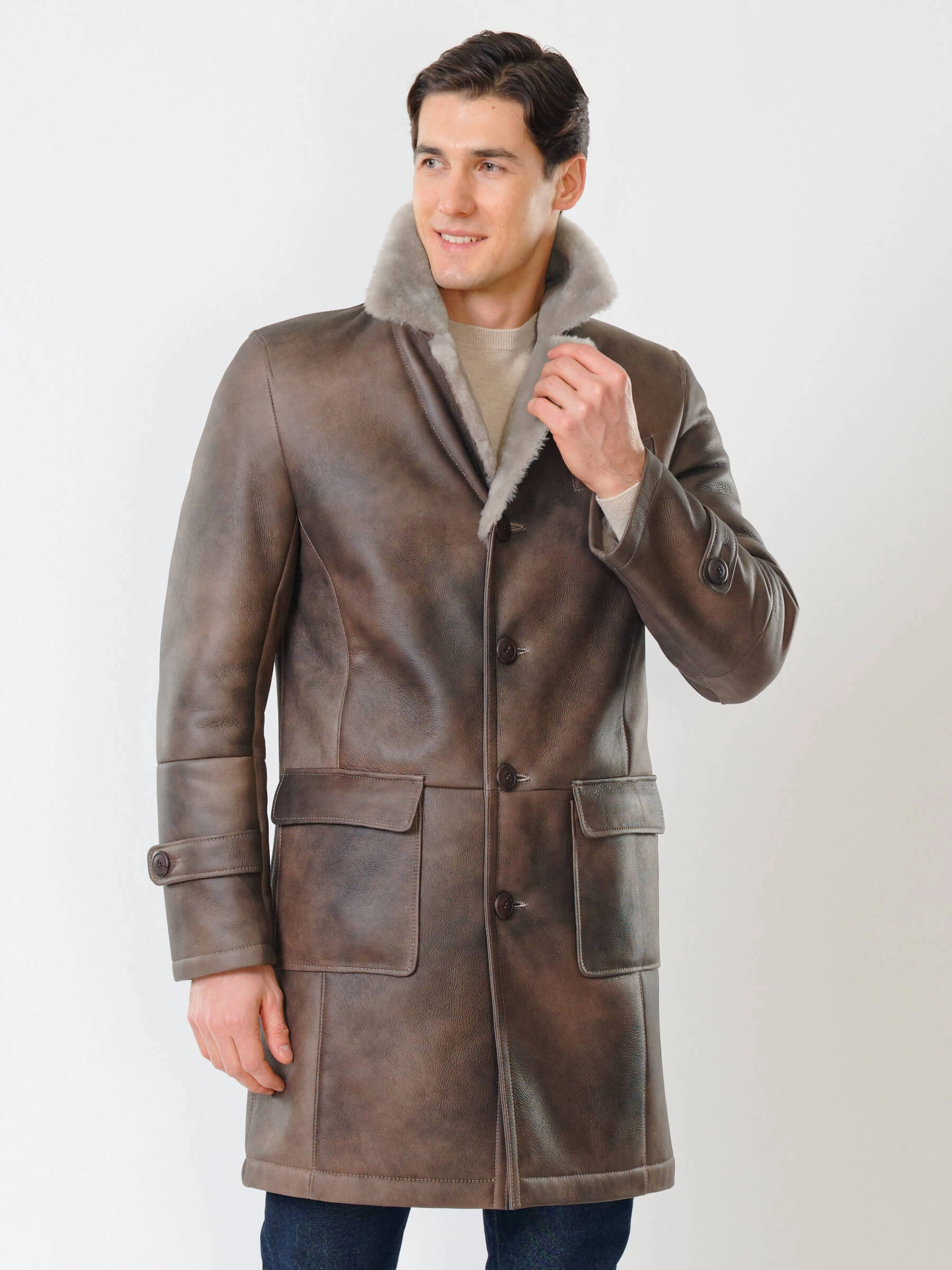 Мужское меховое пальто. Новейшее защитное покрытие. Особо прочные нитки. Приятный на ощупь, густой, красивый мех мериносной породы овец. Идеальные швы, продуманные и удобные элементы. Аккуратность во всей работе. Чёткая и очень удобная посадка по фигуре. Великолепная свобода движений. Абсолютный комфорт.