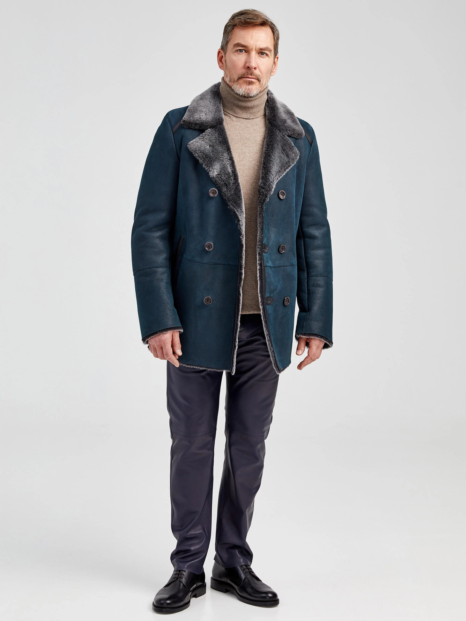 Стильная двубортная мужская дублёнка. Мериносная овчина высшего качества. Максимально густой мех прекрасно защитит от любого мороза. Новейшее устойчивое защитное покрытие. Английский воротник. Длина рукавов регулируется отворотом манжет. Чёткая, выверенная посадка по фигуре. Безупречная работа наших портных.