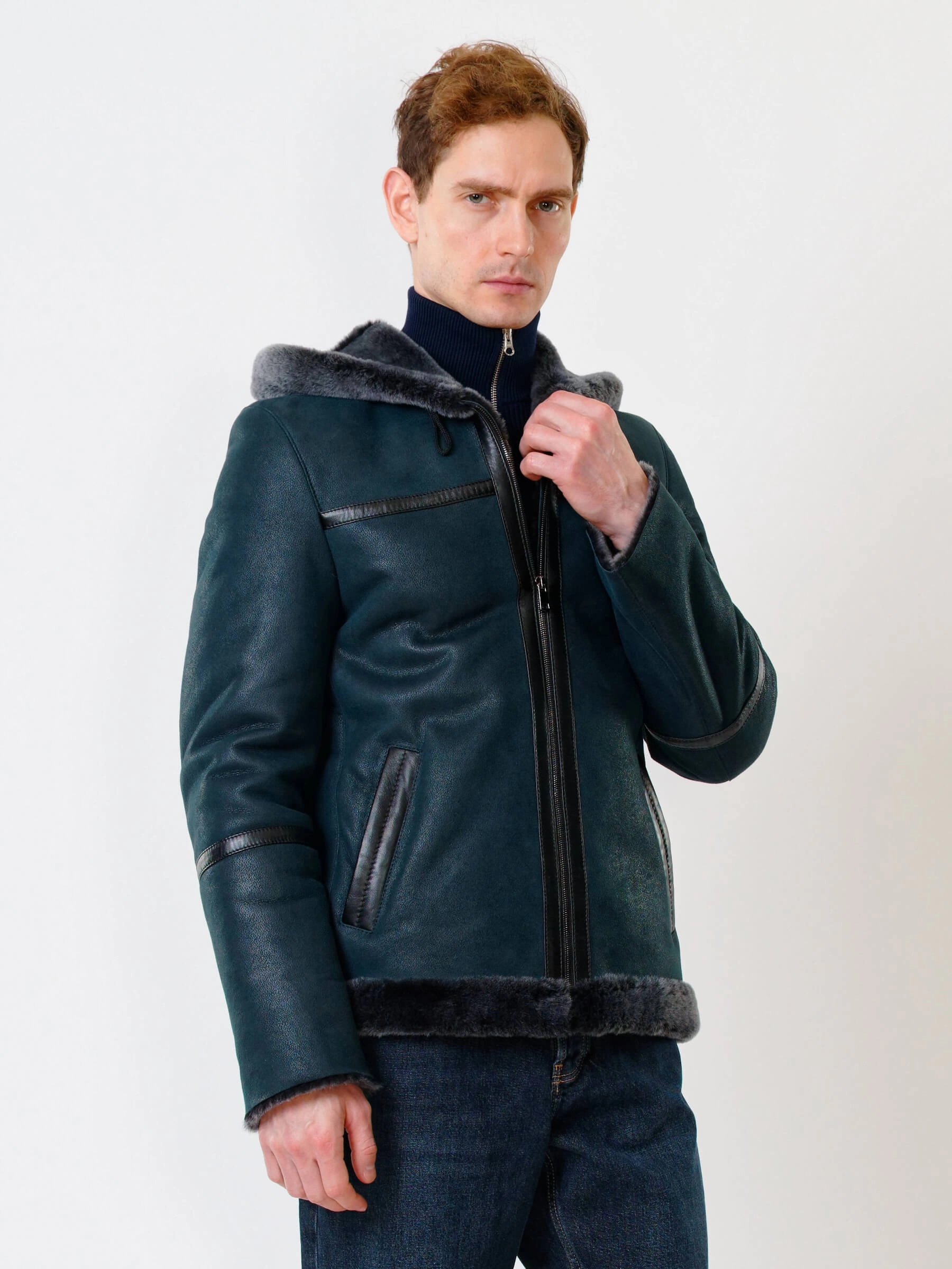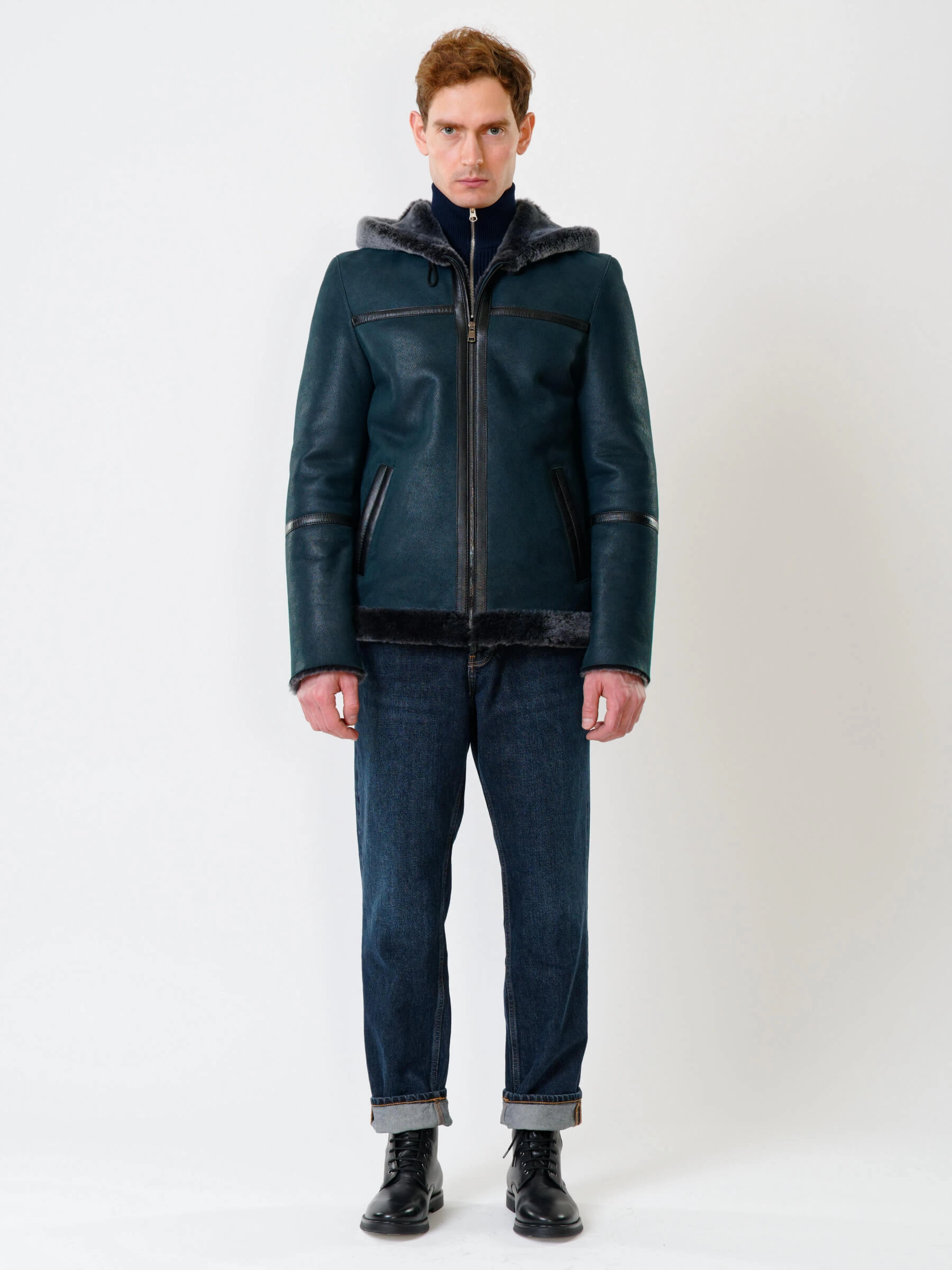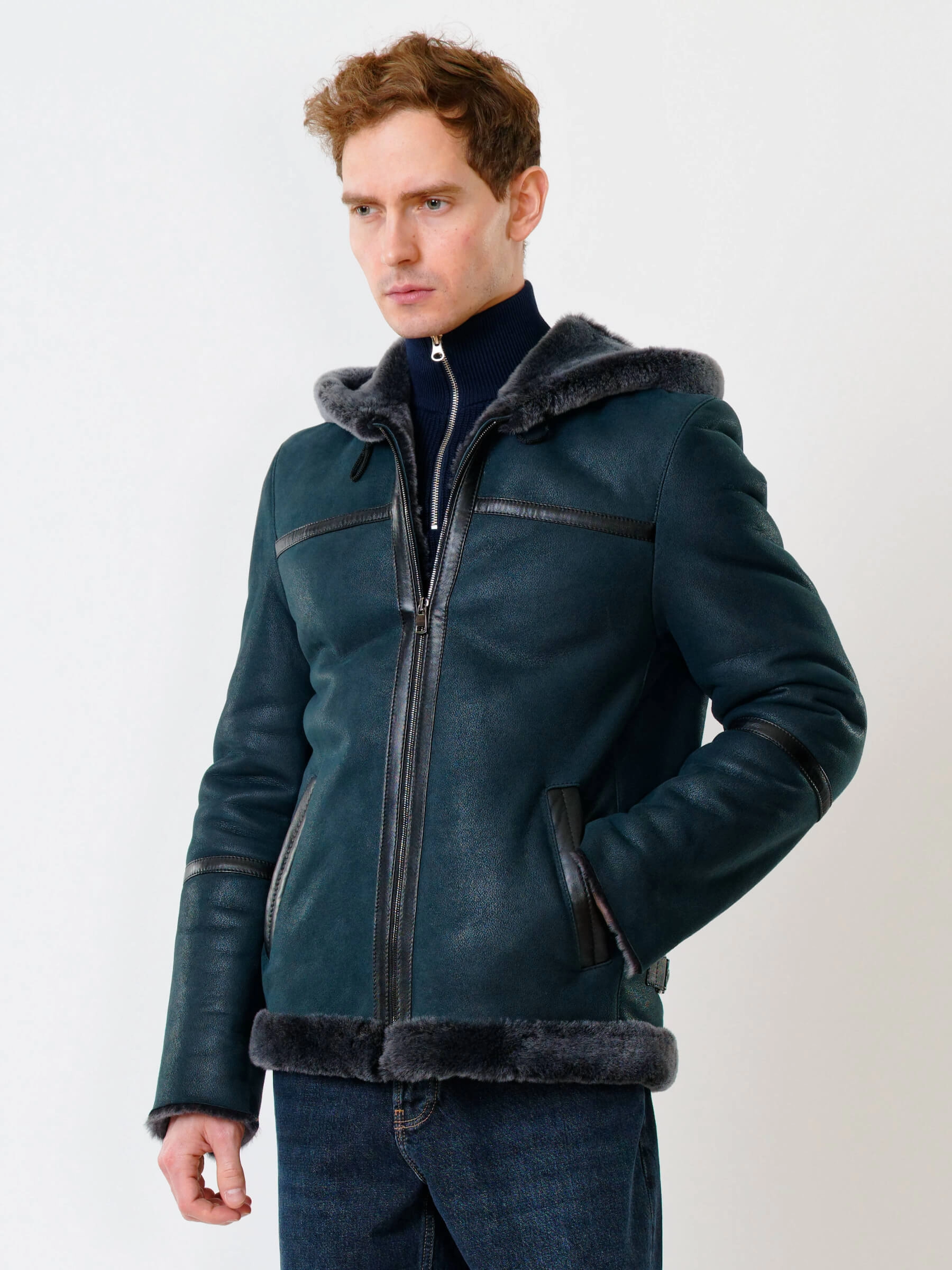 Короткая мужская дубленка с капюшоном премиум класса 425, синяя, размер 50, артикул 70320