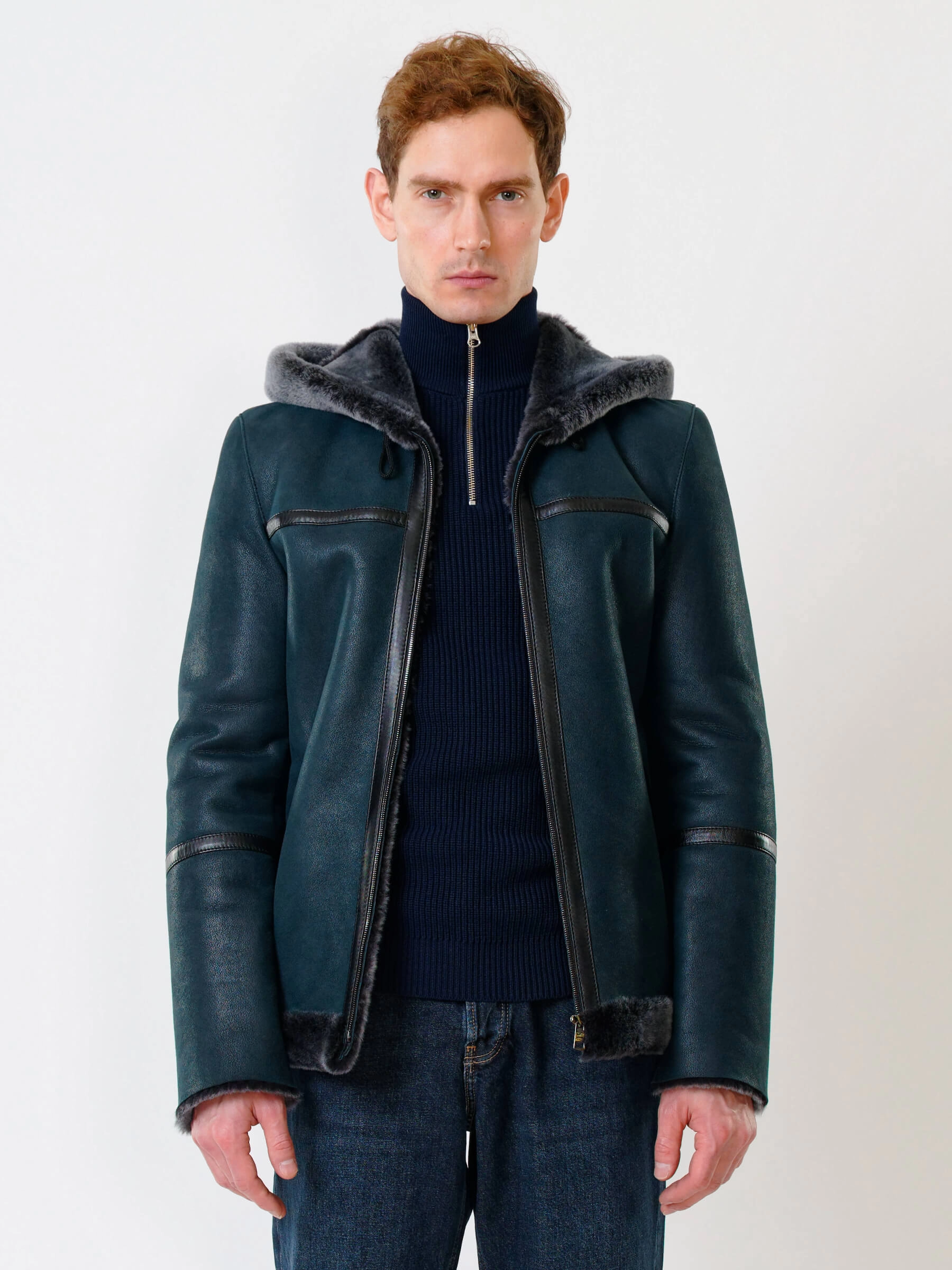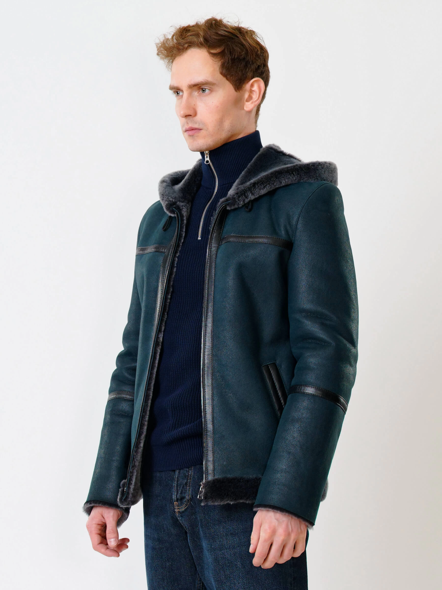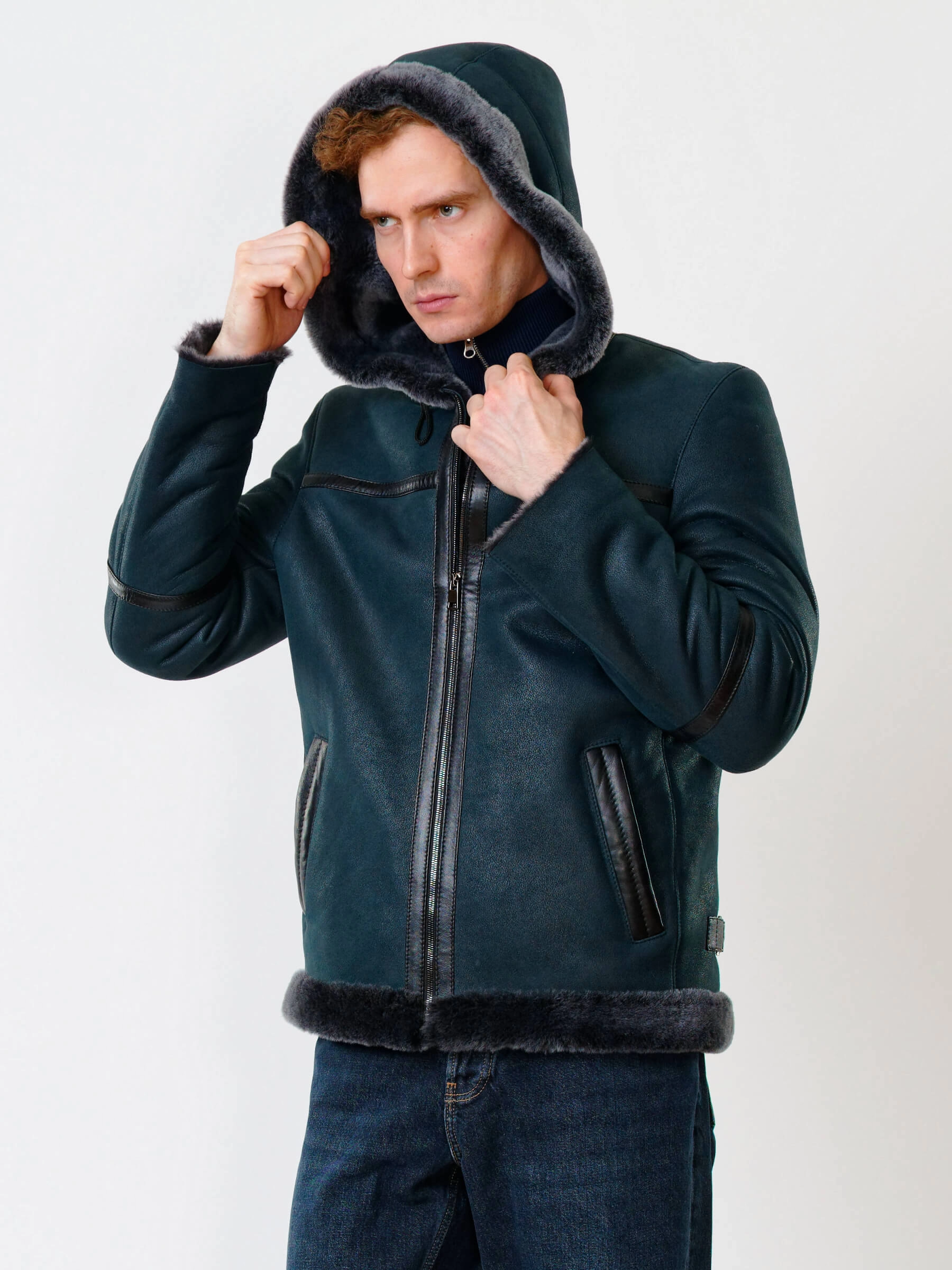 Короткая мужская дубленка с капюшоном премиум класса 425, синяя, размер 50, артикул 70320