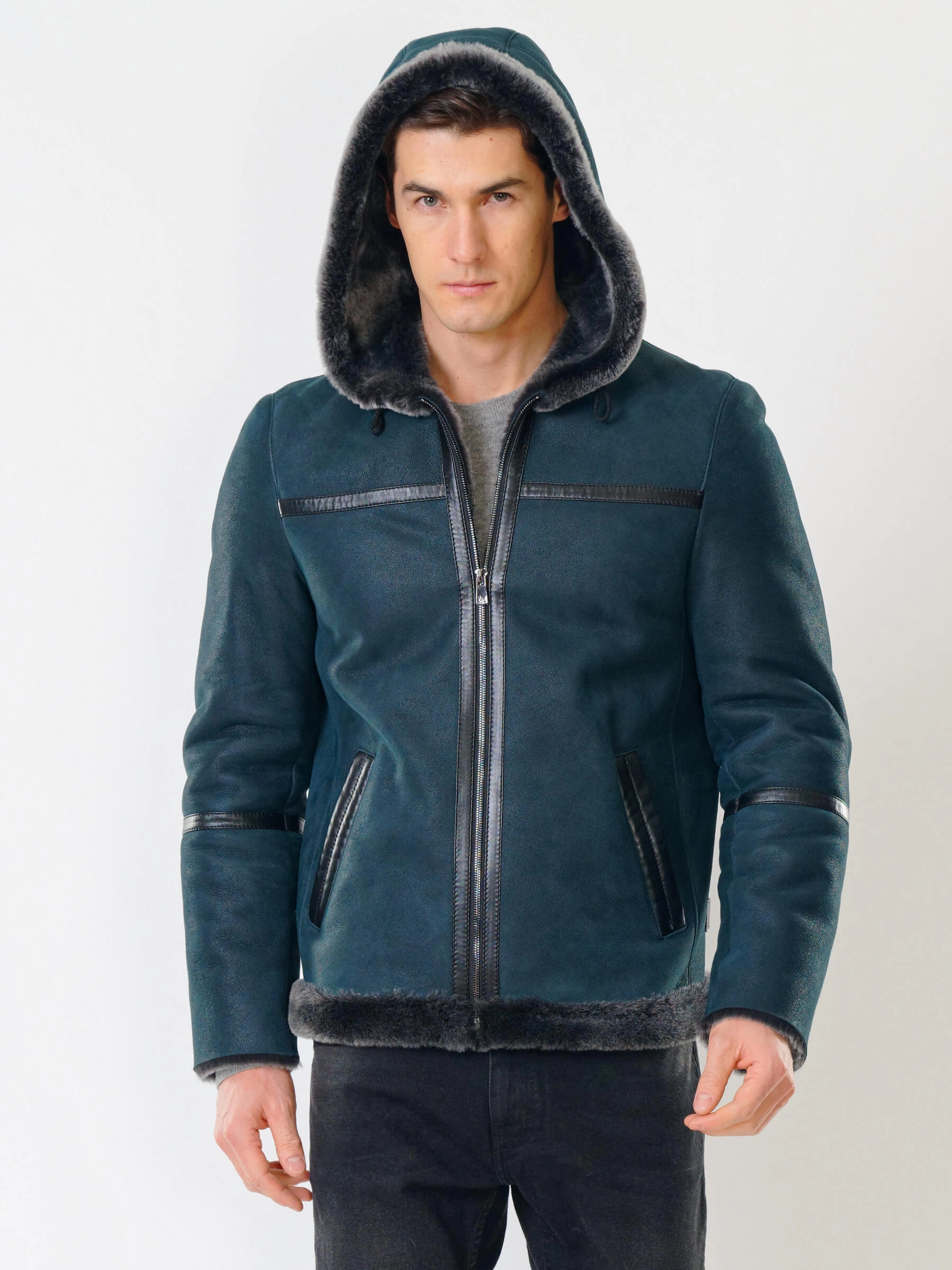 Товар короткая мужская дубленка с капюшоном премиум класса 425, синяя, размер 50, артикул 70521 выполнен из овчина "мерино" с застежкой молния. Рассчитан на сезон: осень-зима. Длина изделия 70 см, силуэт прямой.