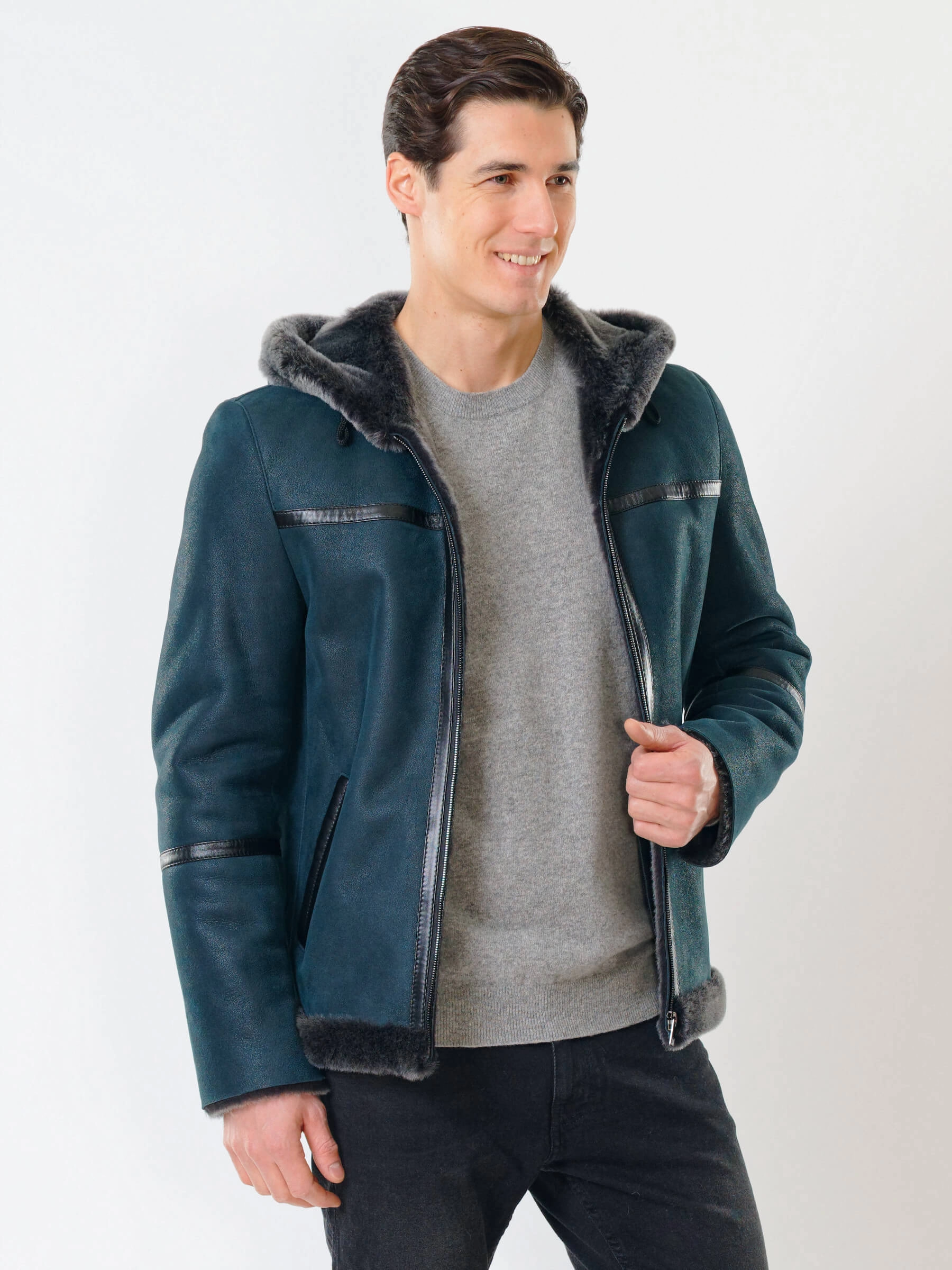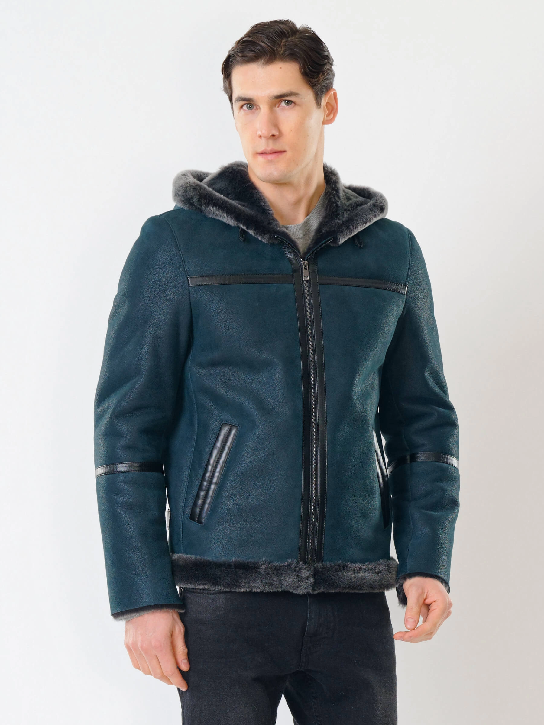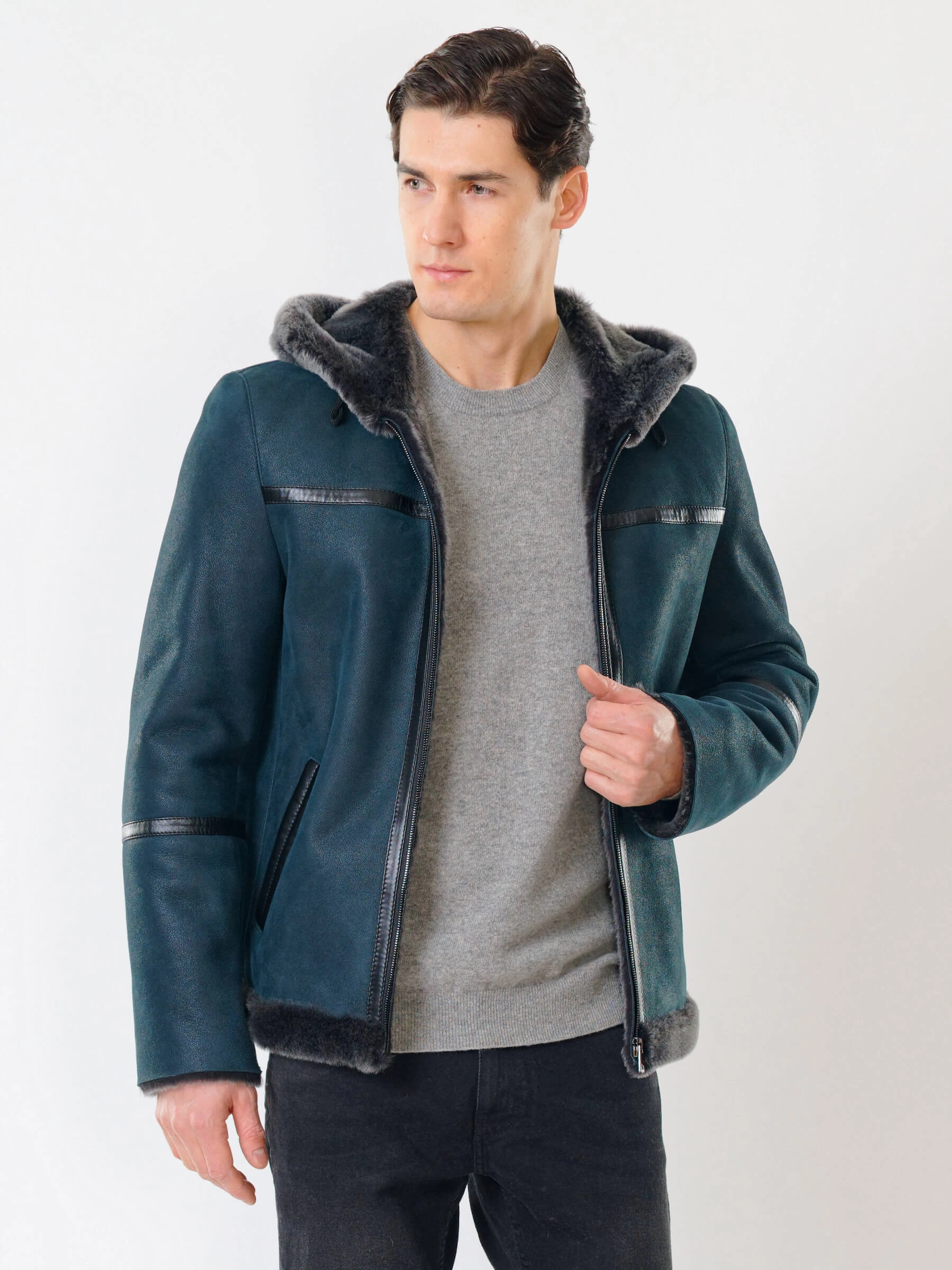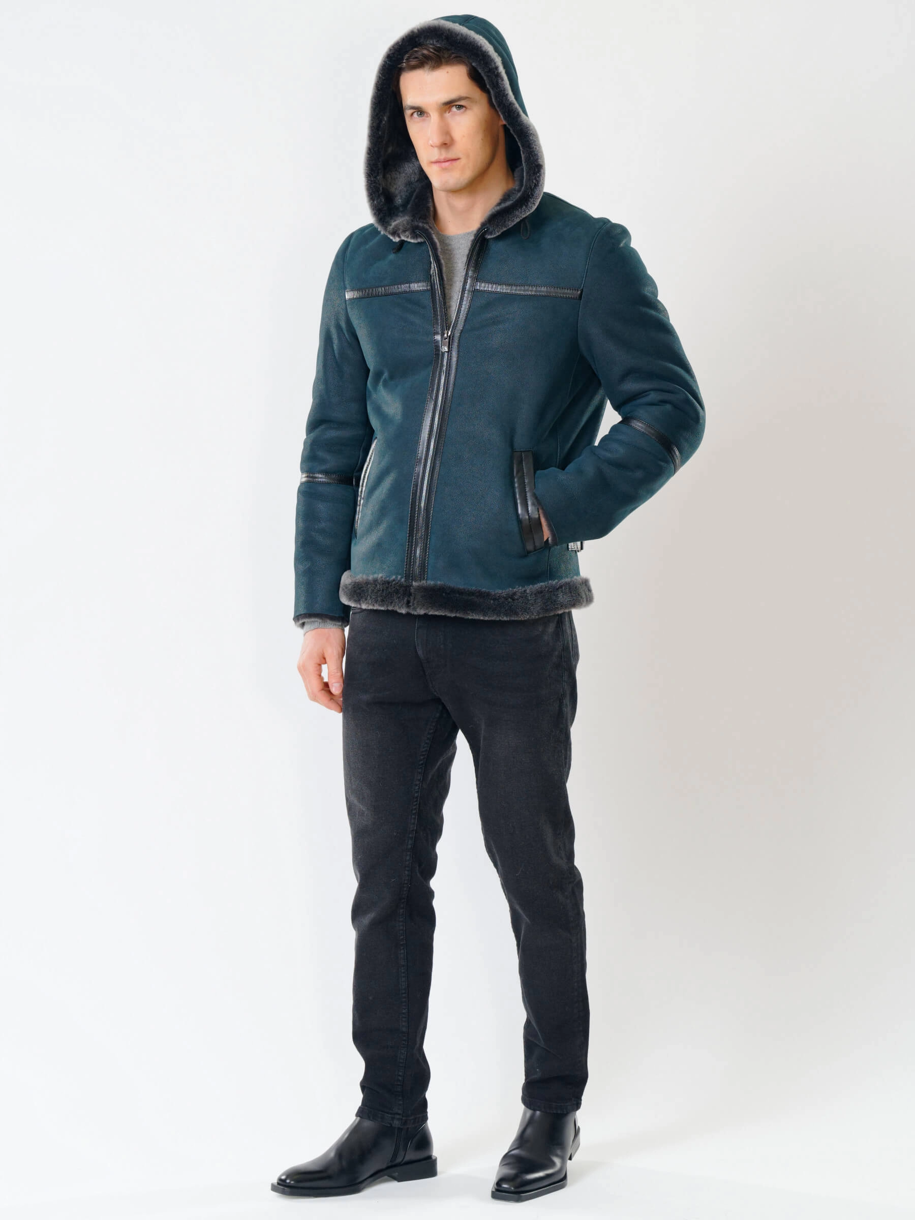 Короткая мужская дубленка с капюшоном премиум класса 425, синяя, размер 50, артикул 70521