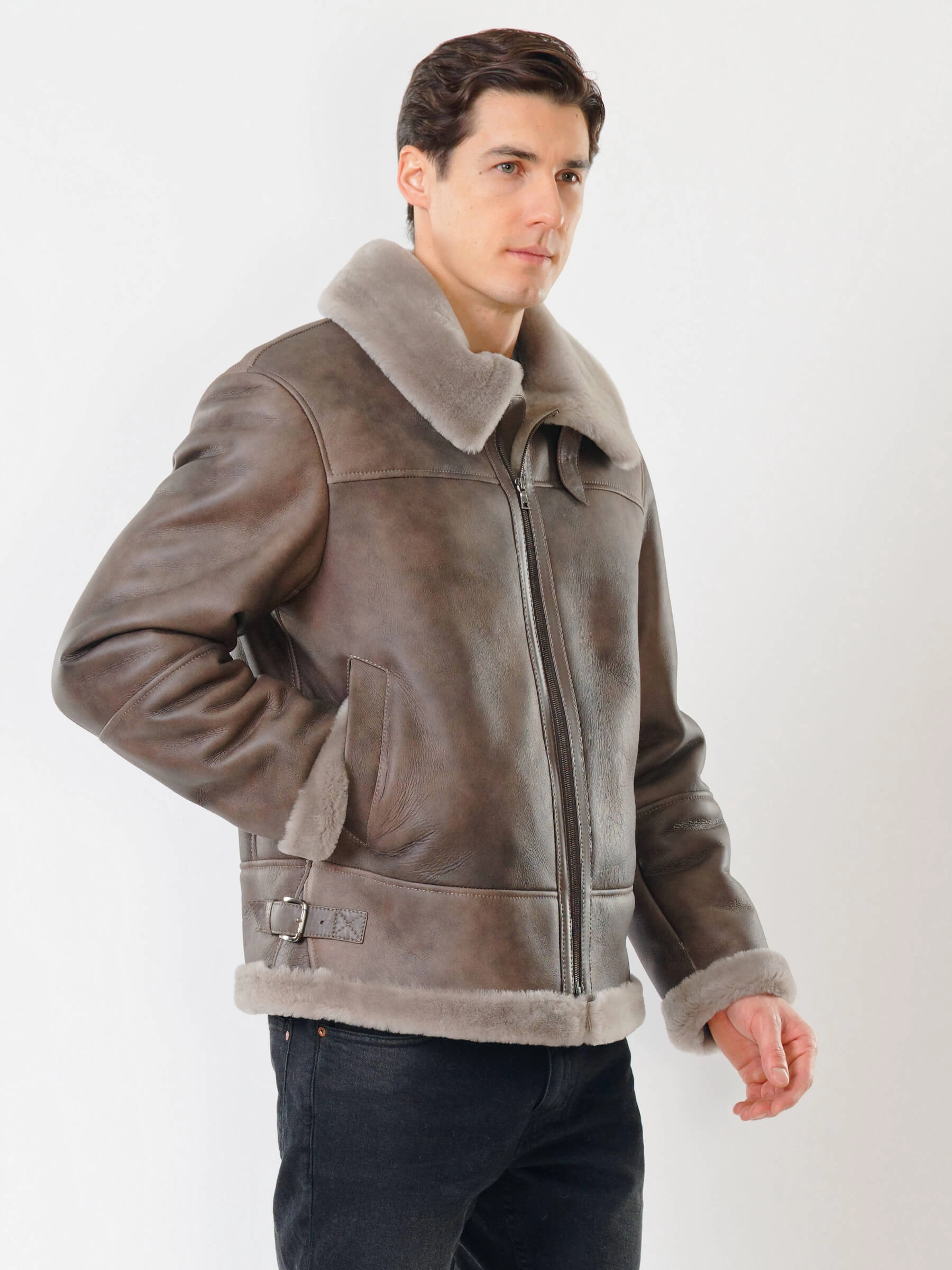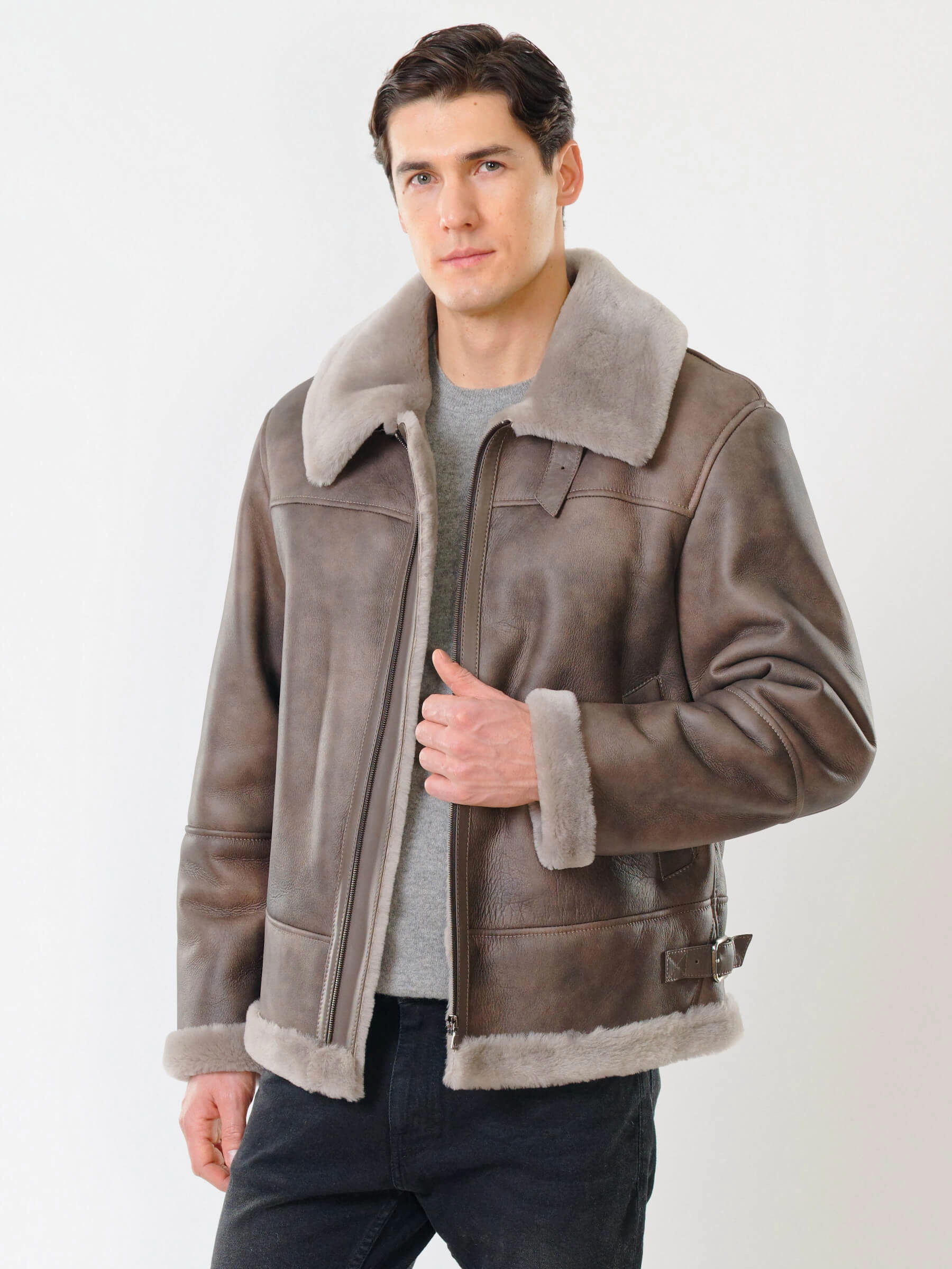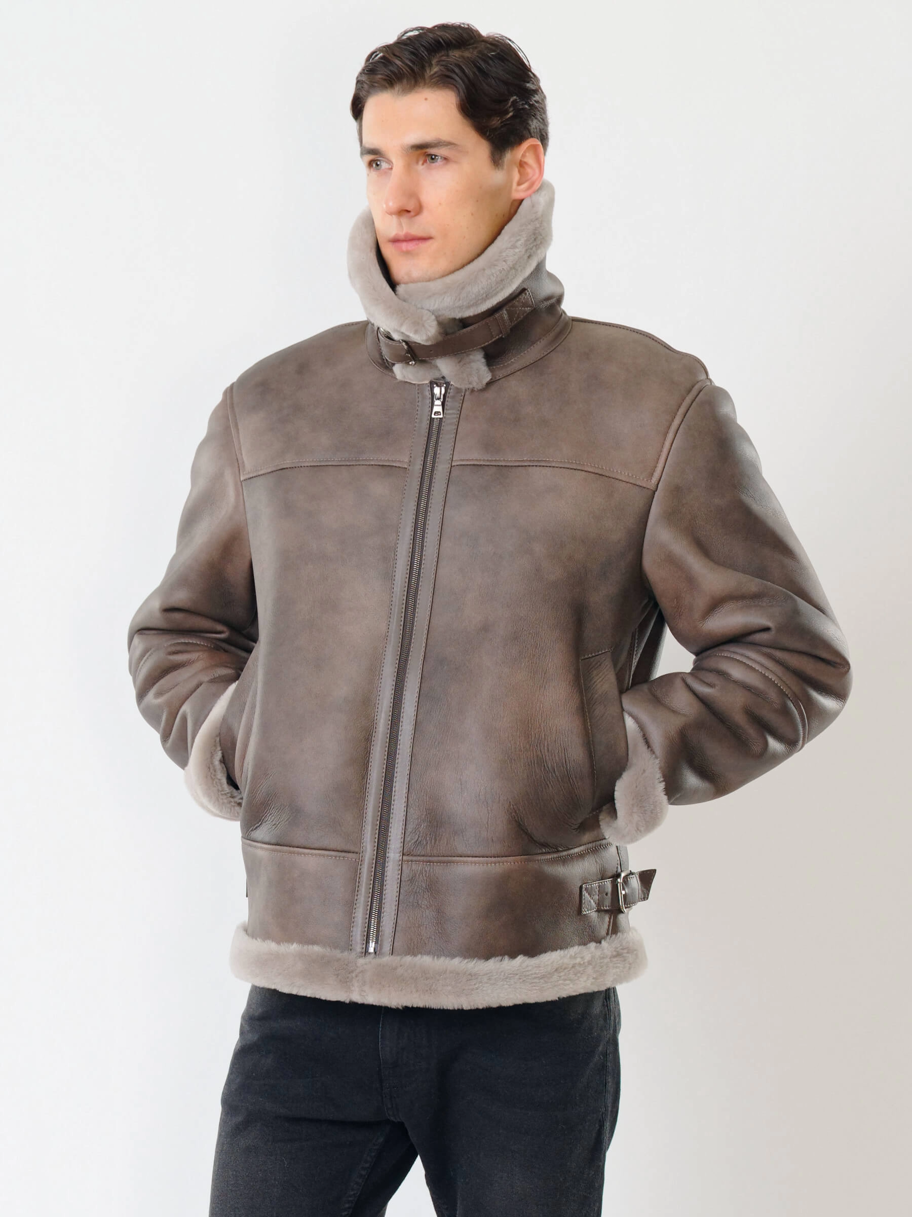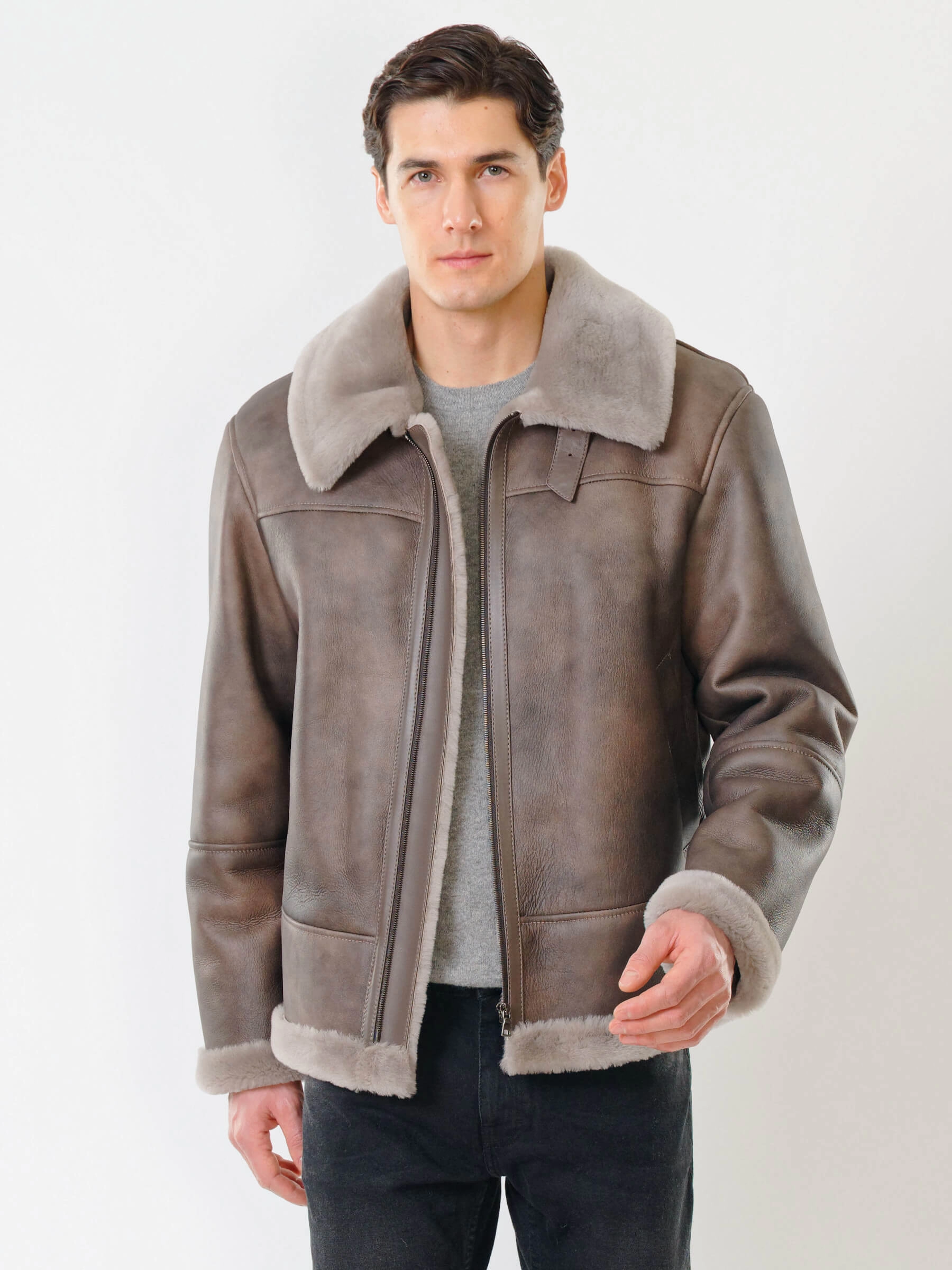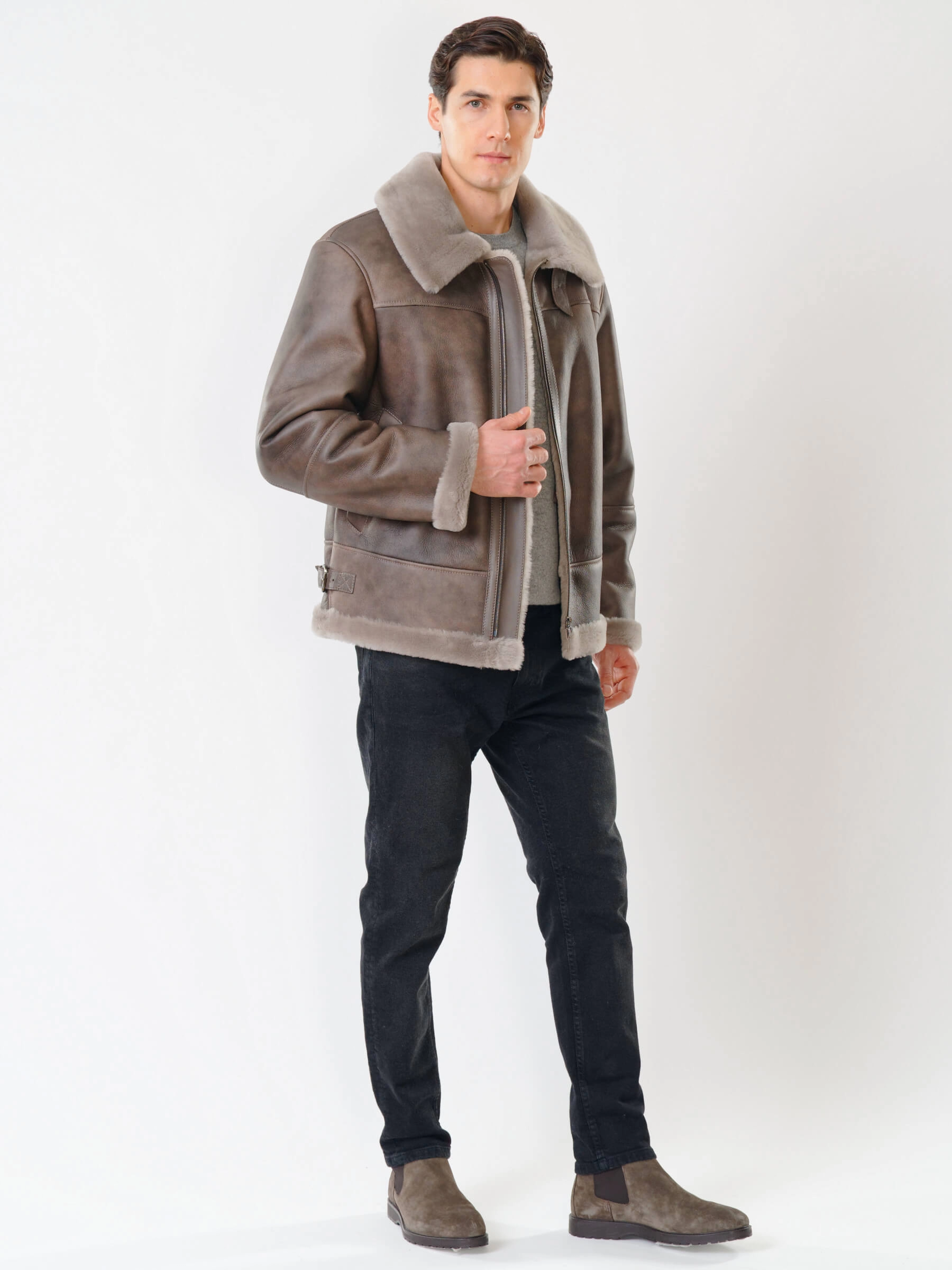 Товар короткая мужская дубленка пилот 427, серо-коричневая, размер 48, артикул 70541 выполнен из овчина "мерино" с застежкой молния. Рассчитан на сезон: осень-зима. Длина изделия 70 см, силуэт прямой.