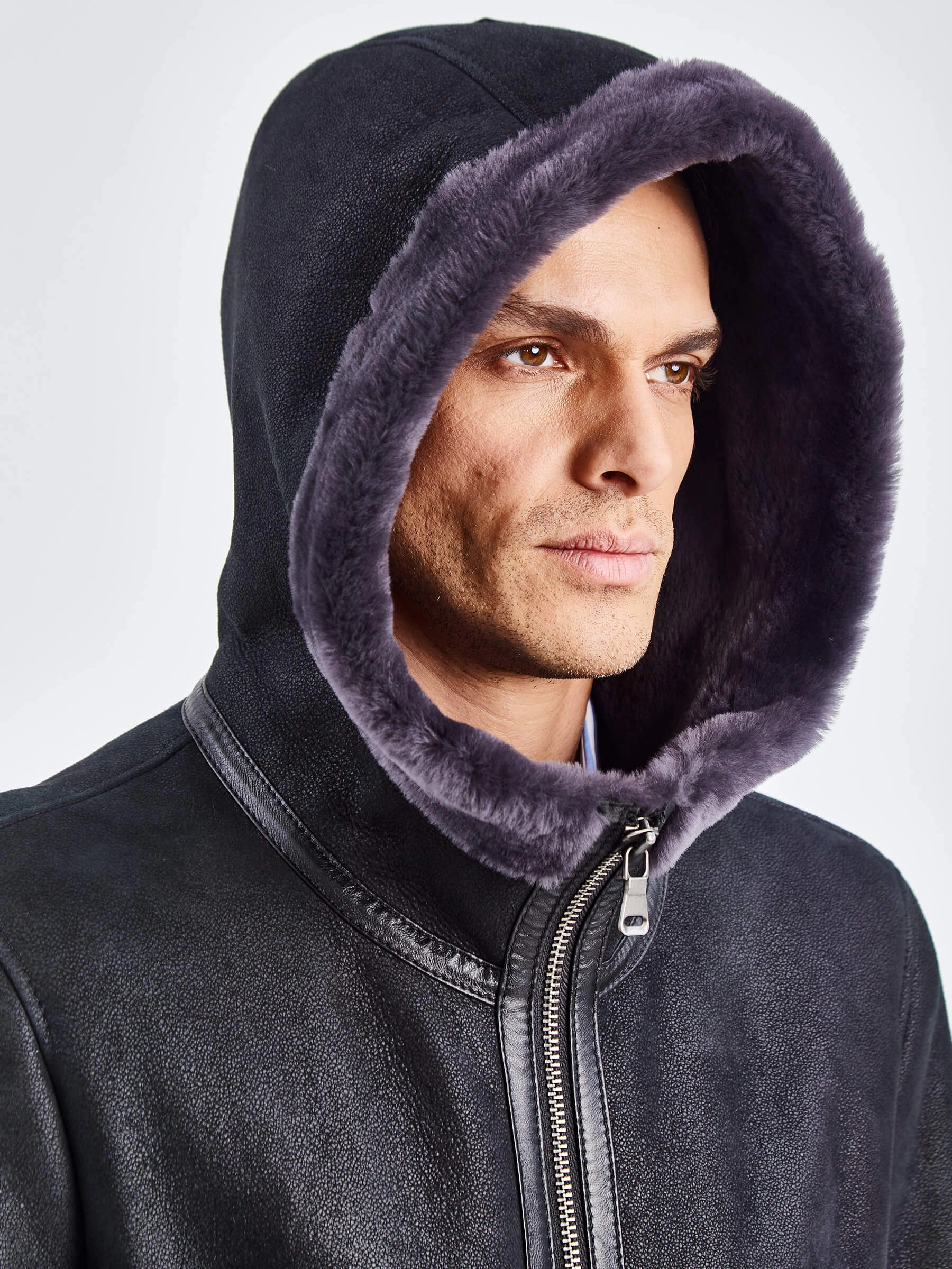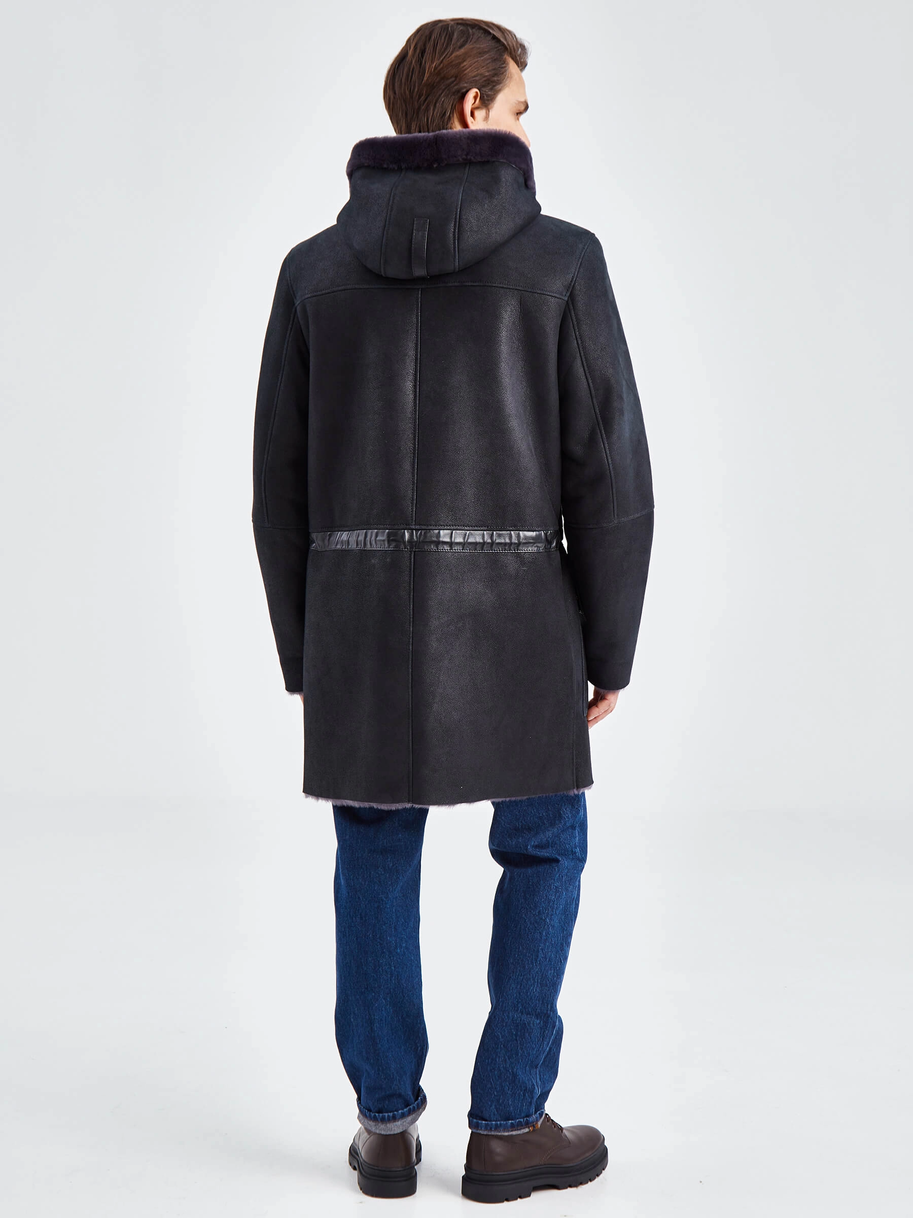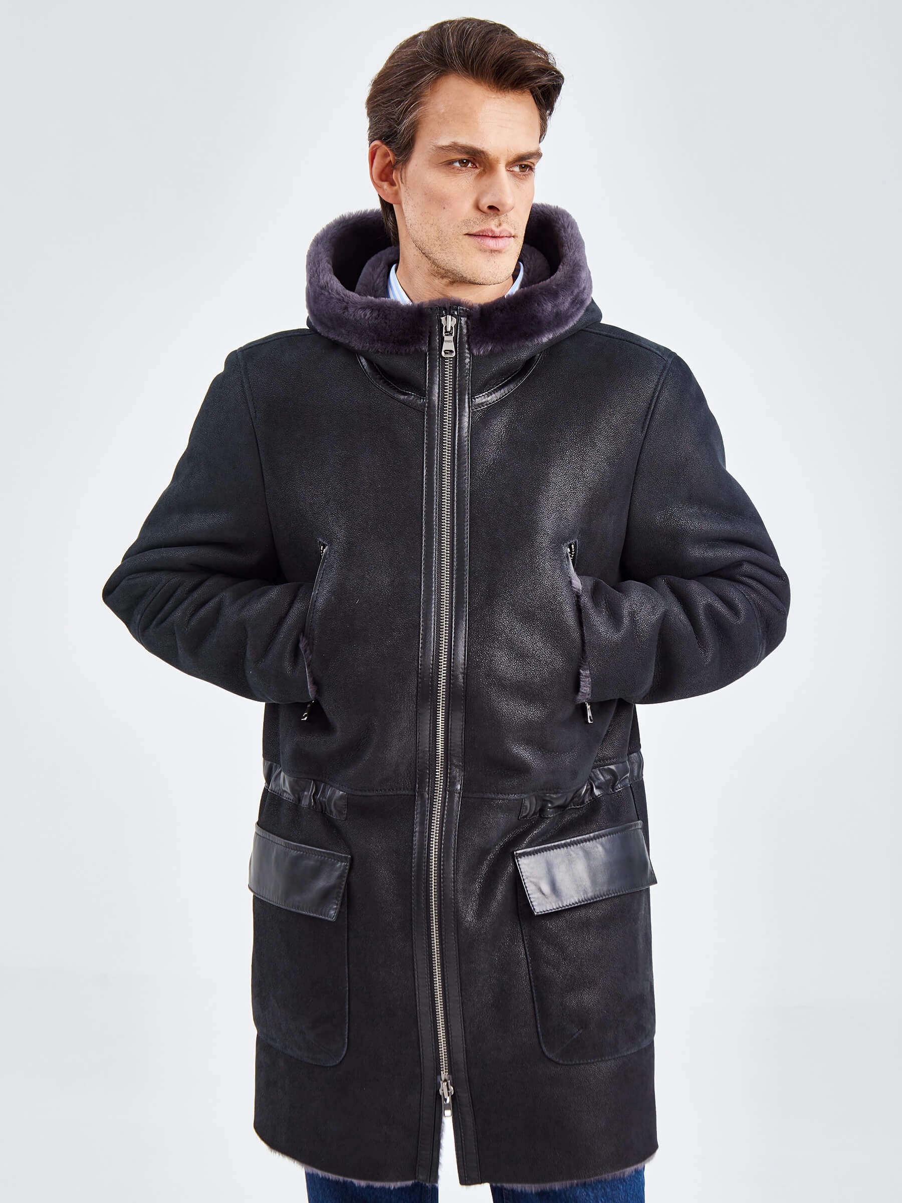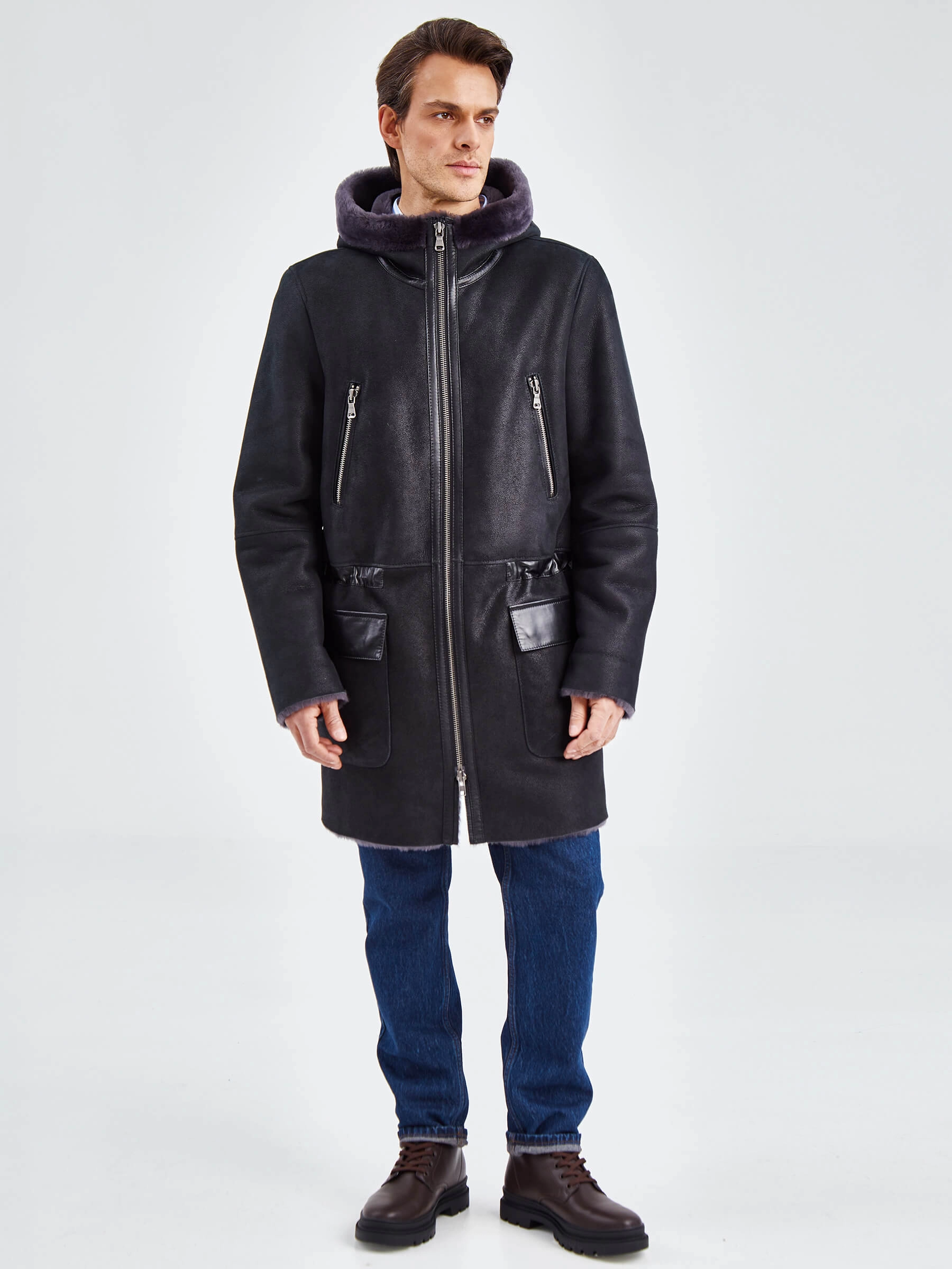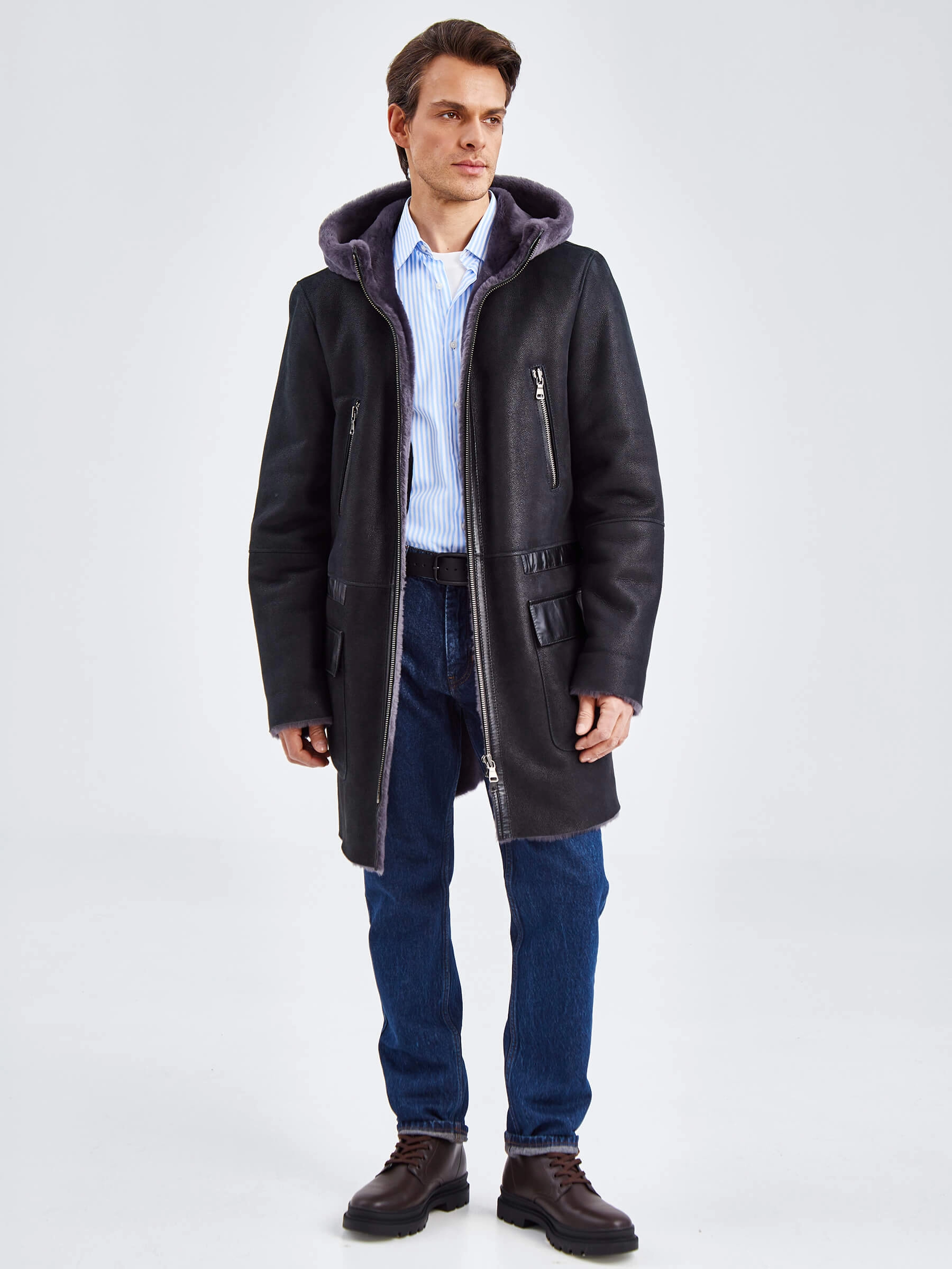 Длинная мужская дубленка с капюшоном премиум класса 429, черная, размер 48, артикул 71461