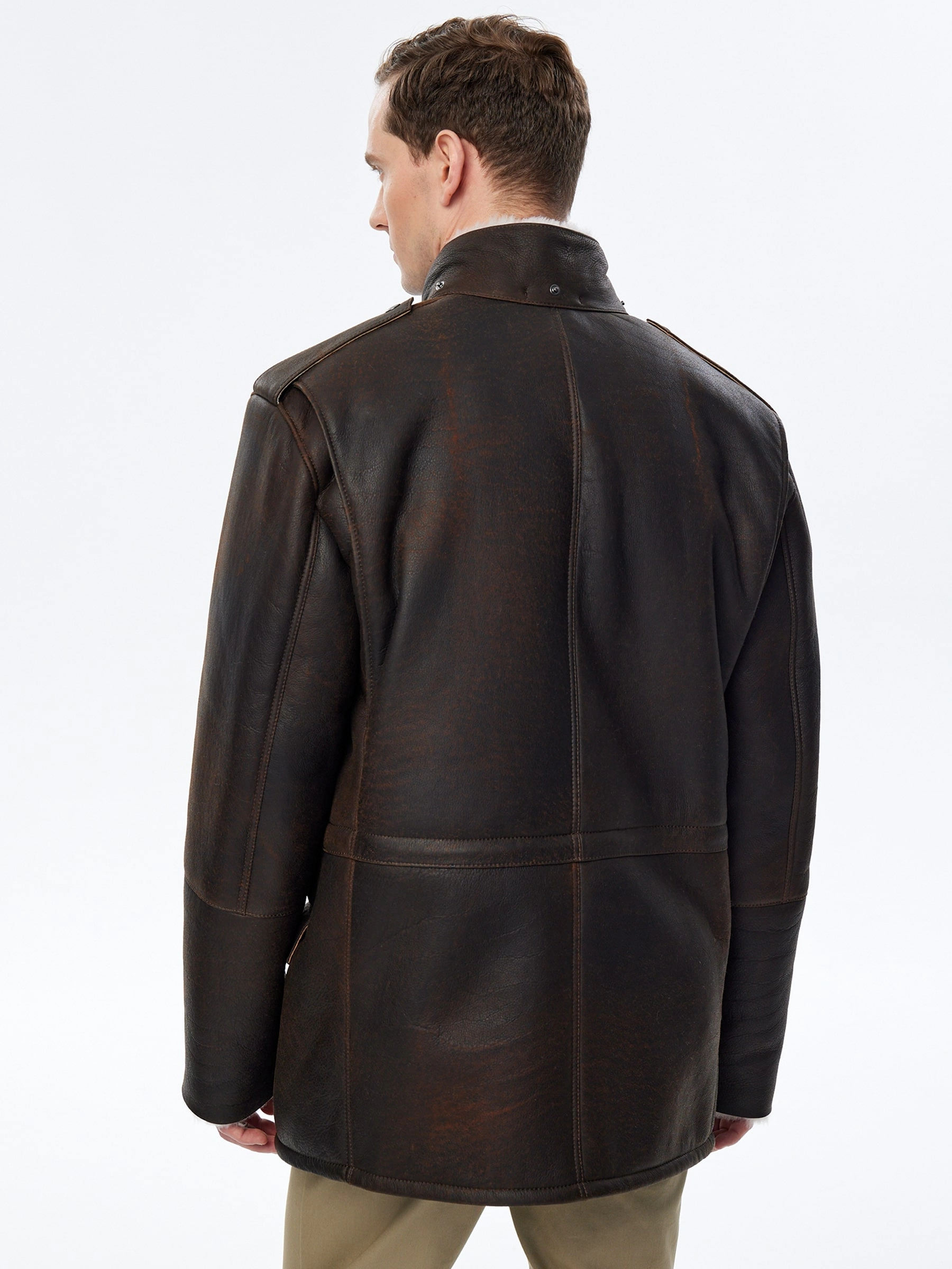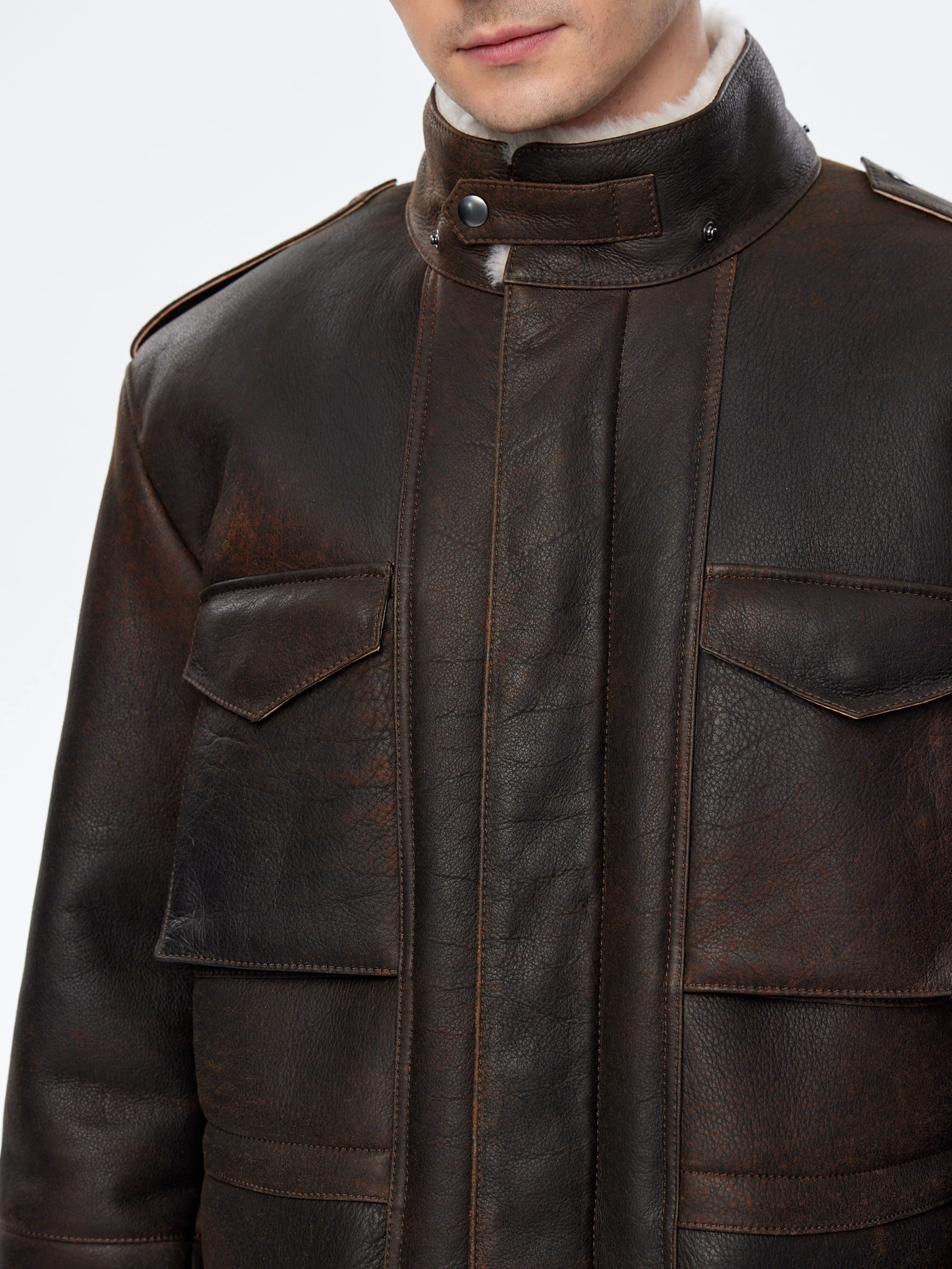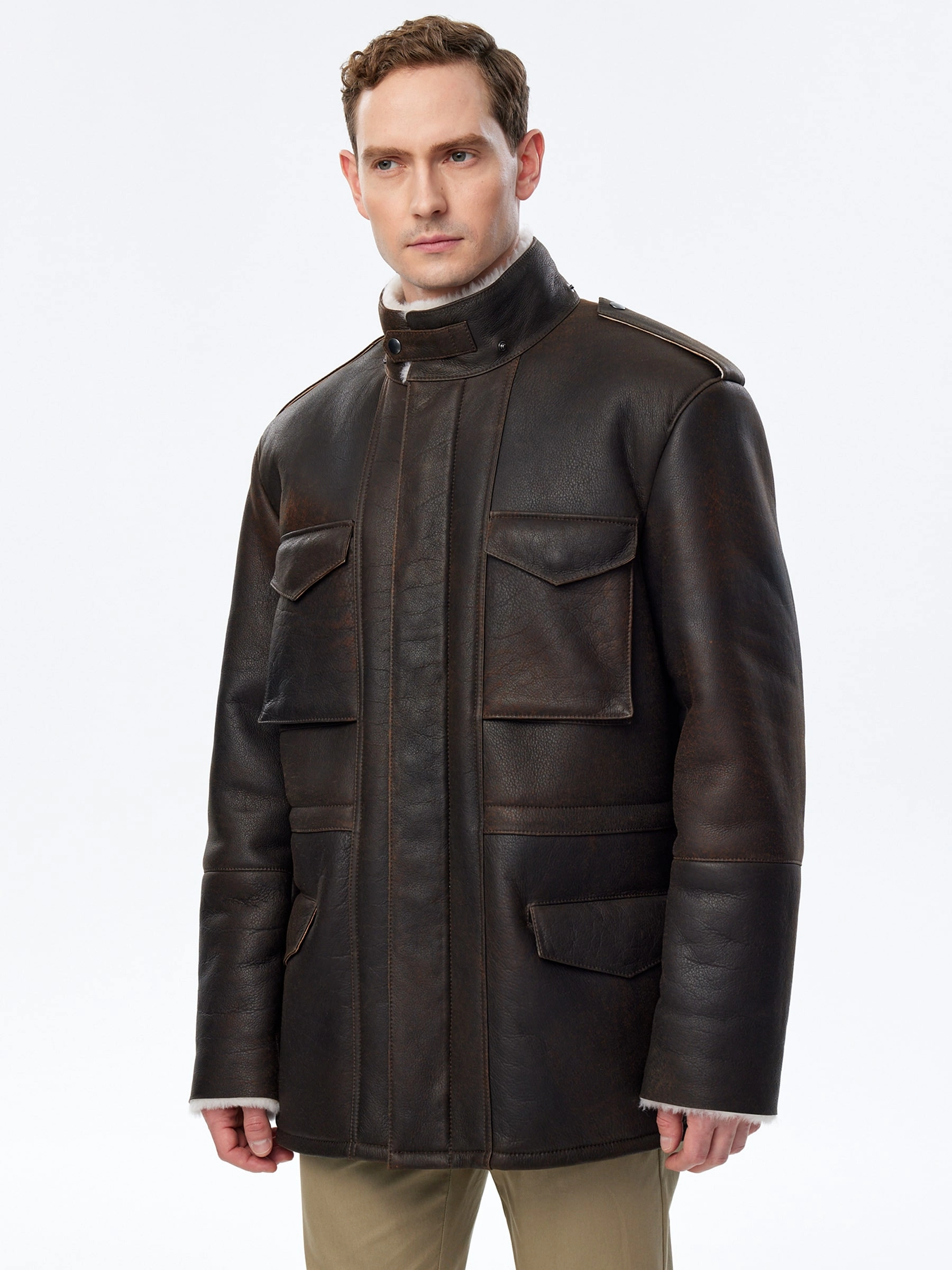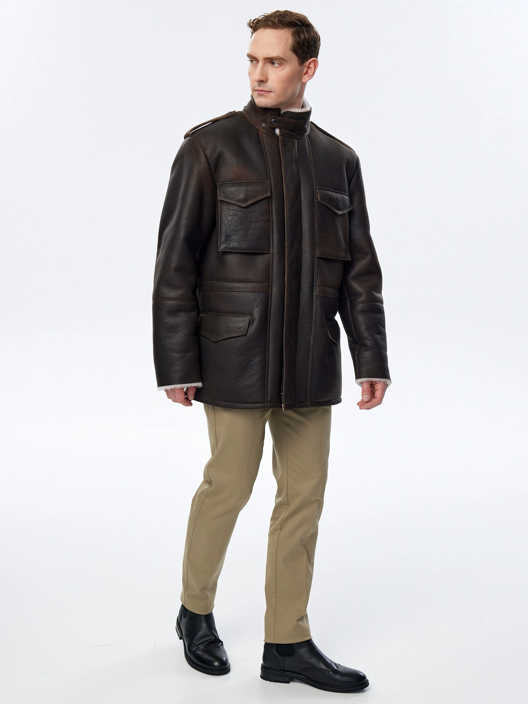 Мужская дубленка в стиле милитари. Мастера Primo Vello для изготовления коричневой дубленки выбрали мягкую плотную овчину. Изделие имеет невысокий воротник-стойку с застежкой в виде паты с квадратной пряжкой, а также четыре вместительных кармана. Потайная застежка на молнии, внутри модели пояс-кулиска.