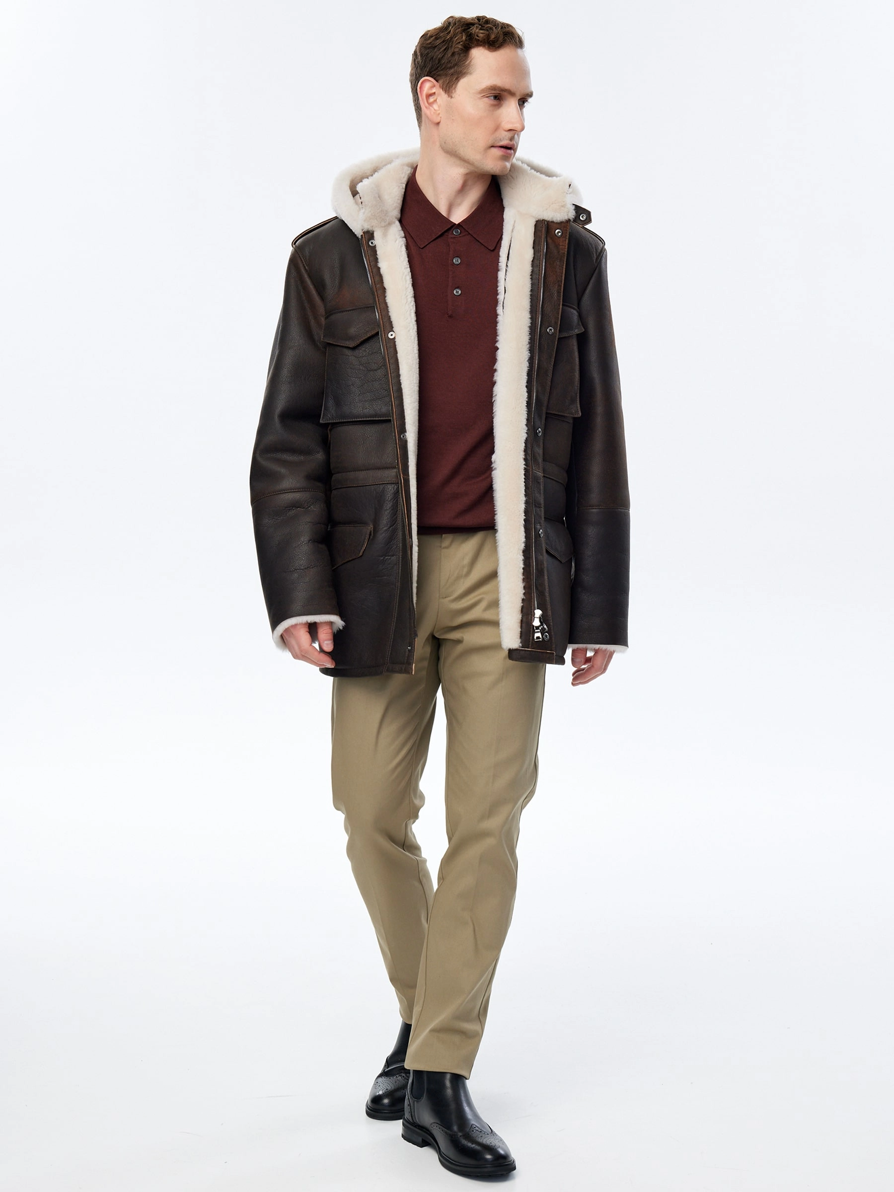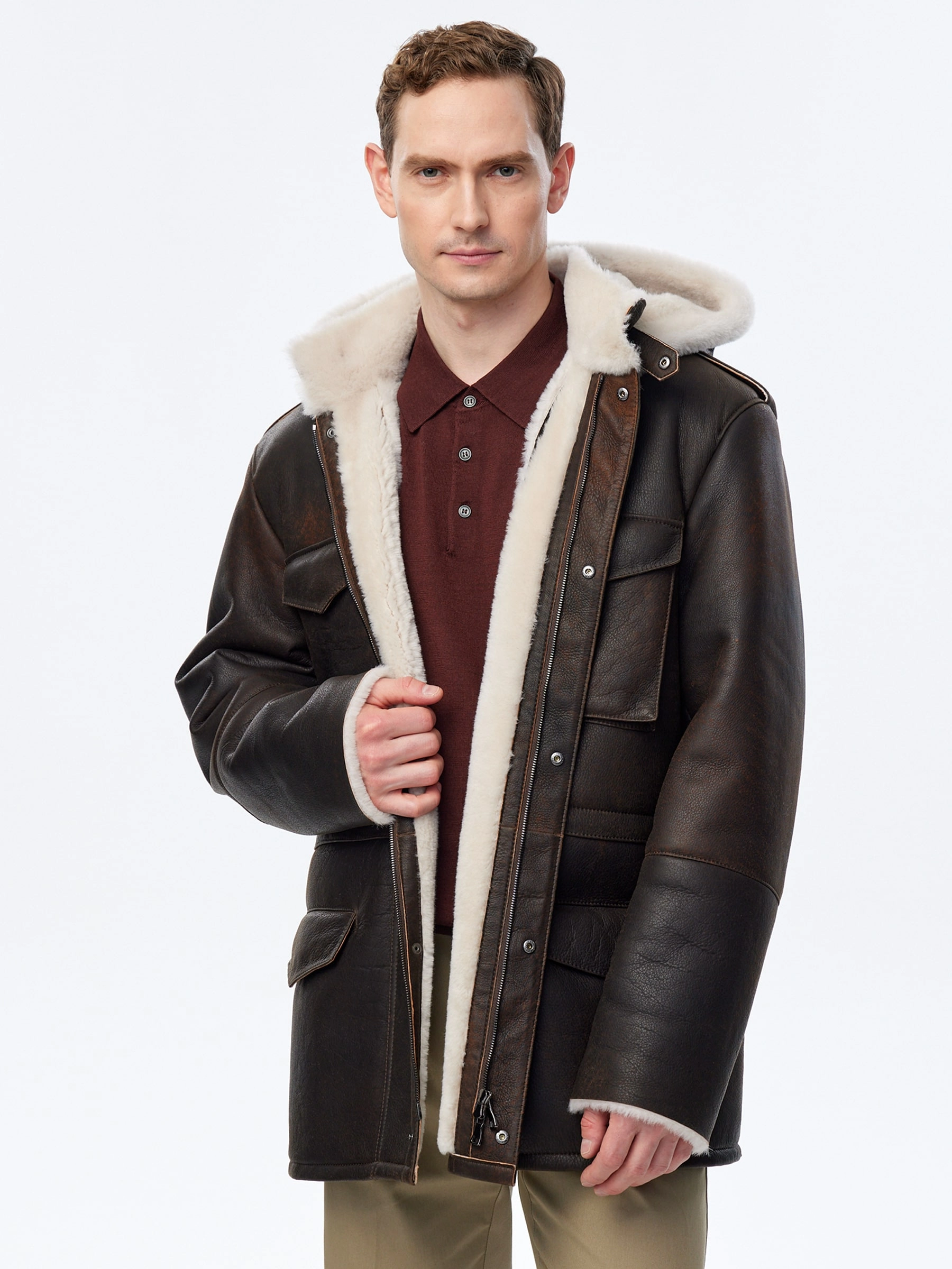 Товар дубленка мужская с капюшоном премиум класса 433, коричневая, размер 48, артикул 70751 выполнен из овчина "мерино" с застежкой молния. Рассчитан на сезон: осень-зима. Длина изделия 81 см, силуэт прямой.