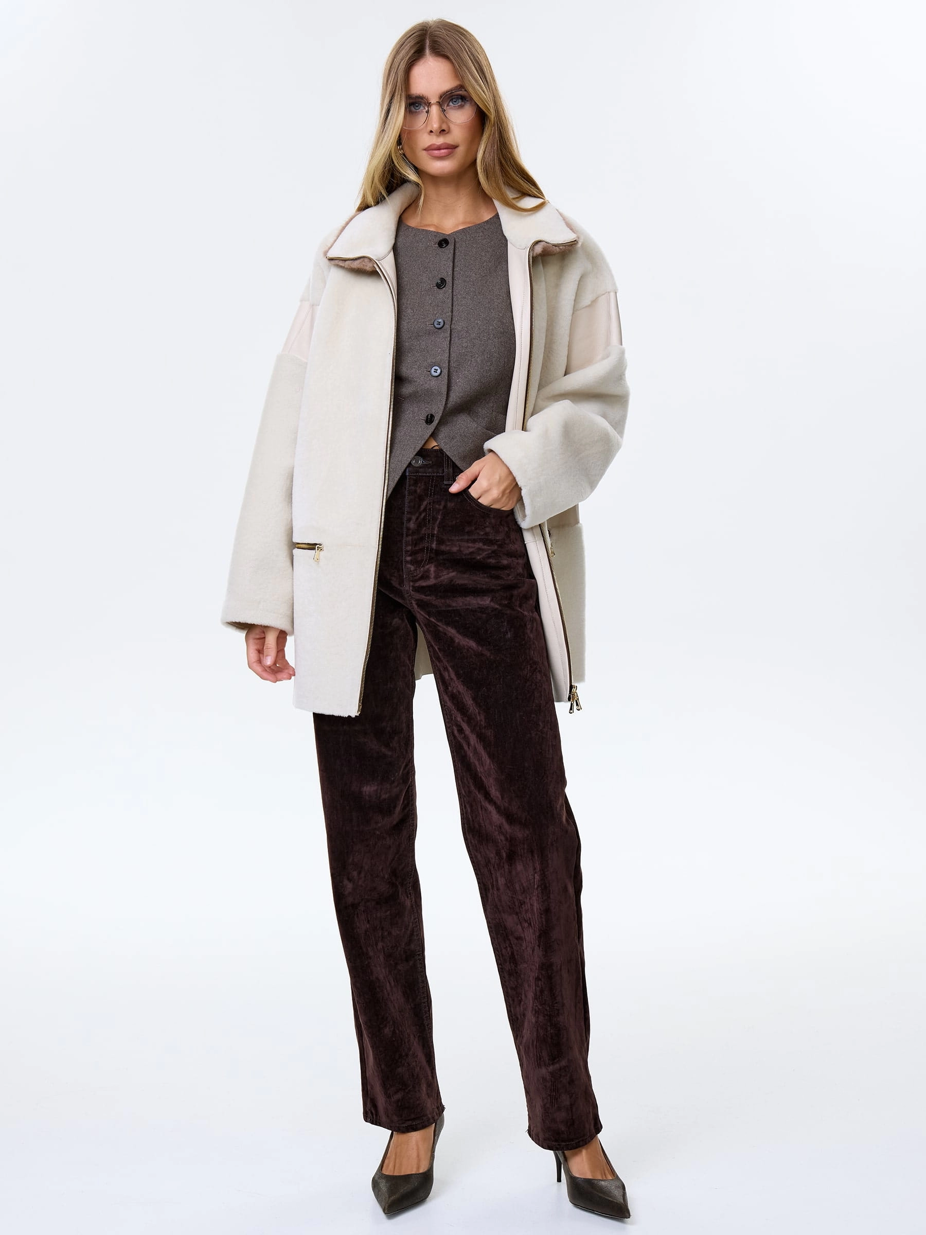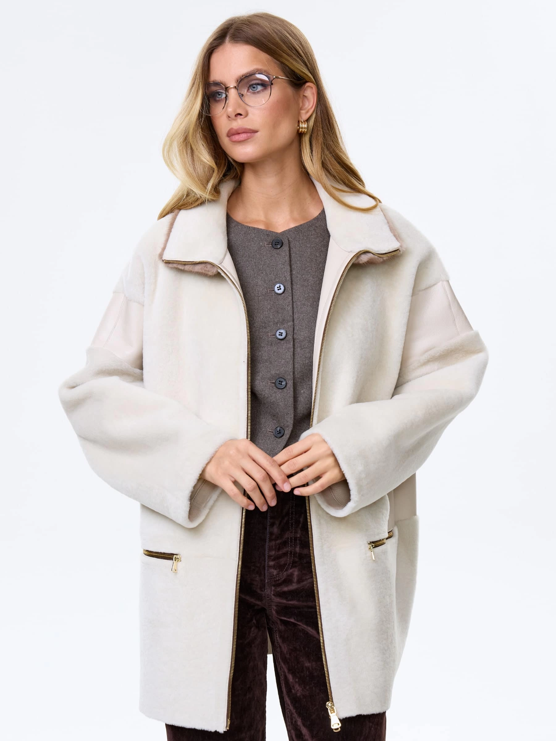 Товар дубленка на молнии с норковым воротником для женщин премиум класса 2057, белая, размер 44, артикул 64490 выполнен из овчина "мерино" с застежкой молния. Рассчитан на сезон: осень-зима. Длина изделия 77 см, силуэт свободный.