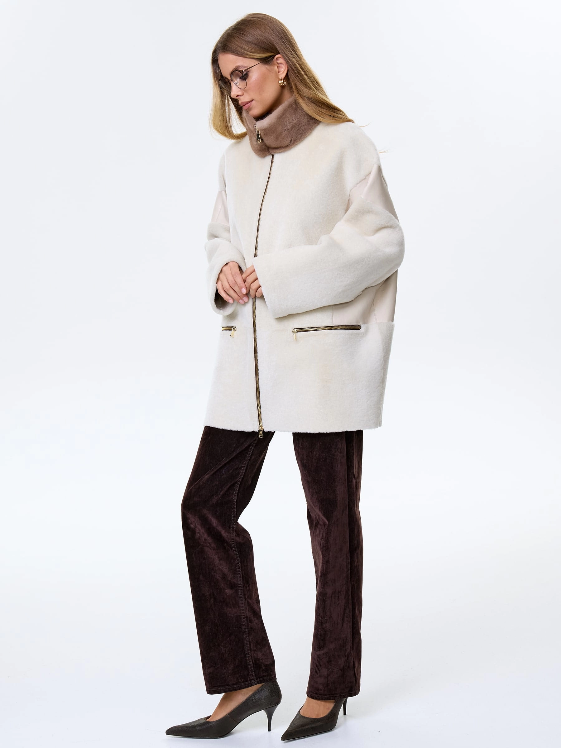 Дубленка на молнии с норковым воротником для женщин премиум класса 2057, белая, размер 44, артикул 64490