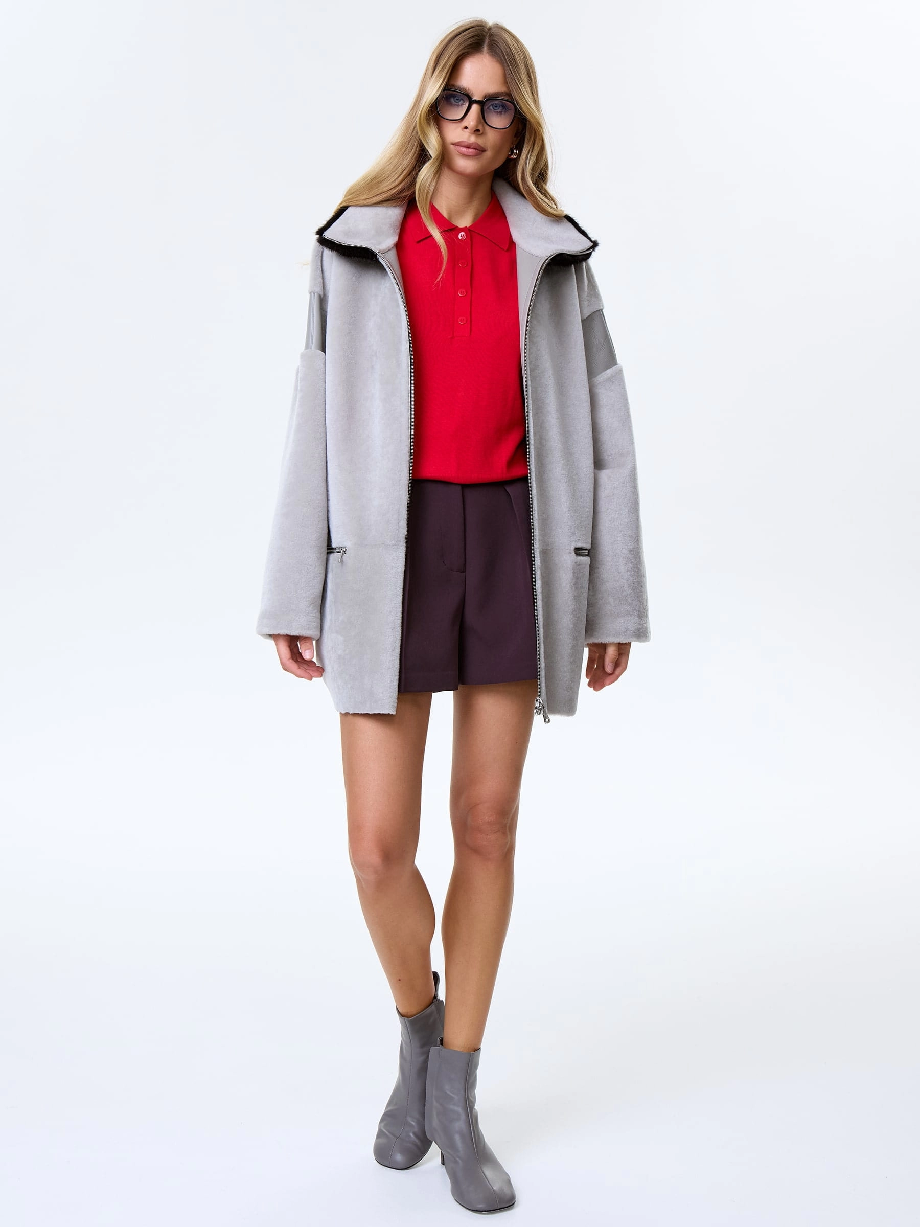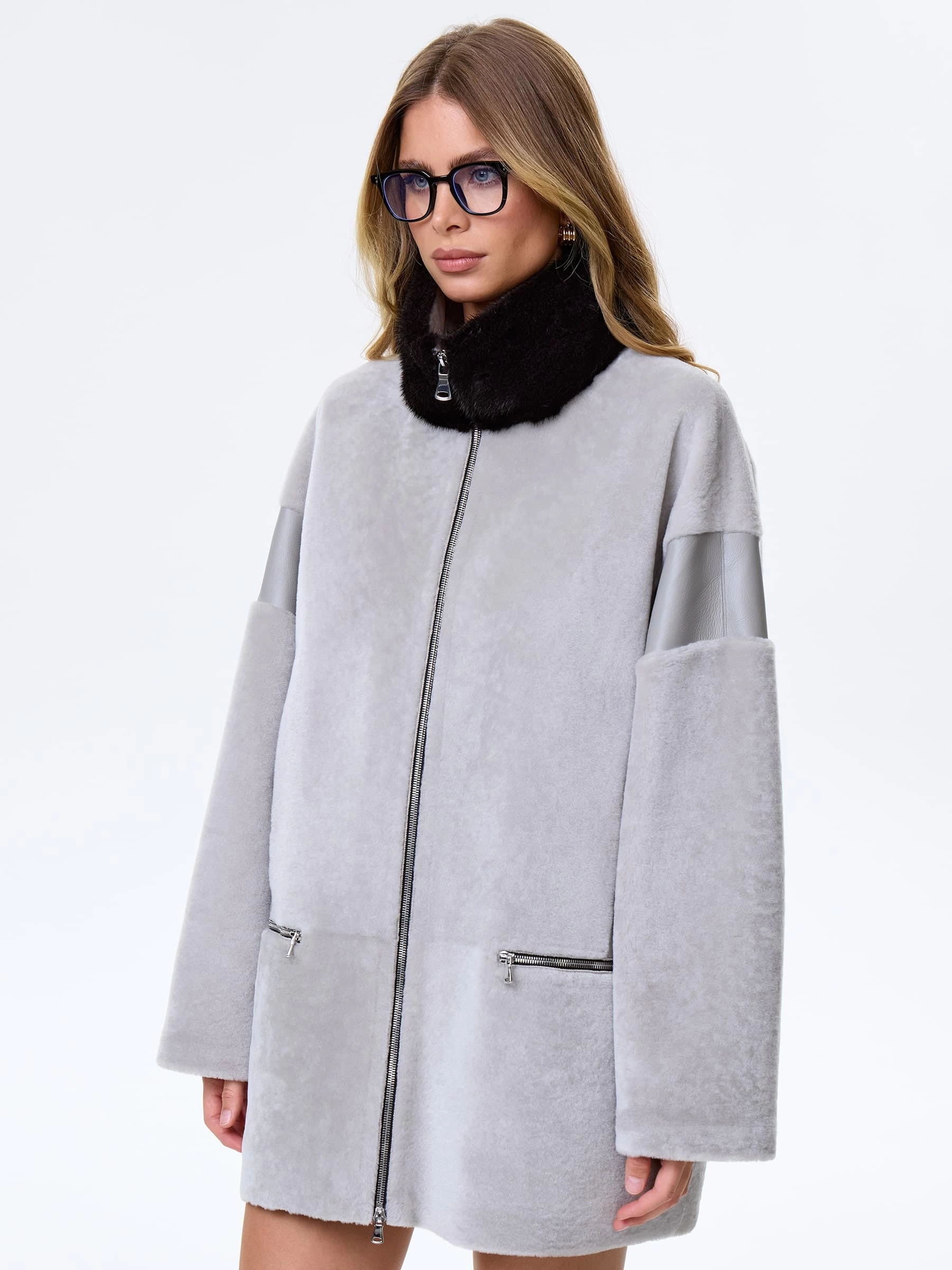 Товар дубленка на молнии с норковым воротником для женщин премиум класса 2057, серая, размер 44, артикул 64480 выполнен из овчина "мерино" с застежкой молния. Рассчитан на сезон: осень-зима. Длина изделия 77 см, силуэт свободный.