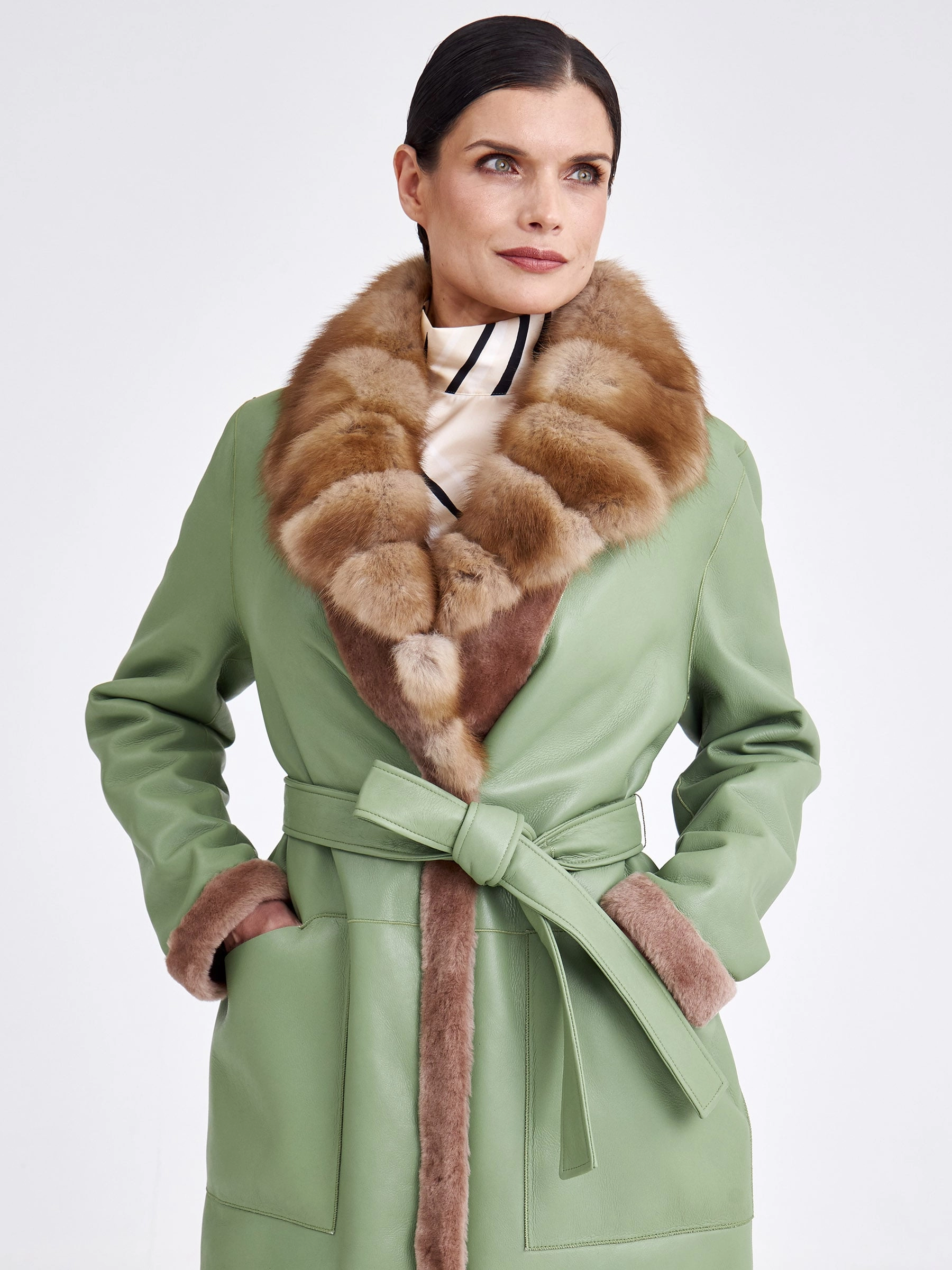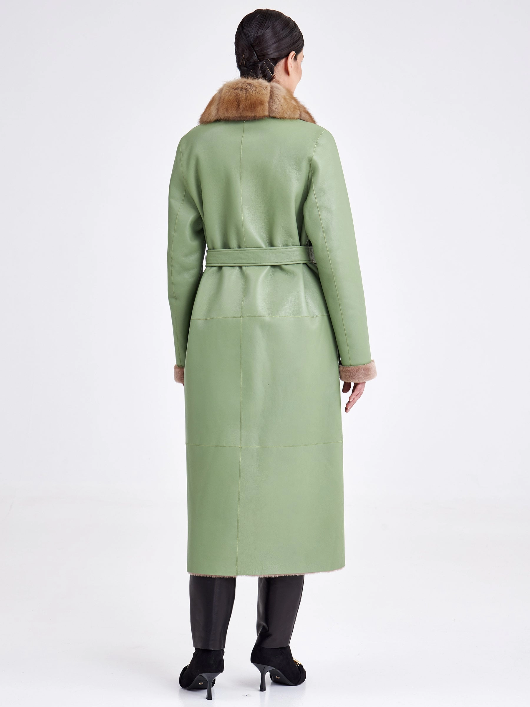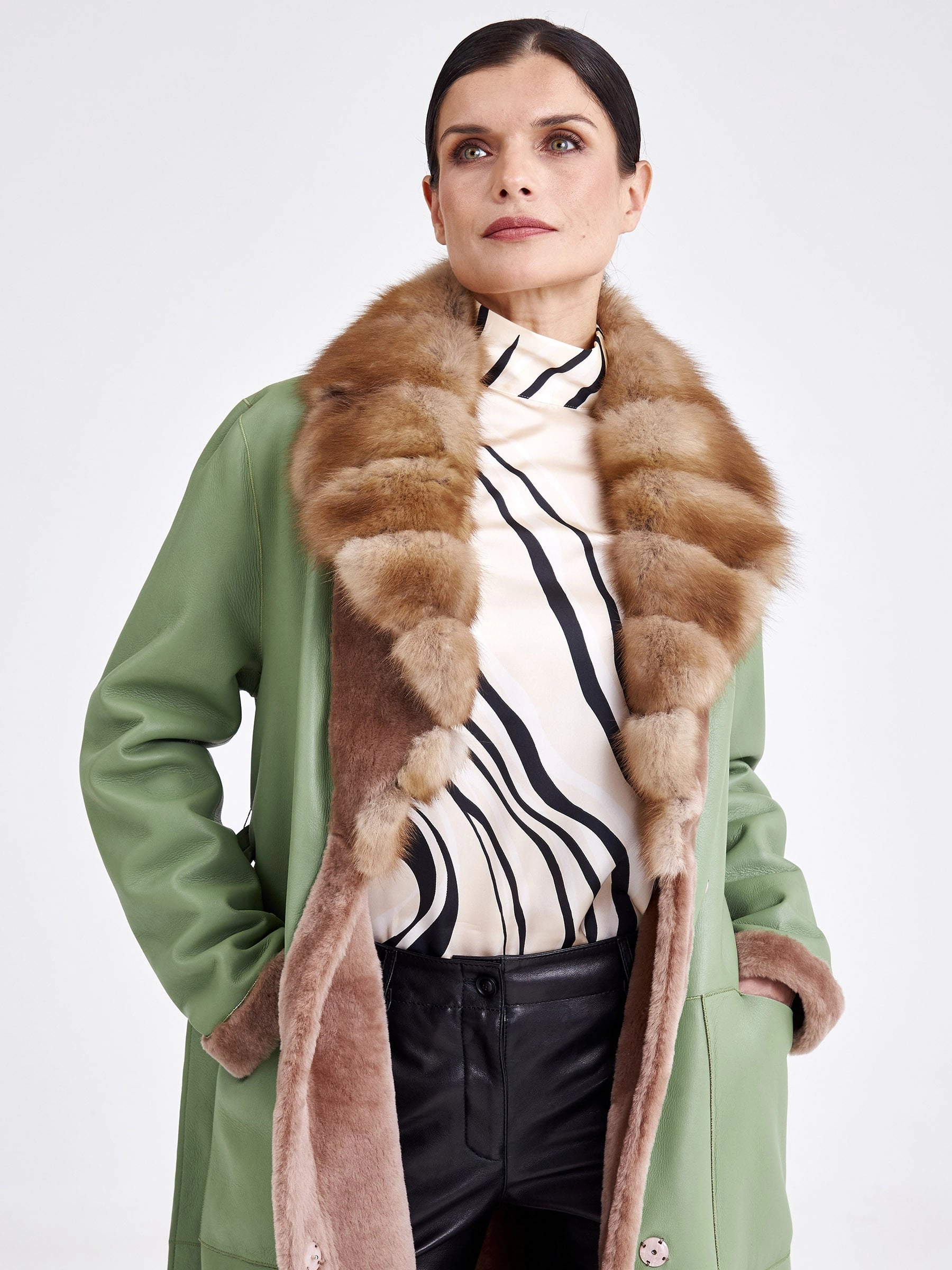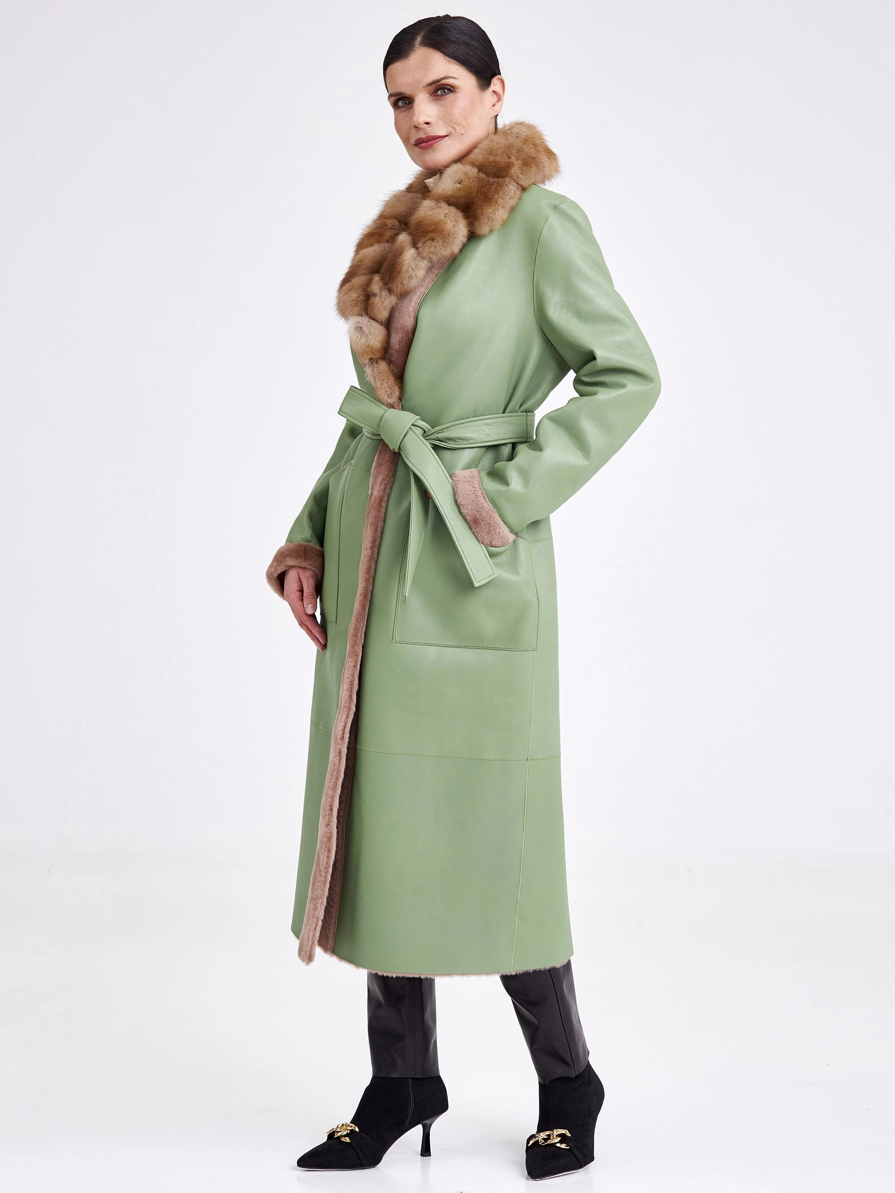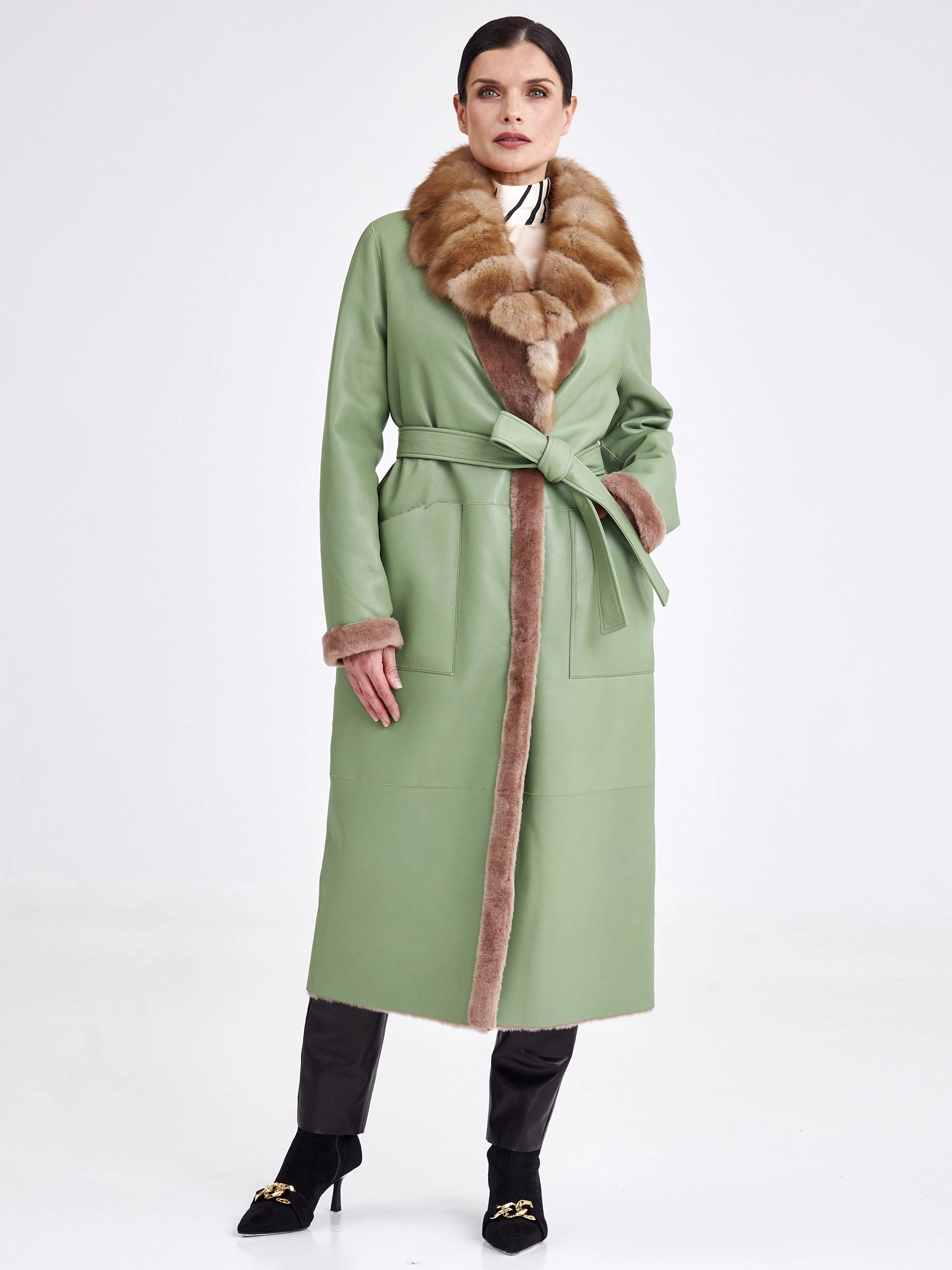 Эта длинная (свыше 90 см) дубленка прямого силуэта с втачным рукавом, выполненная из мягкой овчины в эффектном двухстороннем сочетании цветов — оливкового снаружи и бежевого внутри, воплощает элегантную женственность. Её лаконичный дизайн с застежкой на кнопках и отделкой из шелковистой овчины по борту и манжетам получает роскошный акцент — английский воротник из меха куницы, а длинный пояс позволяет легко трансформировать прямой крой в приталенный. Стилистически модель балансирует между современной классикой и неброской роскошью, что делает её идеальной основой для капсульного гардероба. Ключевой стилистический прием — контрастное цветовое решение: сдержанный оливковый создает строгий внешний образ, а теплый бежевый, открывающийся при движении или расстегнутой застежке, добавляет неожиданную глубину и мягкость. Сочетайте её с прямыми джинсами и грубыми ботинками для дерзкого образа или с платьем-миди и поясом на талии — для романтичного, играя на контрасте текстур и подчёркивая универсальность этой вещи.