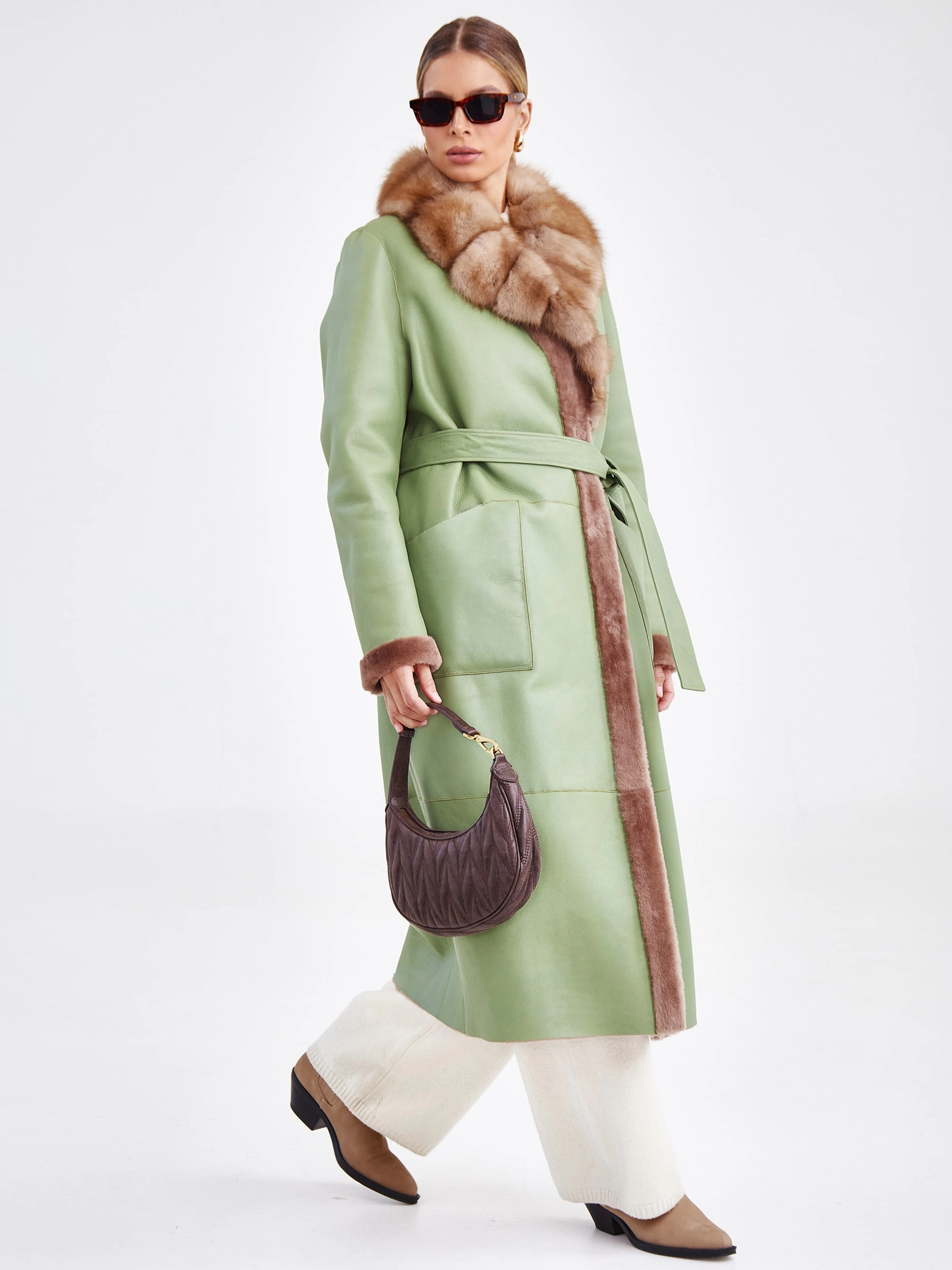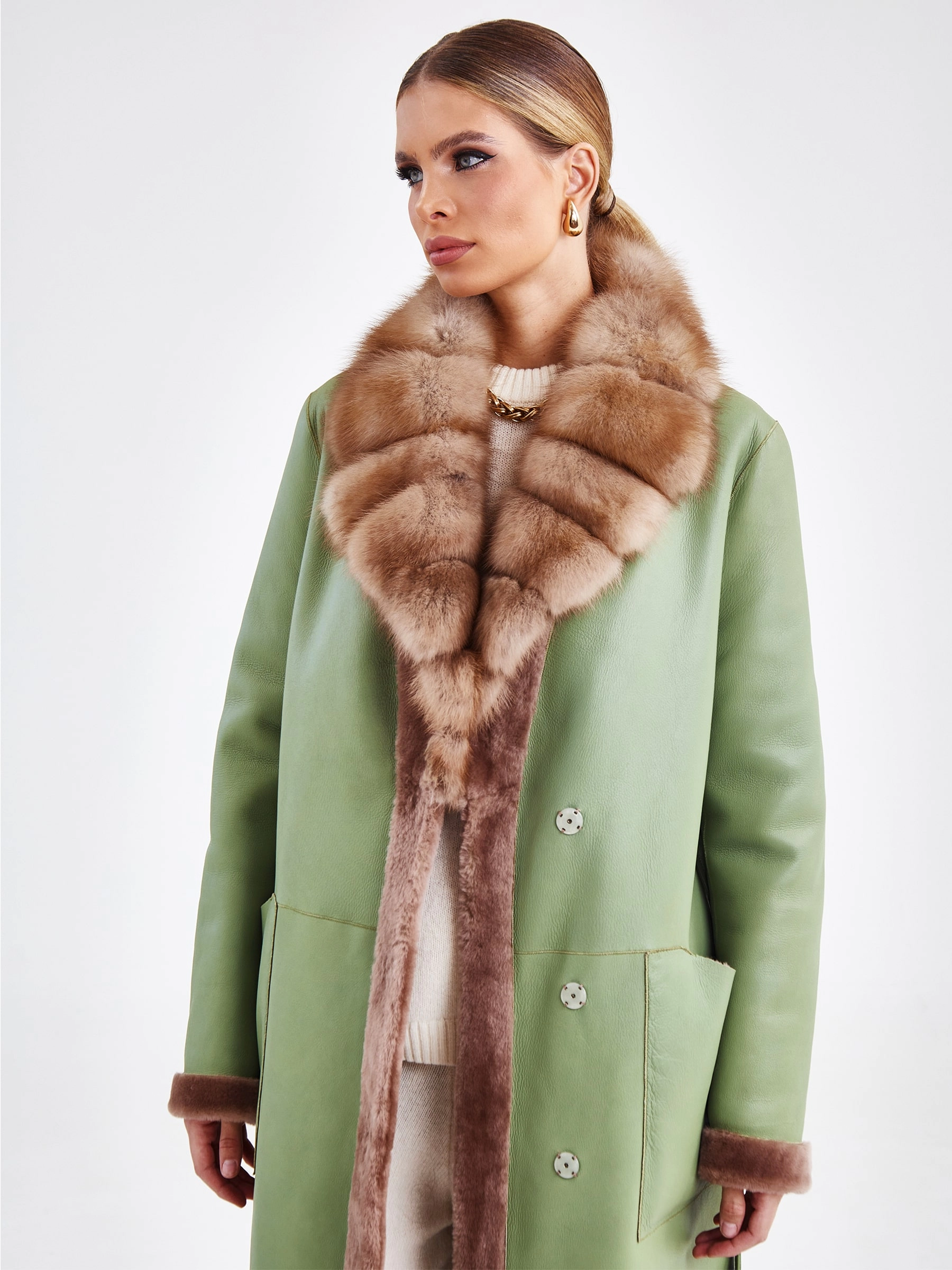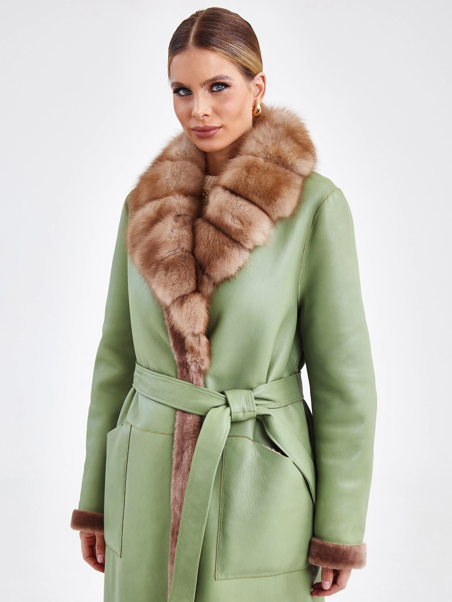 Эта длинная (свыше 90 см) дубленка прямого силуэта с втачным рукавом, выполненная из мягкой овчины в эффектном двухстороннем сочетании цветов — оливкового снаружи и бежевого внутри, воплощает элегантную женственность. Её лаконичный дизайн с застежкой на кнопках и отделкой из шелковистой овчины по борту и манжетам получает роскошный акцент — английский воротник из меха куницы, а длинный пояс позволяет легко трансформировать прямой крой в приталенный. Стилистически модель балансирует между современной классикой и неброской роскошью, что делает её идеальной основой для капсульного гардероба. Ключевой стилистический прием — контрастное цветовое решение: сдержанный оливковый создает строгий внешний образ, а теплый бежевый, открывающийся при движении или расстегнутой застежке, добавляет неожиданную глубину и мягкость. Сочетайте её с прямыми джинсами и грубыми ботинками для дерзкого образа или с платьем-миди и поясом на талии — для романтичного, играя на контрасте текстур и подчёркивая универсальность этой вещи.