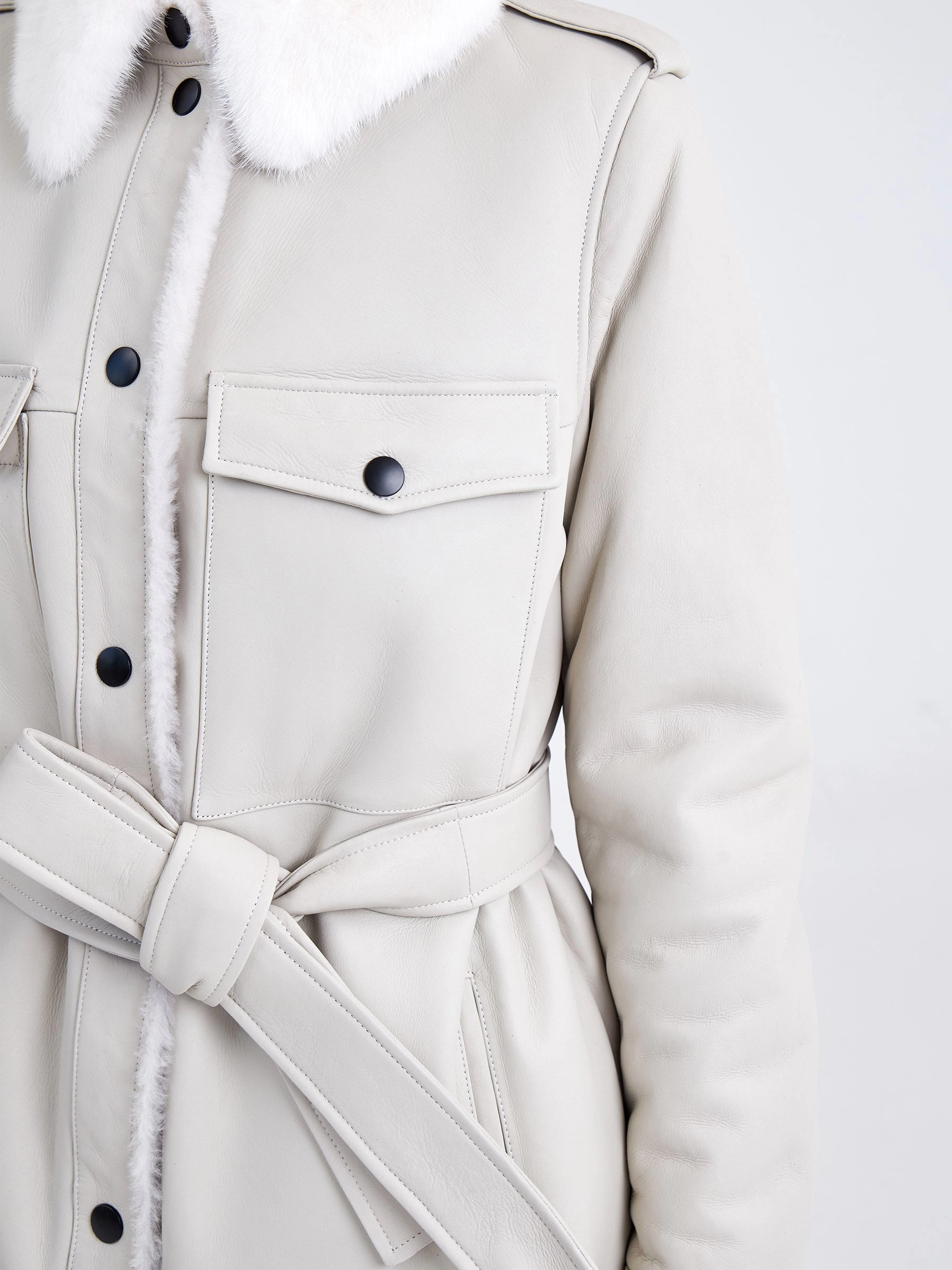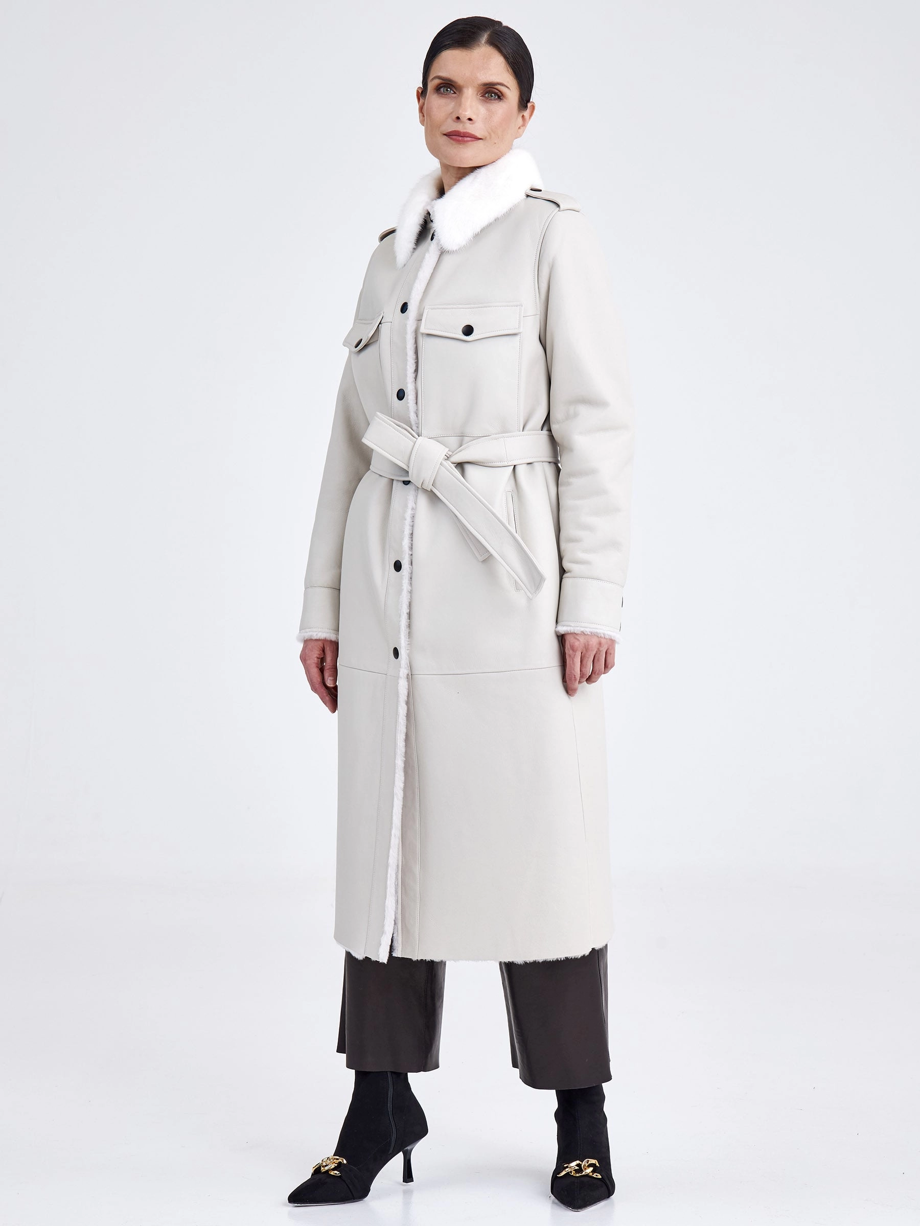 Эта удлинённая дублёнка (свыше 90 см) — современная интерпретация джинсовой рубашки, выполненная из мягкой и плотной овчины «мерино». Она идеально подходит для повседневной носки осенью и зимой. Модель с прямым силуэтом и втачными плечами имеет расслабленную, но аккуратную посадку. Внешняя сторона выполнена из гладкой кожи, а внутренняя — из тёплого меха той же овчины, что обеспечивает отличную терморегуляцию без использования подкладки. Ключевые детали, позаимствованные у рубашки: отложной воротник, отделанный нежной густой норкой, манжеты на рукавах, а также нагрудные и боковые карманы для практичности. Застёжка на кнопки делает носку удобной, а универсальный крой позволяет легко сочетать модель с любой одеждой и обувью — от джинсов до платьев.