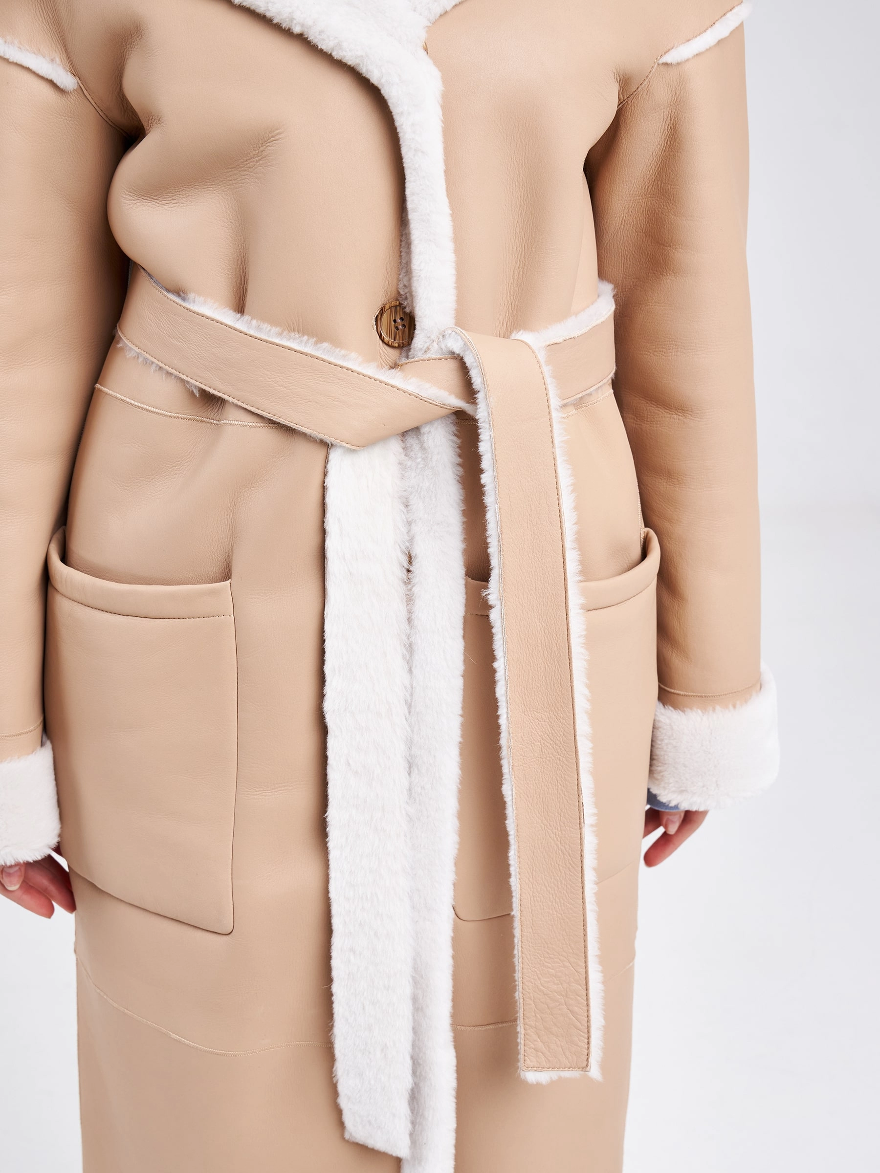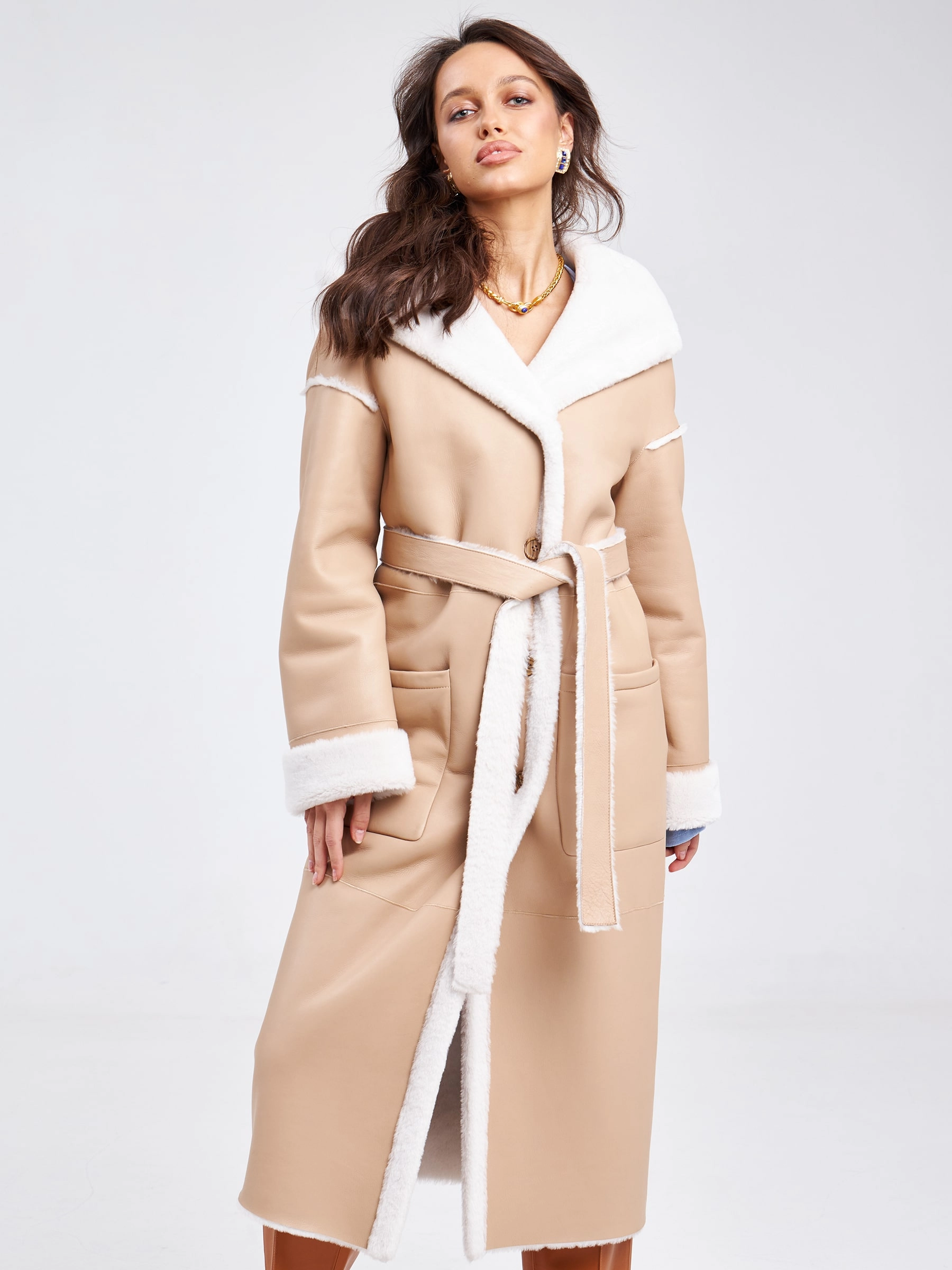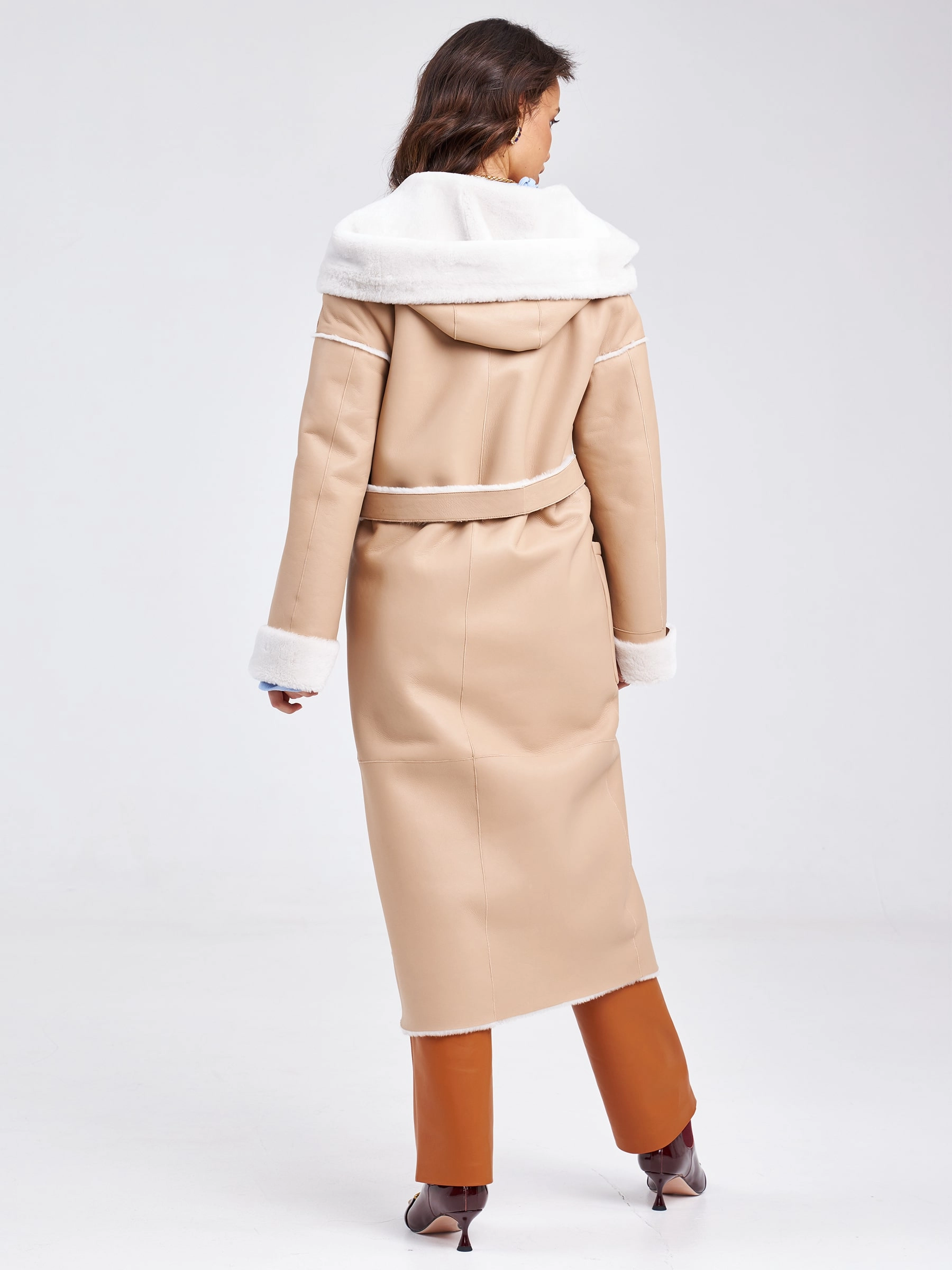 Длинная женская дубленка оверсайз с капюшоном премиум класса 2008, бежевая, размер 44, артикул 62610