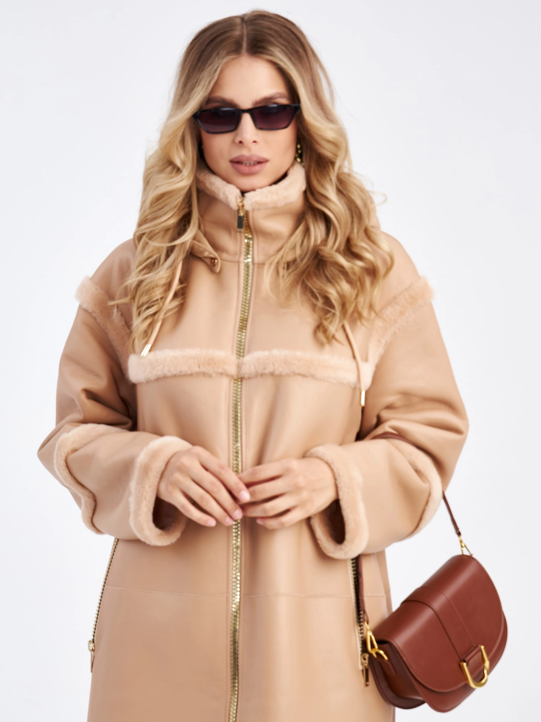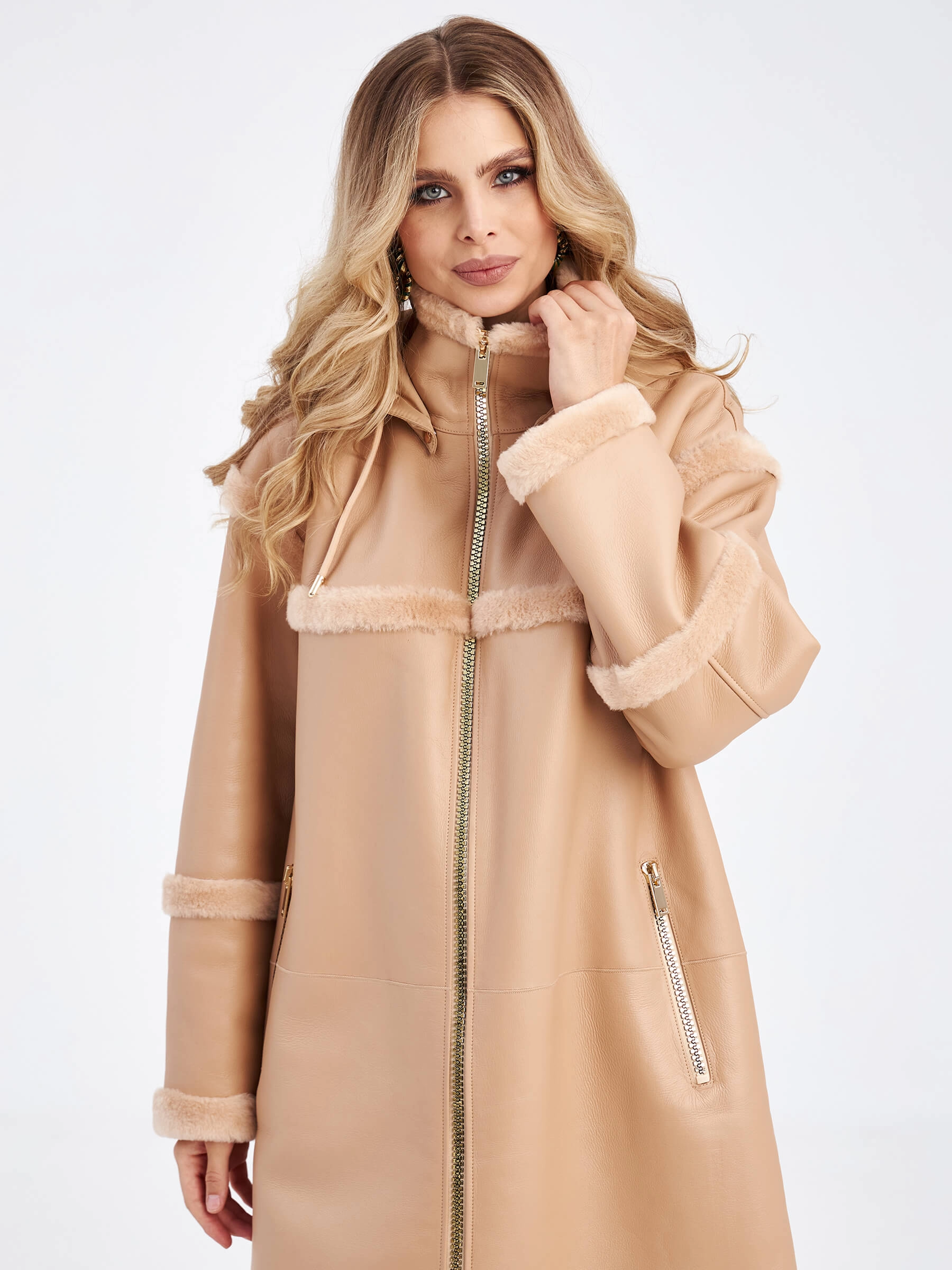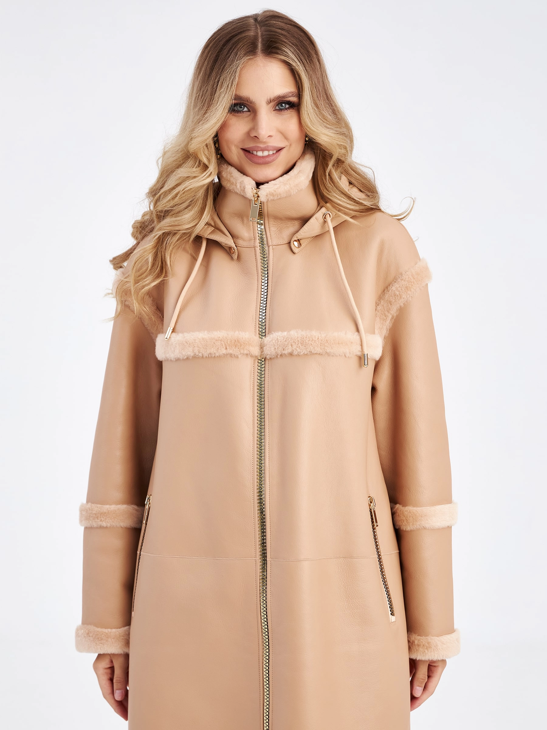 Товар женская дубленка на молнии с капюшоном премиум класса 2024, бежевая, размер 46, артикул 63060 выполнен из овчина "мерино" с застежкой молния. Рассчитан на сезон: осень-зима. Длина изделия свыше 90 см, силуэт прямой.