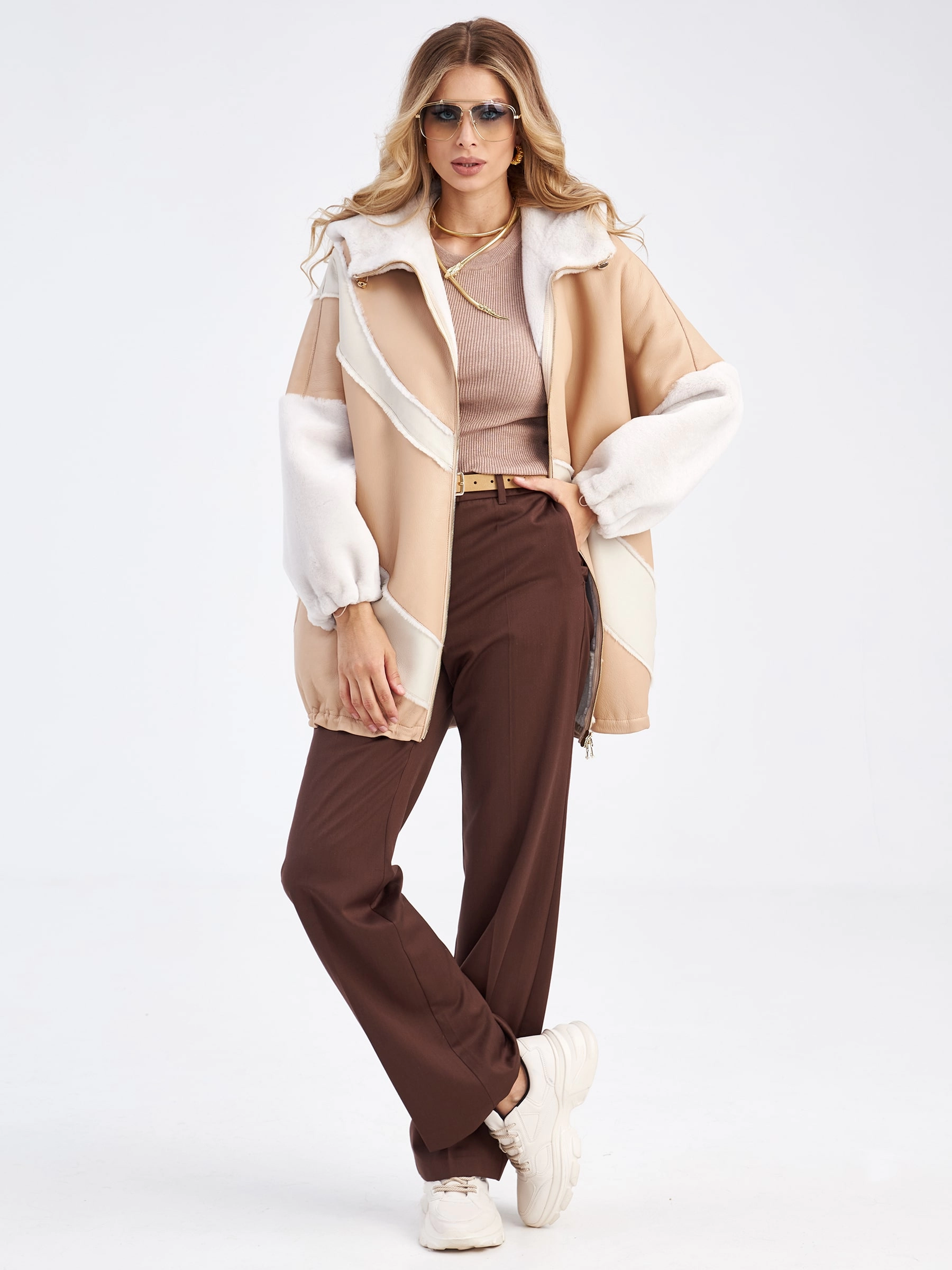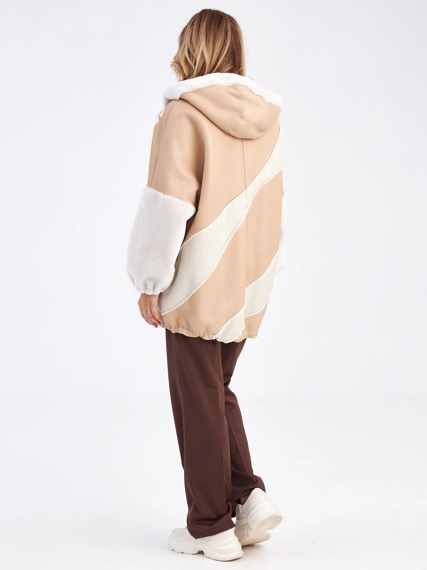 Модель свободного кроя мастера выполнили из нежного и легкого меха ягненка. Изделие комбинировали широкими полосами молочного цвета под разным углом. На новый уровень овчину деликатного бежевого цвета вывела контрастная меховая отделка на рукавах. Для дополнительной защиты от холода и ветра предусмотрен объемный капюшон, регулирующийся кулисками.