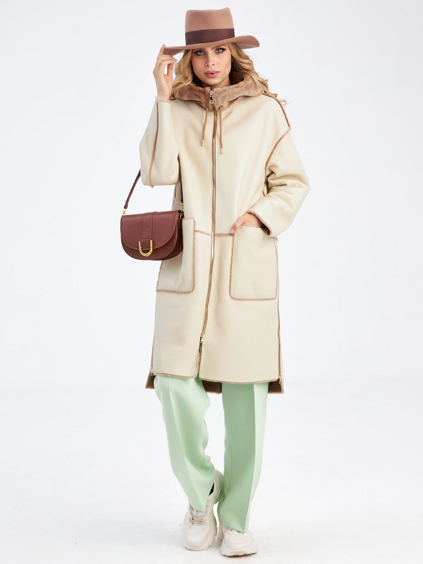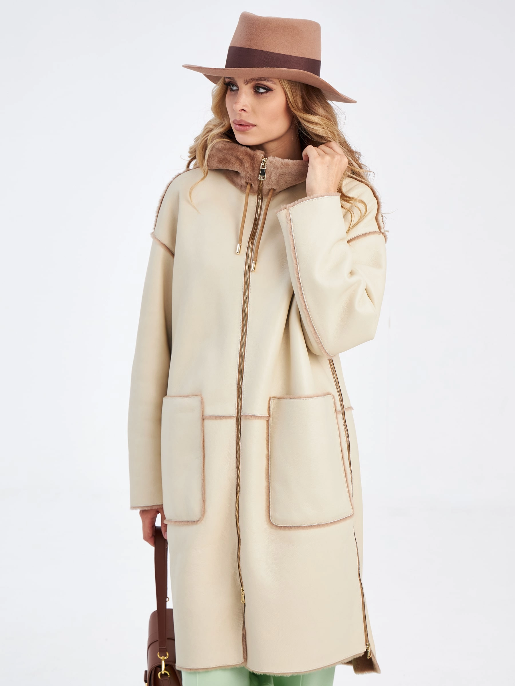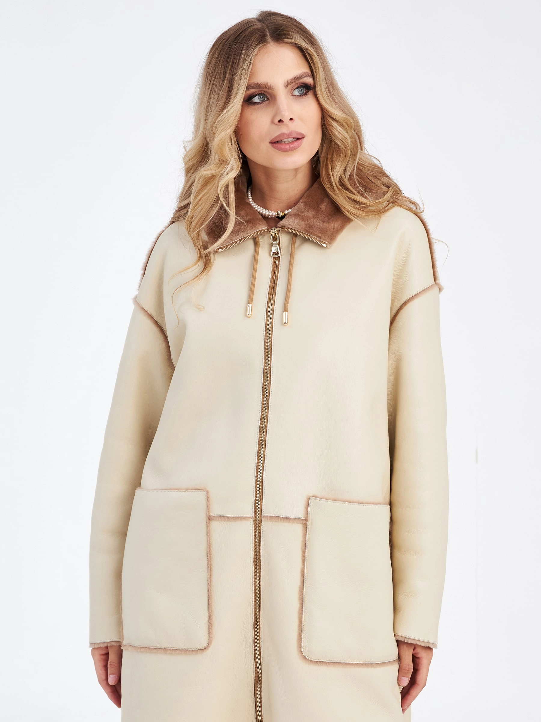 Удлиненная женская дубленка с капюшоном премиум класса 2037, бежевая, размер 42, артикул 62920