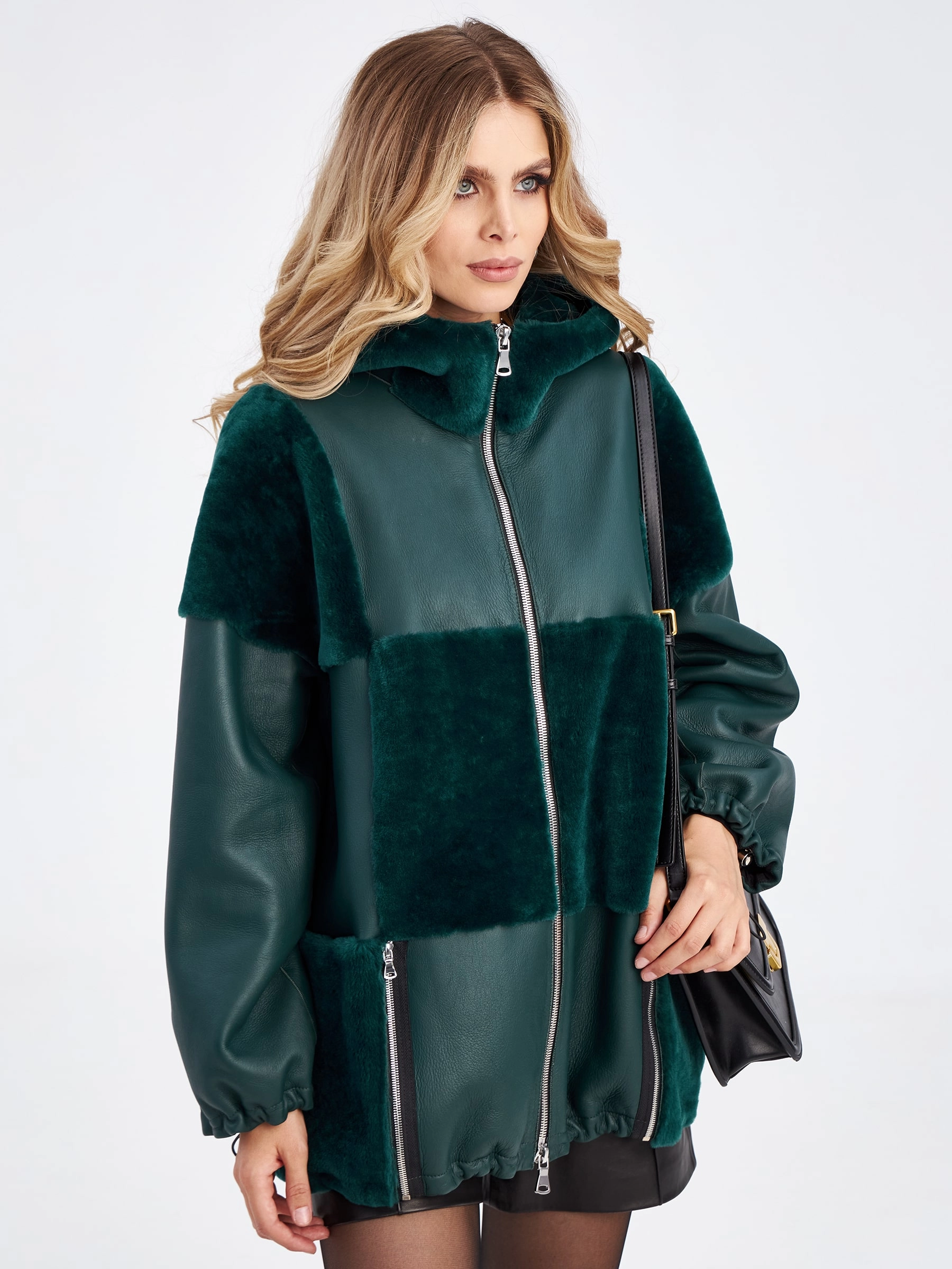 Товар короткая комбинированная женская дубленка с капюшоном премиум класса 2039, зеленая, размер 42, артикул 62940 выполнен из овчина "мерино" с застежкой молния. Рассчитан на сезон: осень-зима. Длина изделия 74 см, силуэт прямой.
