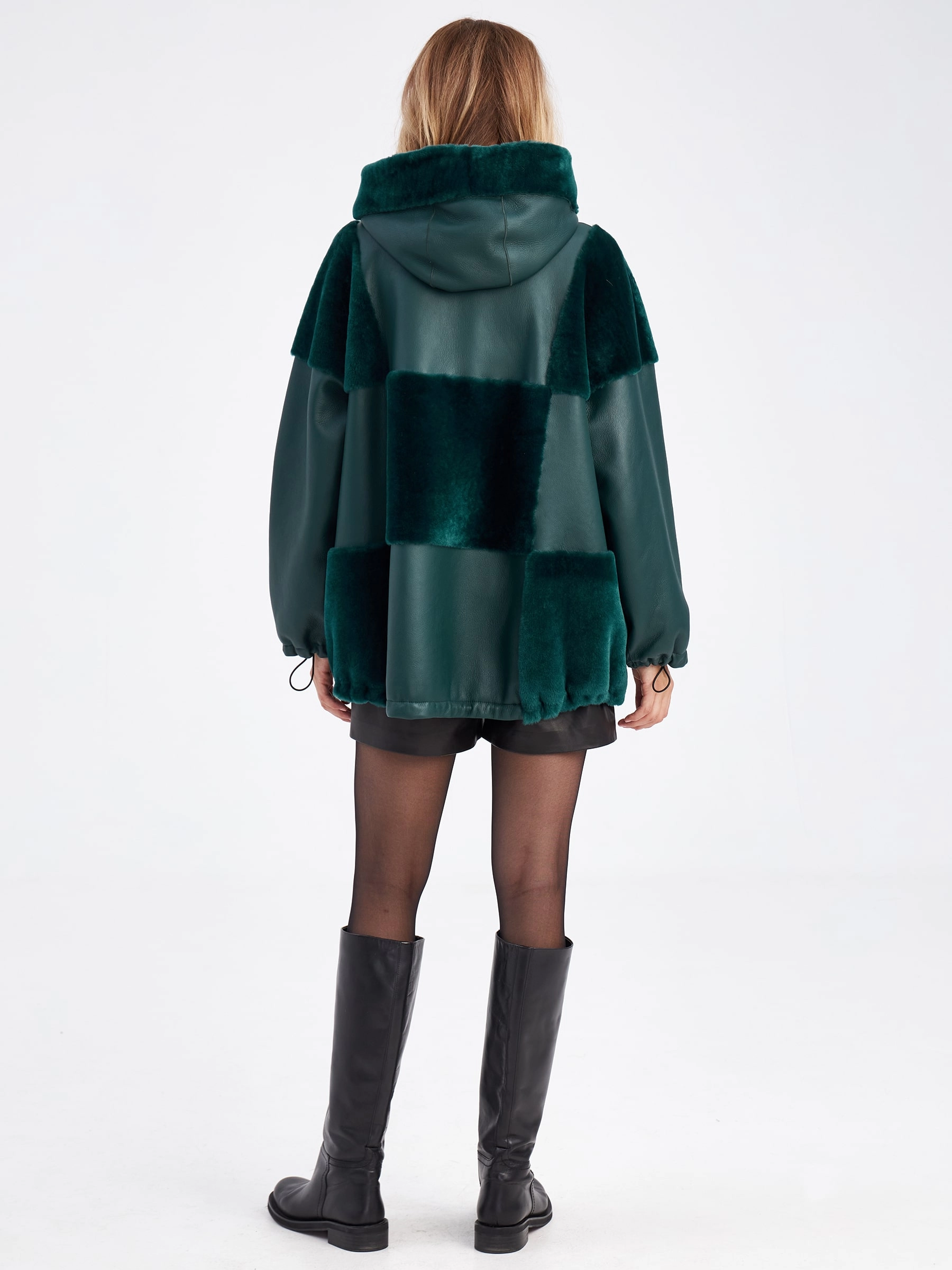 Зеленая короткая дубленка свободного кроя - удачный пример исключительно комфортной одежды для холодной погоды. Модель выполнили в комбинации овчины с меховой и кожаной поверхностью. За счет плотности меха, изделие великолепно сохраняет тепло. За защиту от ветра отвечает глубокий капюшон. Акцент сделали на накладные карманы дополненные декоративными крупными молниями.