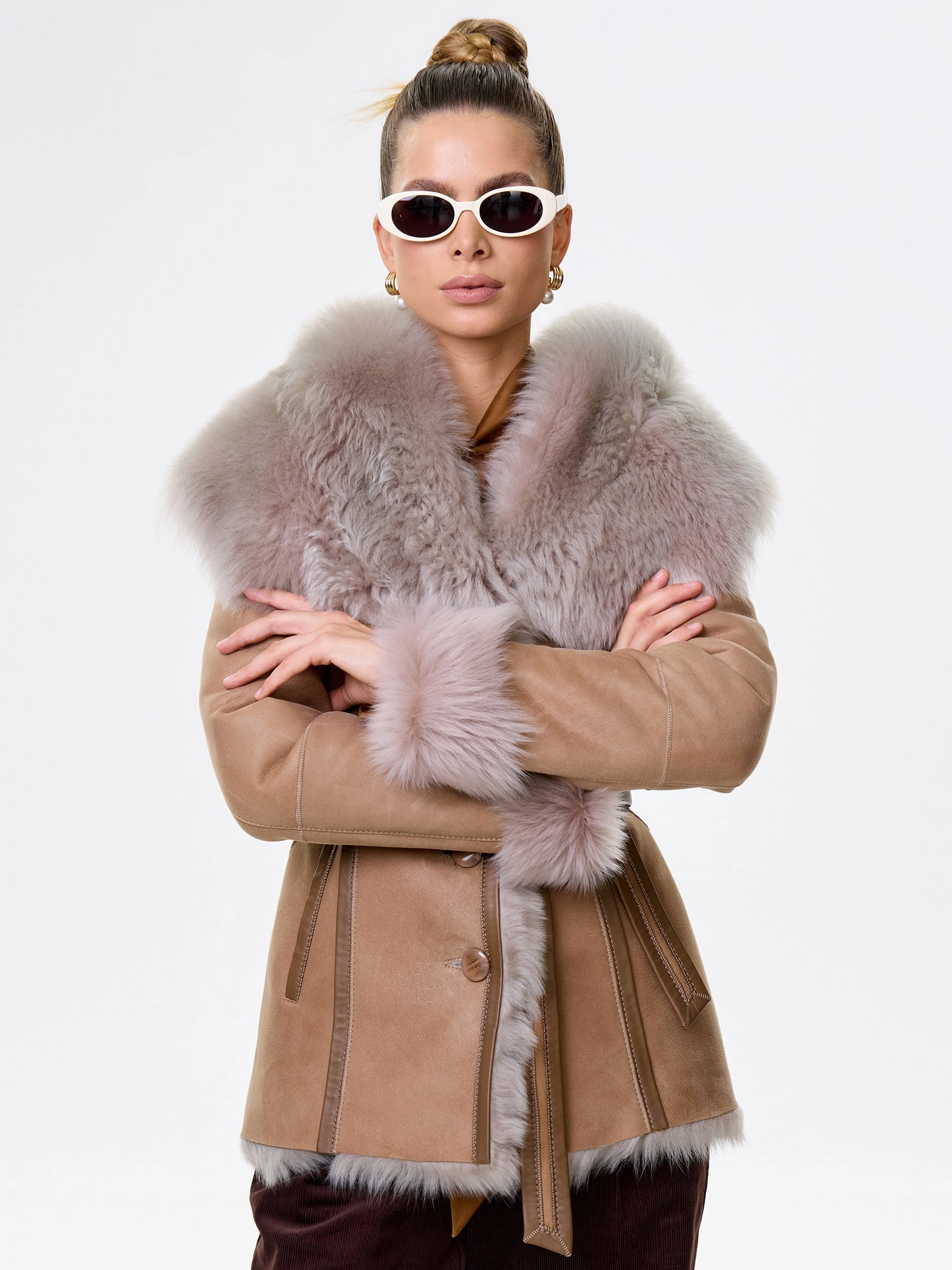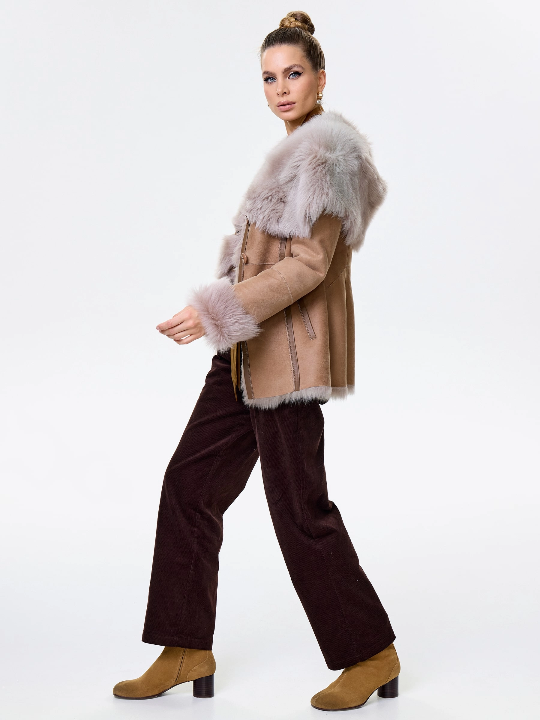 Идеальная полуприлегающая модель премиум-класса: невероятно густой мех тосканской овчины согреет в лютый мороз, а глубокий капюшон-трансформер эффектно завернёт вас в уют или элегантно ляжет шалью на плечи. Защитное покрытие убережёт от царапин, кожаная отделка карманов и борта добавит статусности, а регулируемые манжеты и боковые карманы обеспечат комфорт. Идеальная посадка по фигуре, продуманные швы и длинный пояс подчеркнут силуэт — сочетайте с джинсами, объёмными свитерами или тёмными платьями для дерзкого зимнего образа! Преимущество: короткая длина, полуприлегающий крой - это мобильность для города и элегантность для вечера.